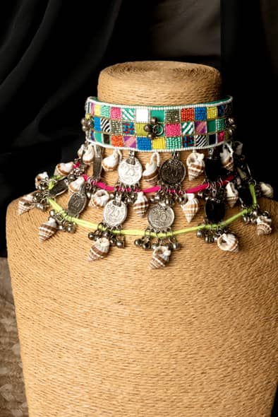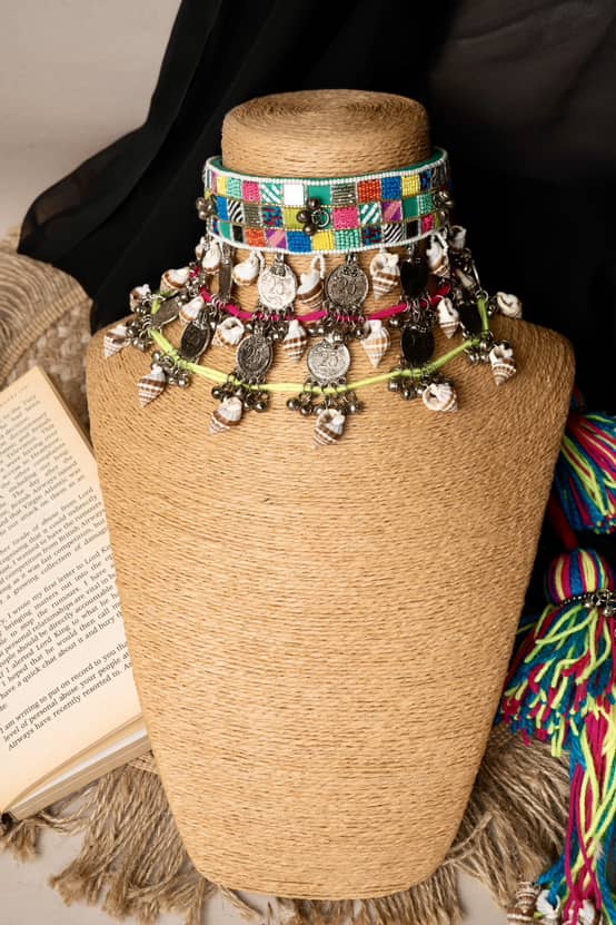 Marine is handcrafted choker embellished with metal coins and sea shells which adds complete bohemian look with vacation jewellery vibes with its popping colours for summer .