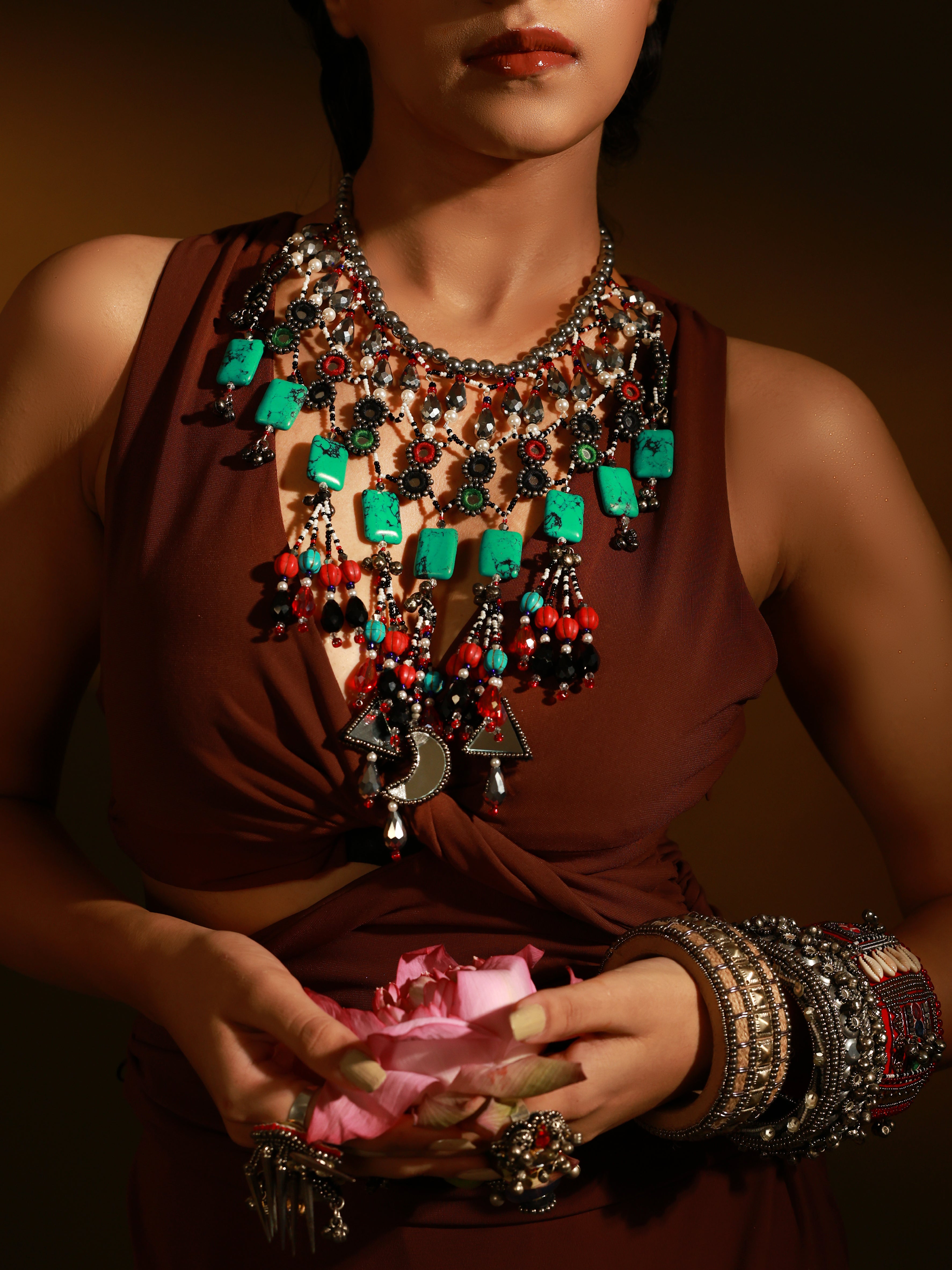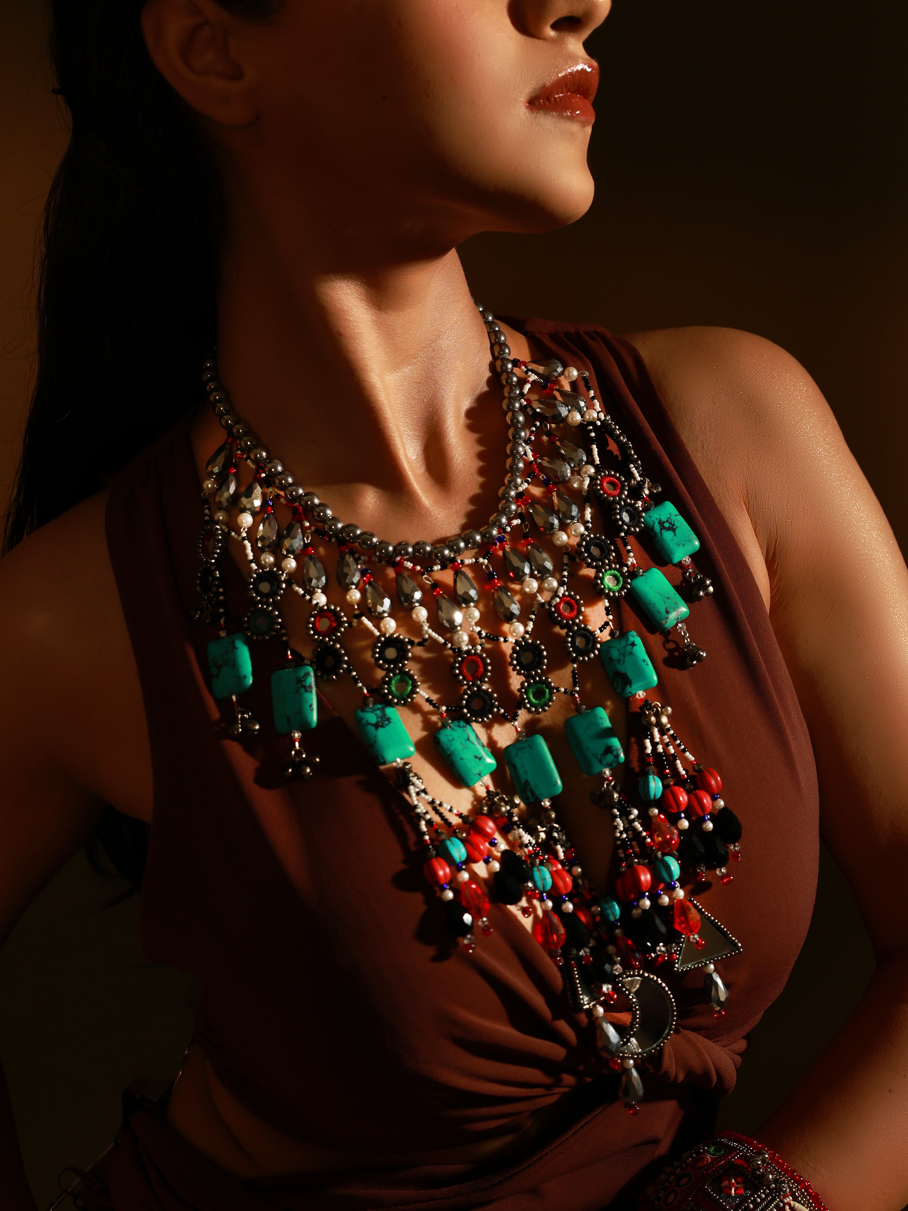 Discover the exquisite Masai Necklace from the KABILA collection—an enchanting statement piece that redefines elegance. Handcrafted with meticulous artistry, this luxurious necklace features shimmering metallic crystals, reflective mirrors, and an array of natural stones, creating a mesmerizing interplay of textures. Ideal for the discerning jewelry connoisseur, the Masai Necklace effortlessly enhances any ensemble, whether you're gracing a glamorous event or indulging in a chic getaway. Elevate your collection with this captivating treasure that is sure to turn heads. This piece is a must-have for every jewelry hoarder looking to make a bold statement.