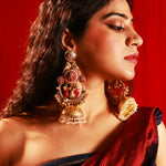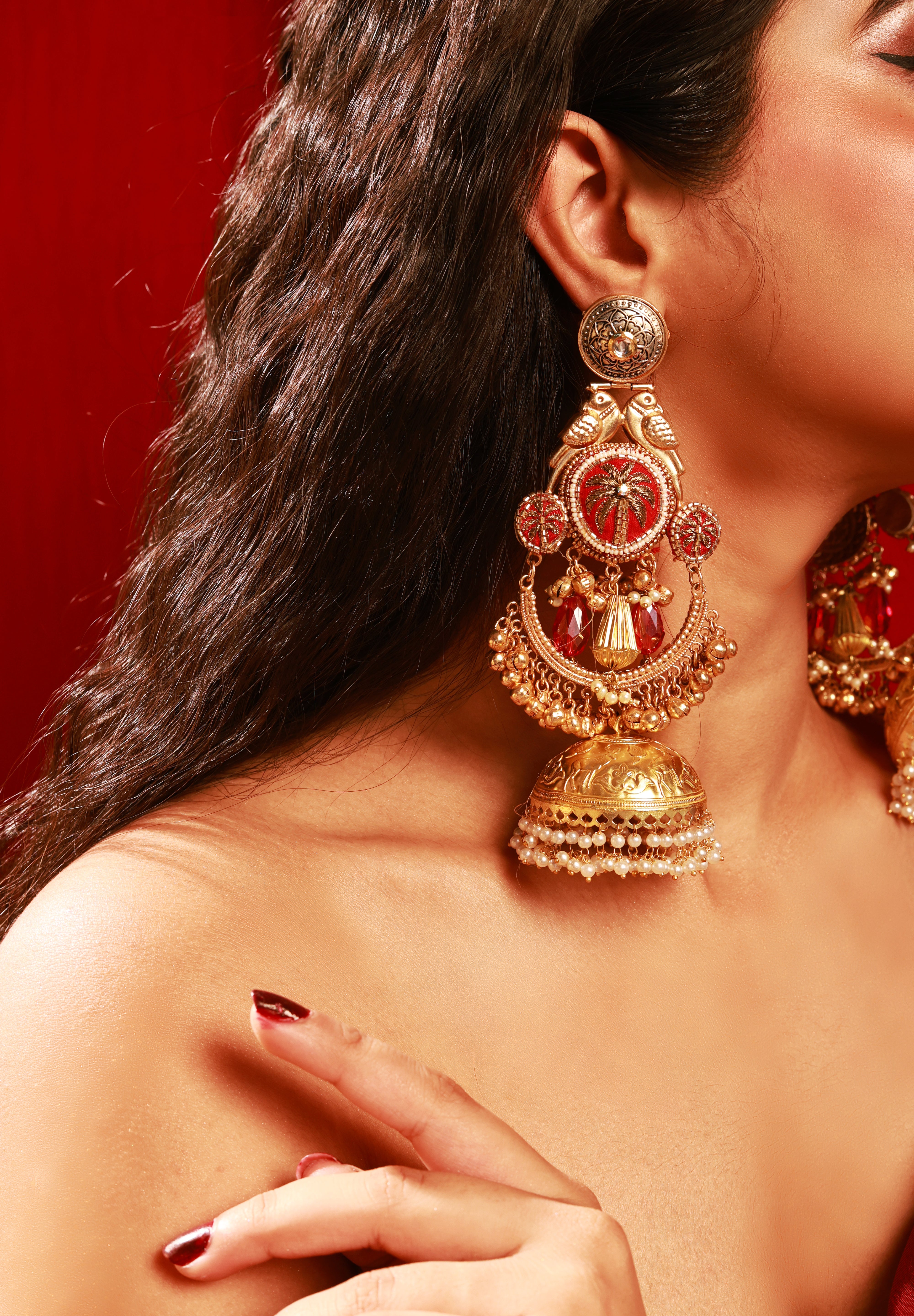 Mehrooz jhumka is handcrafted brass embellished with ghungroos , and a modern fusion jhumka with handembroidered work and intricate detail on it , with nakshi and zardozi handwork which makes it standout with jhumka engeaved with deer and birds motifs.