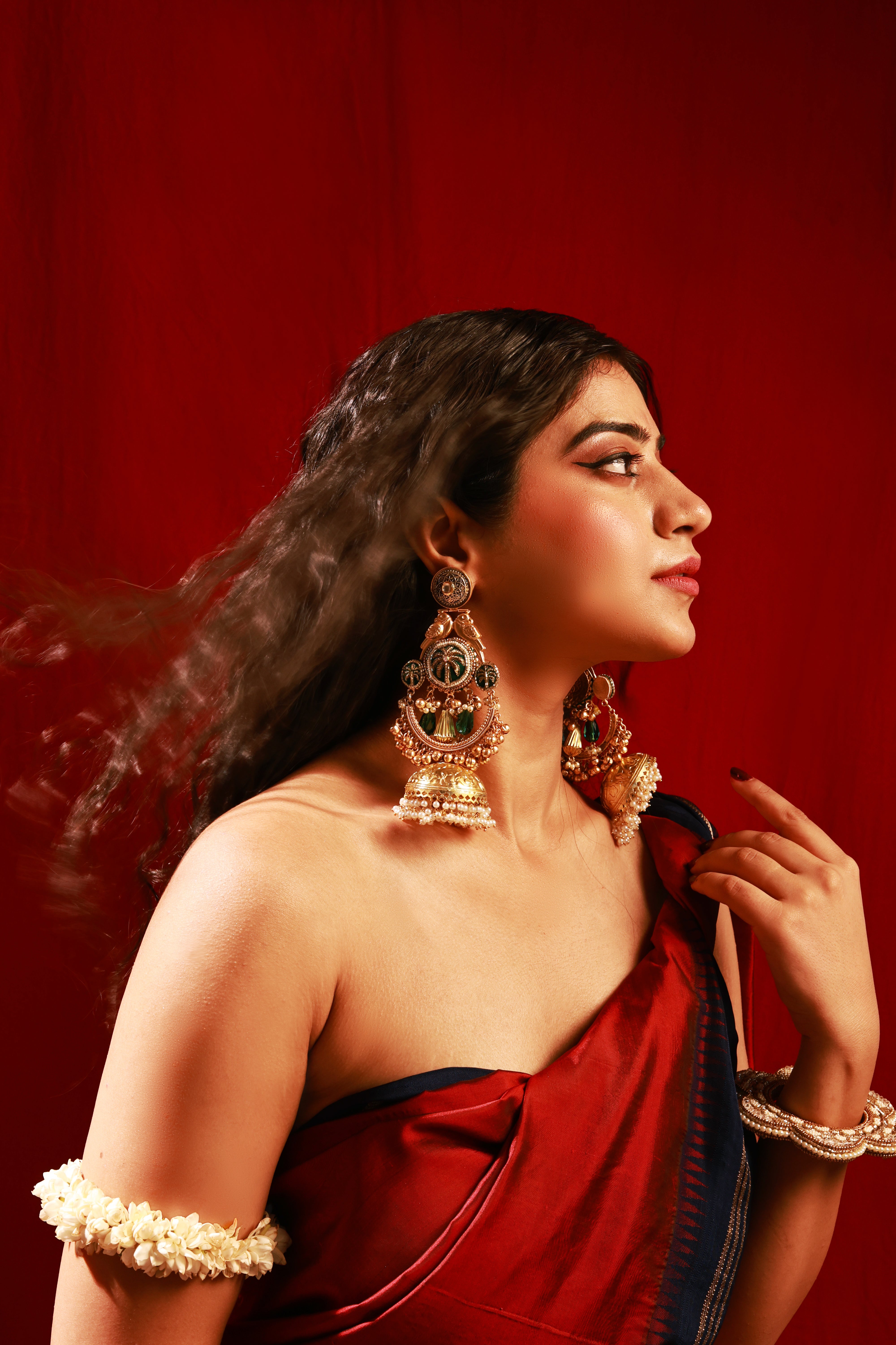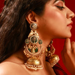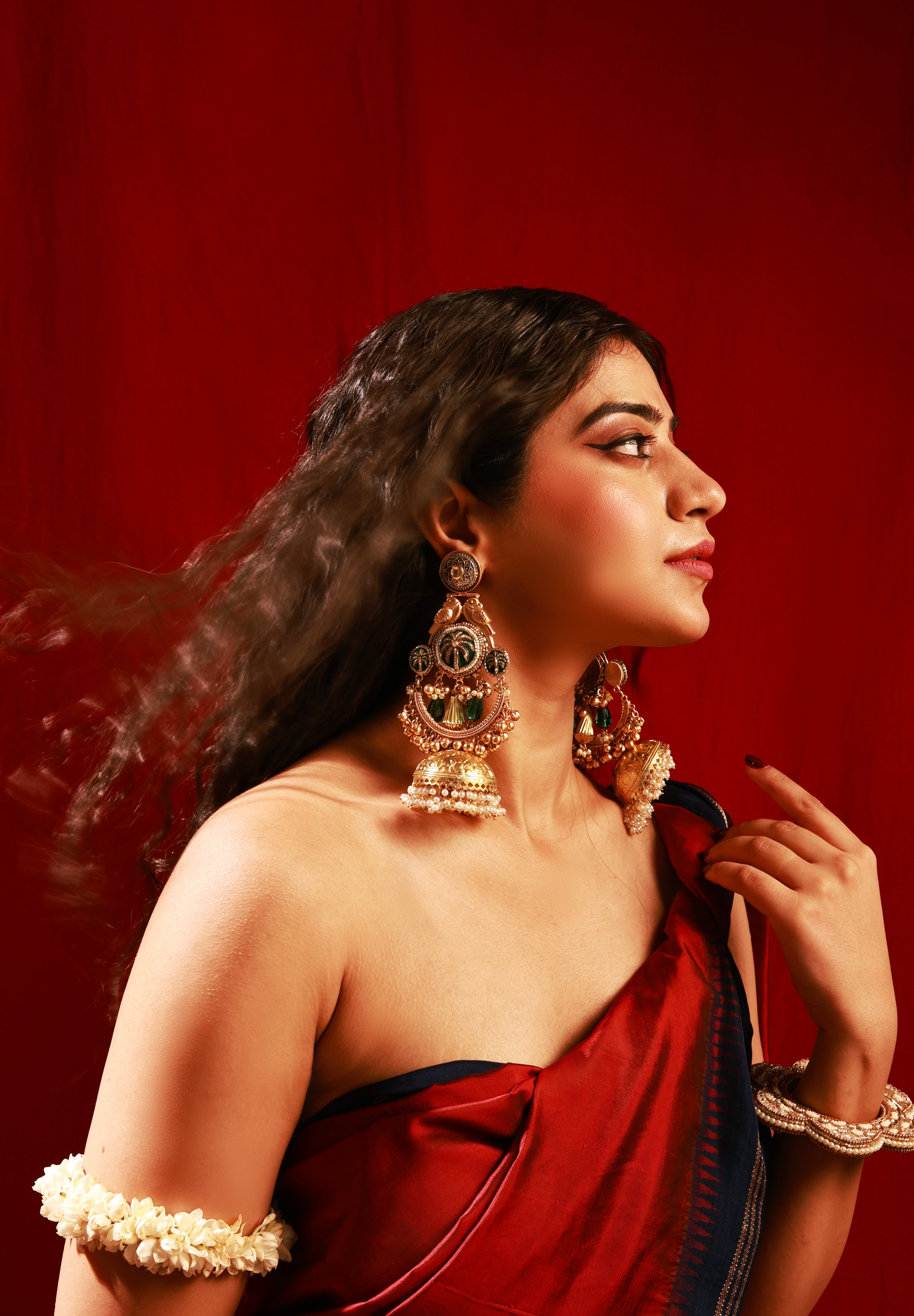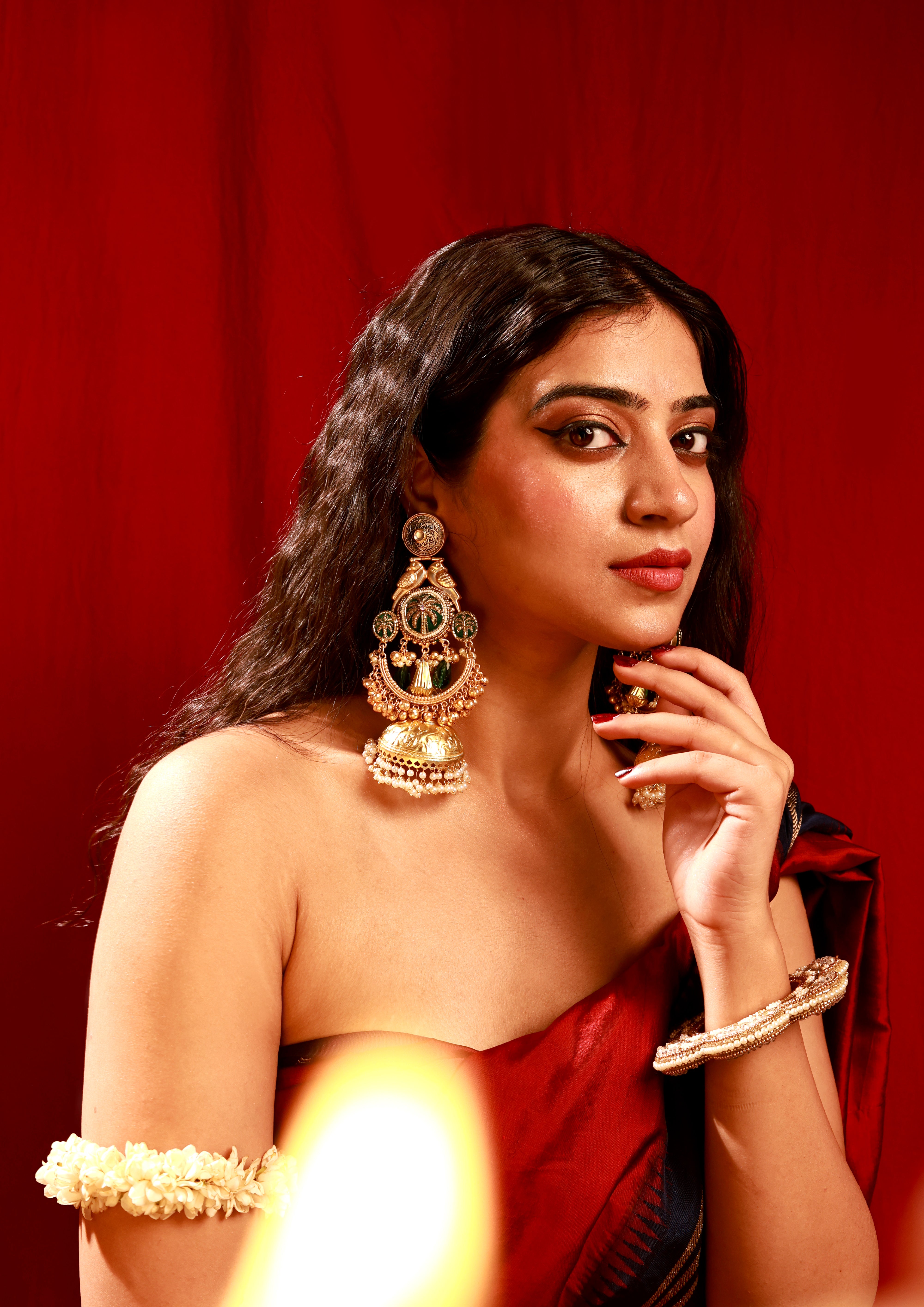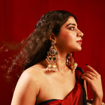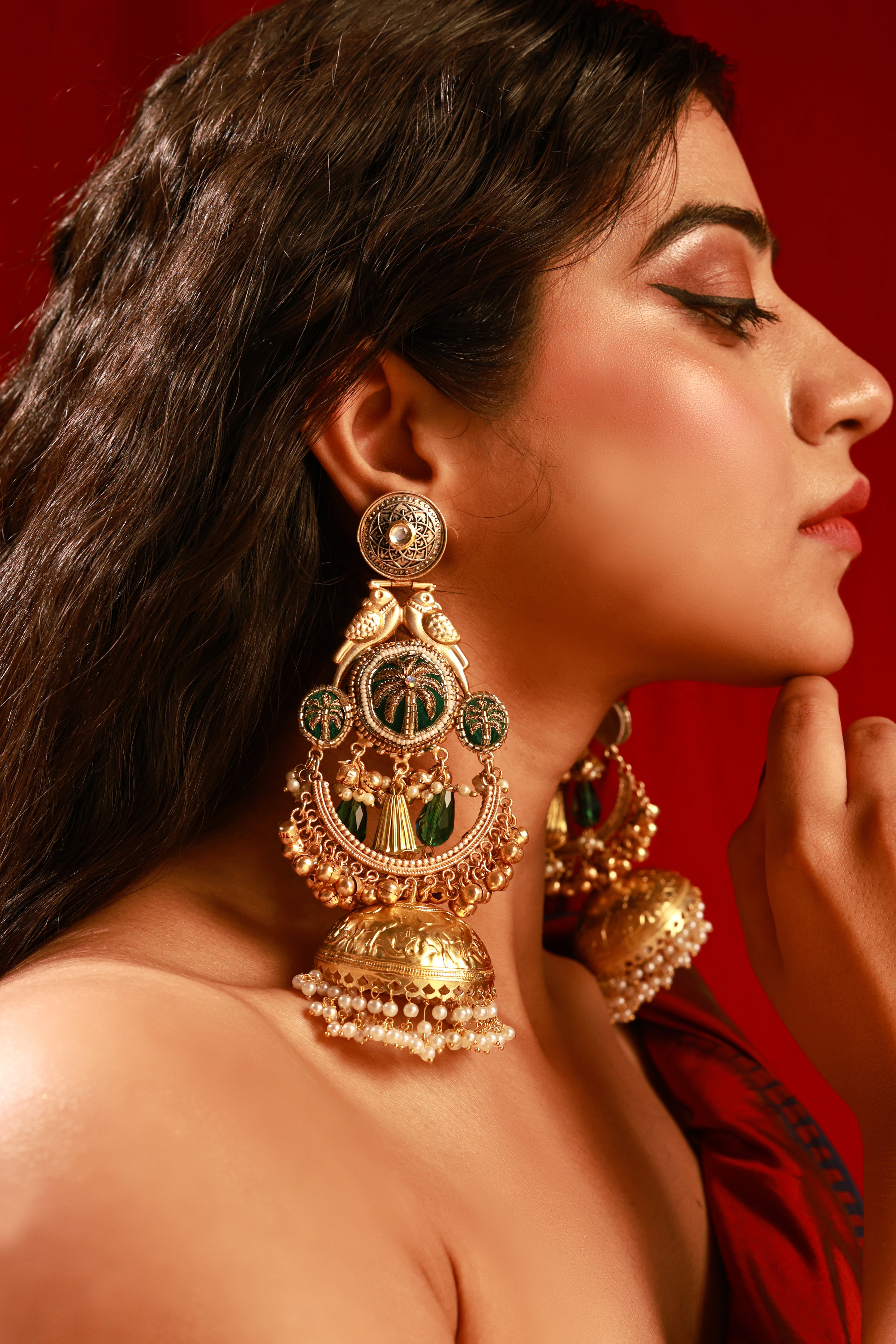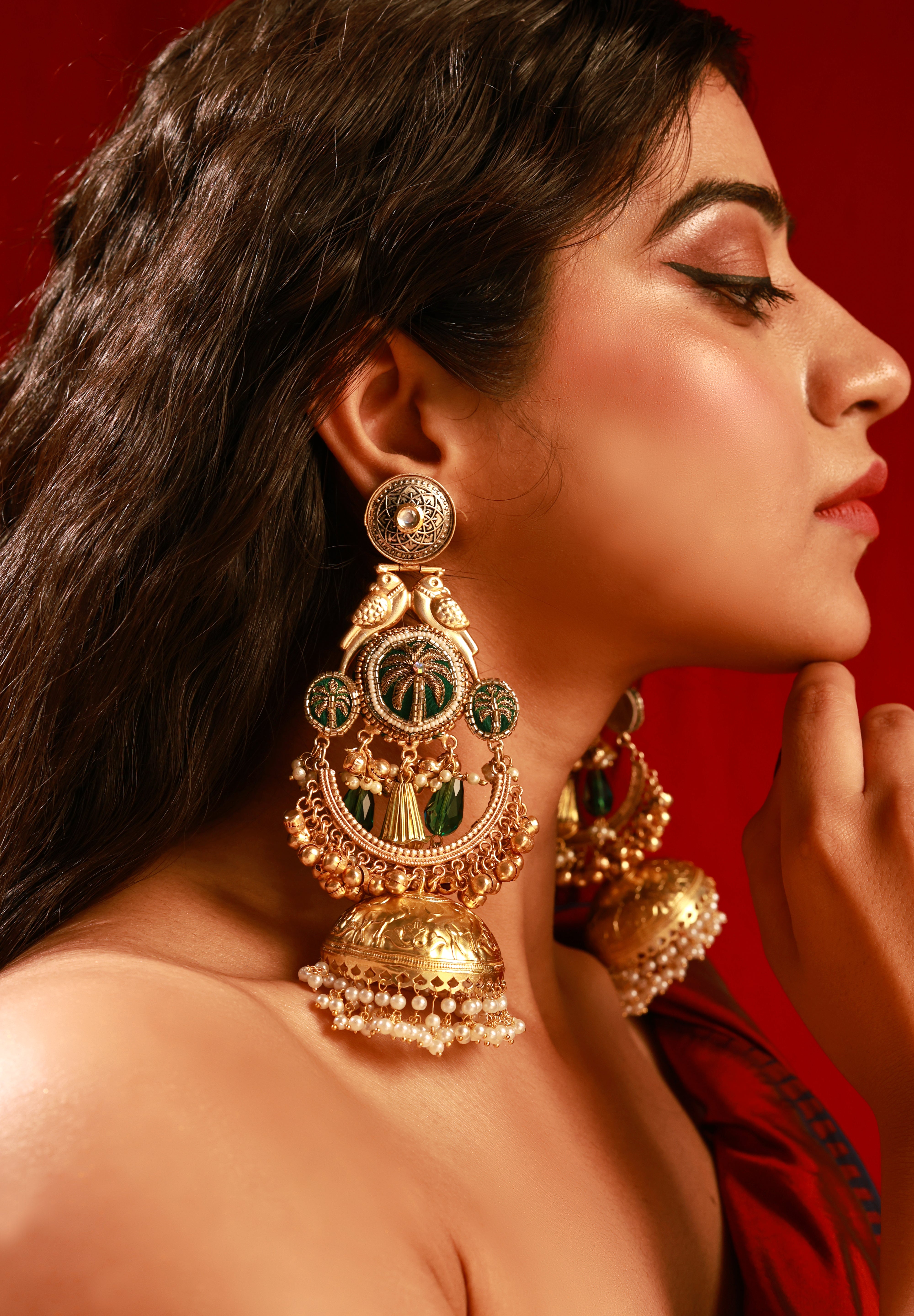 Mehrooz jhumka is handcrafted brass embellished with ghungroos , and a modern fusion jhumka with handembroidered work and intricate detail on it , with nakshi and zardozi handwork which makes it standout with jhumka engeaved with deer and birds motifs.