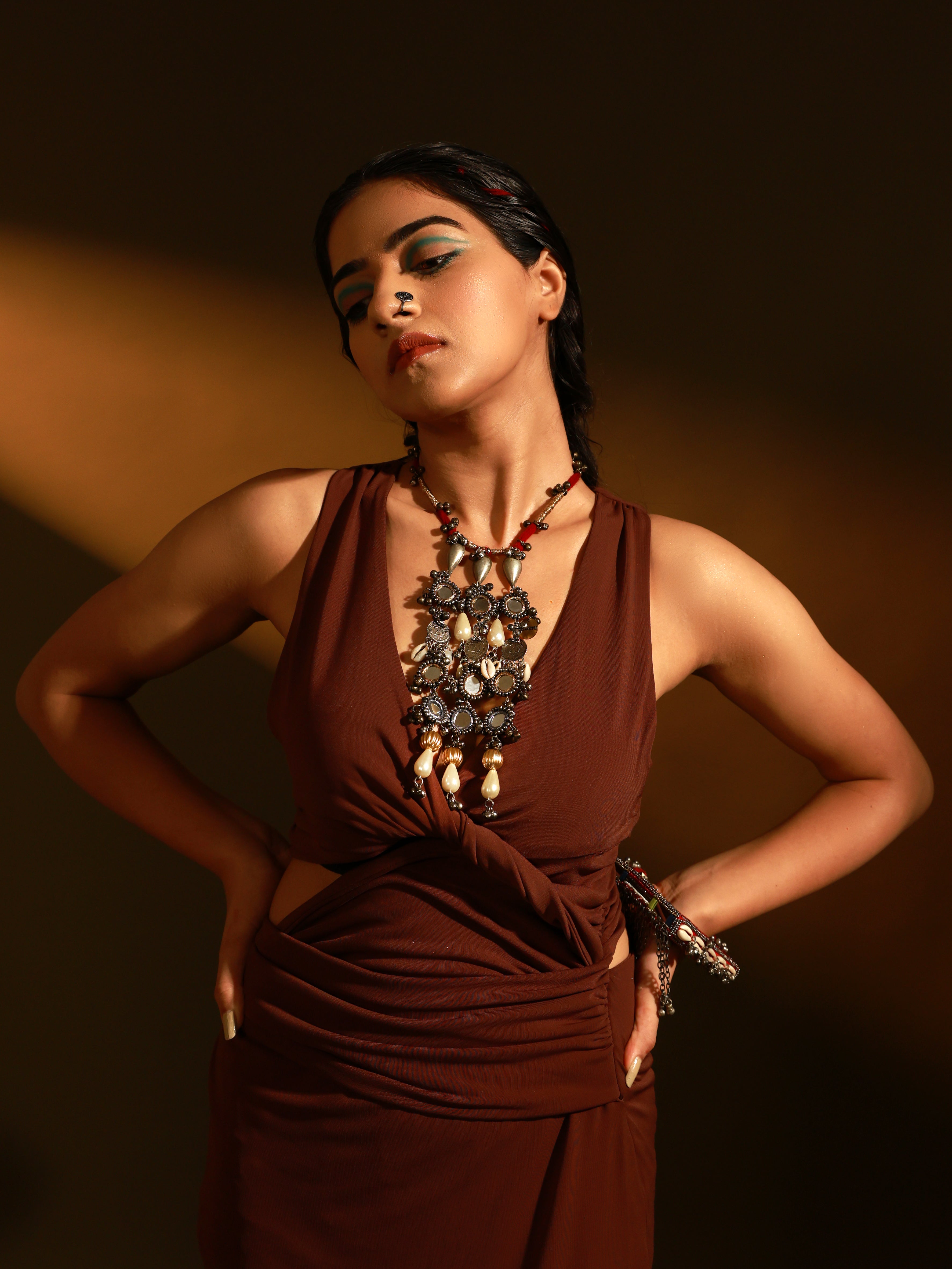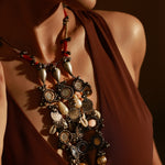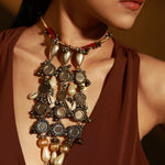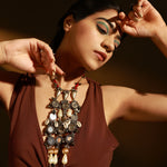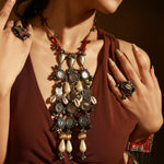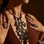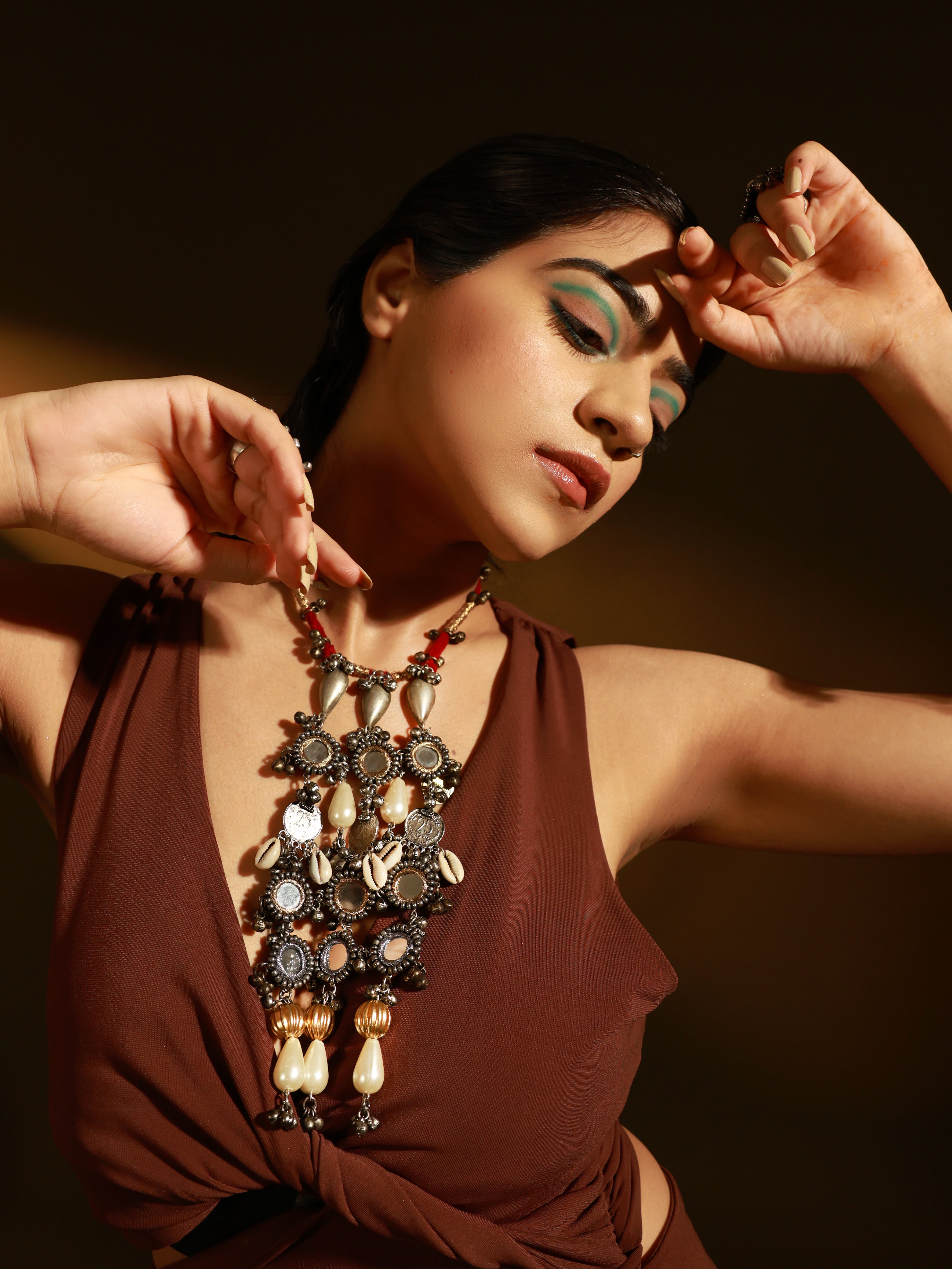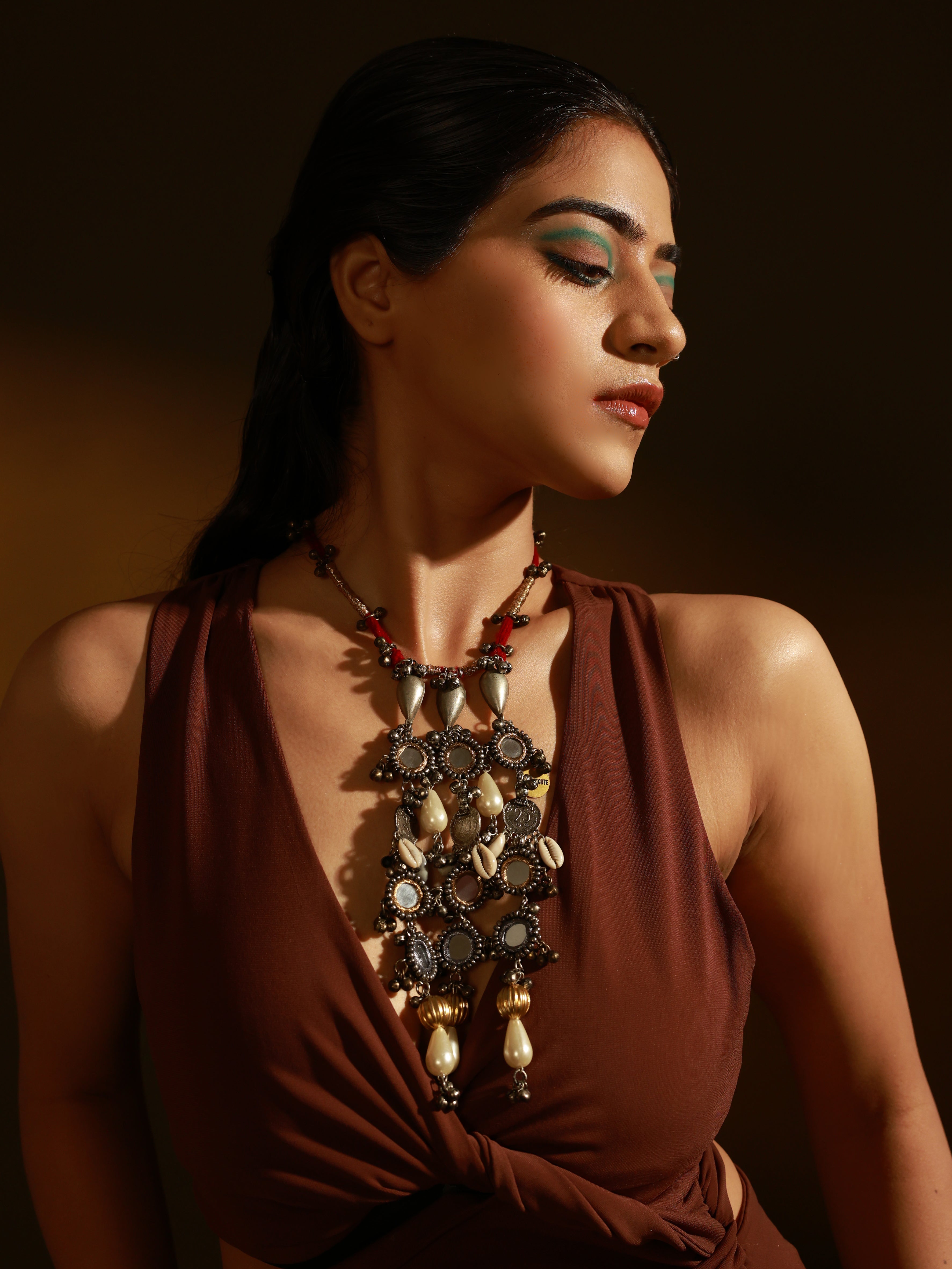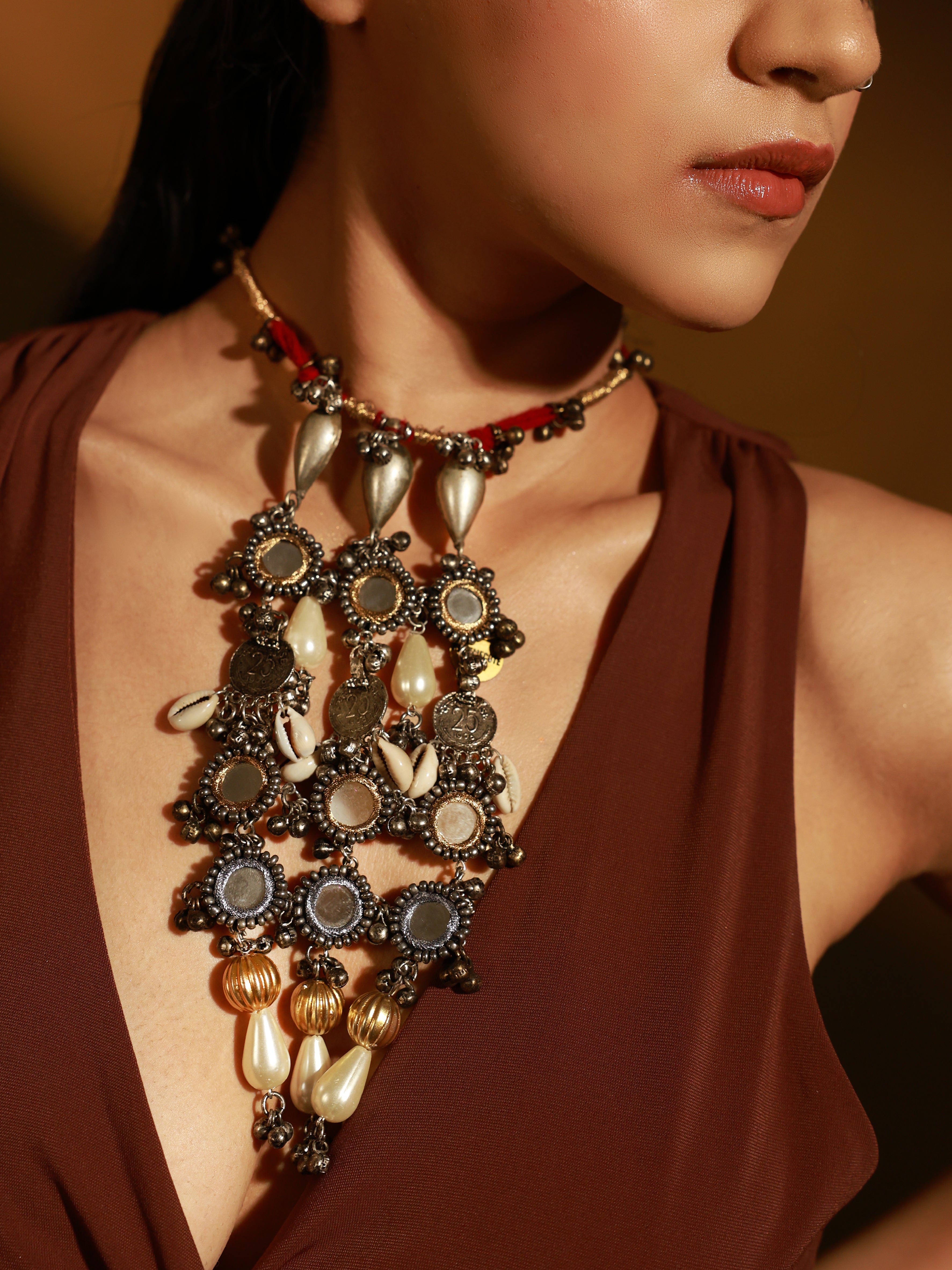 Introducing the Minar Necklace from house of Knotmecute a handcrafted masterpiece that beautifully blends modern style with Indian heritage. This striking piece features mirror embellishments, metal charms, and vintage oxidized accents, all delicately hand-wrapped in wool. The combination of pearls and unique charms creates an heirloom quality, making the Minar Necklace a perfect statement accessory for any occasion. Elevate your look with this stunning fusion of tradition and contemporary elegance.