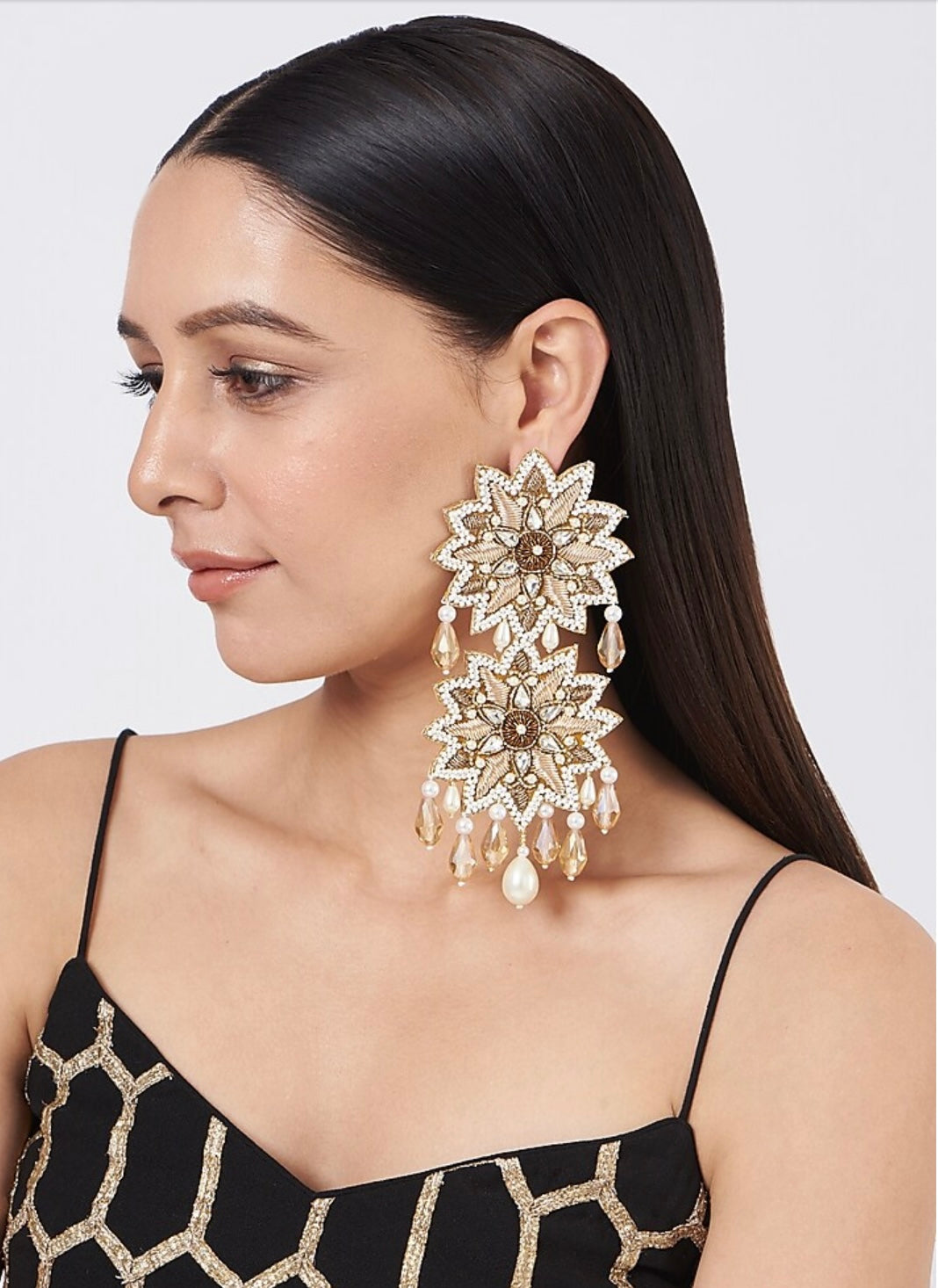 Mugdha handcrafted earrings are statement earrings with gold accents and fine crystals , beads pearls are embroidered on top in floral motif complimented with high graded lustrous crystals and pearl droplets .