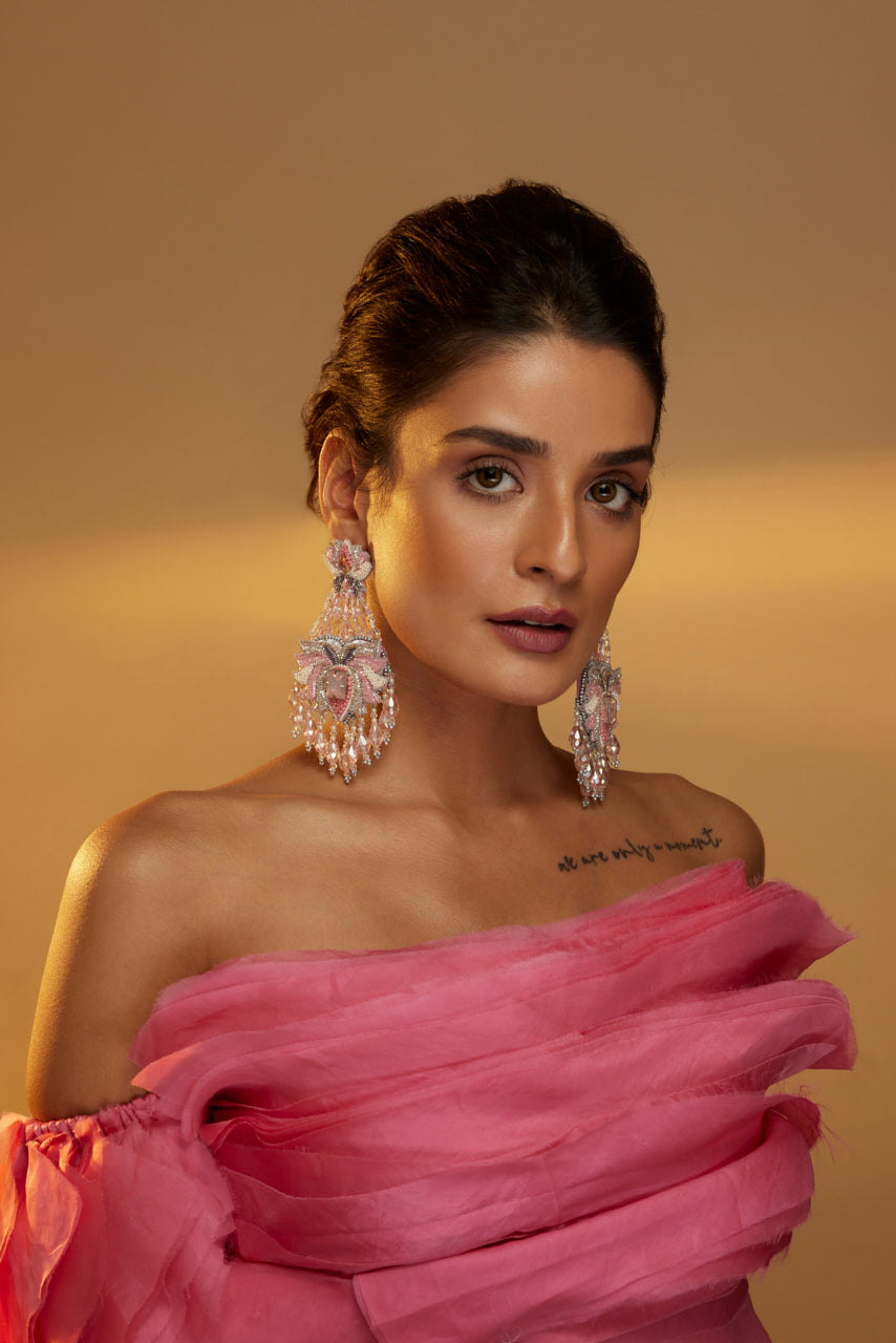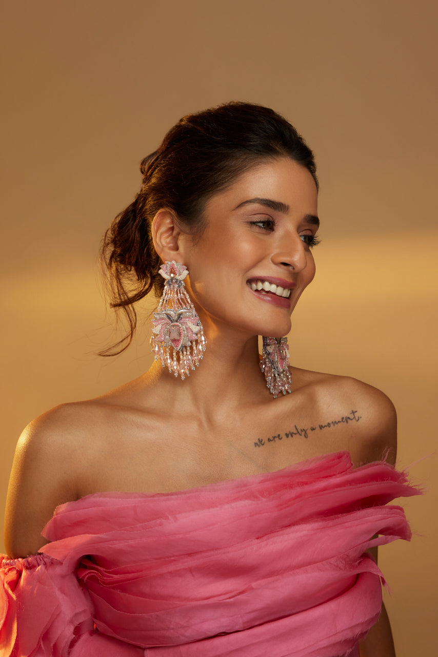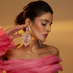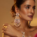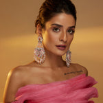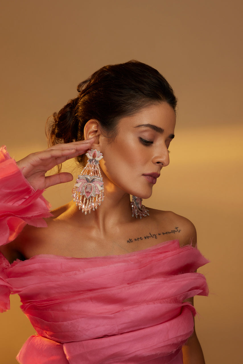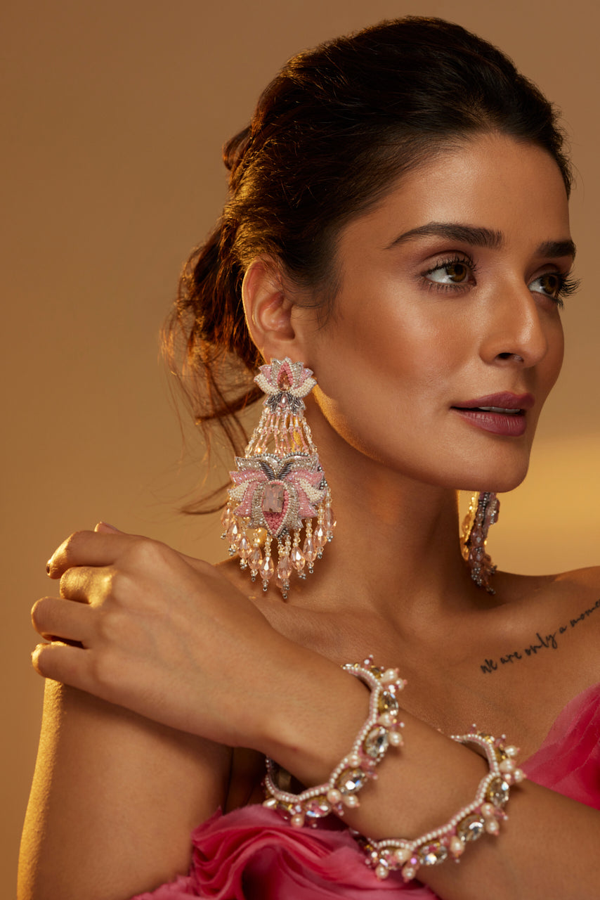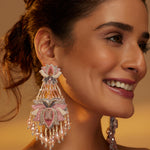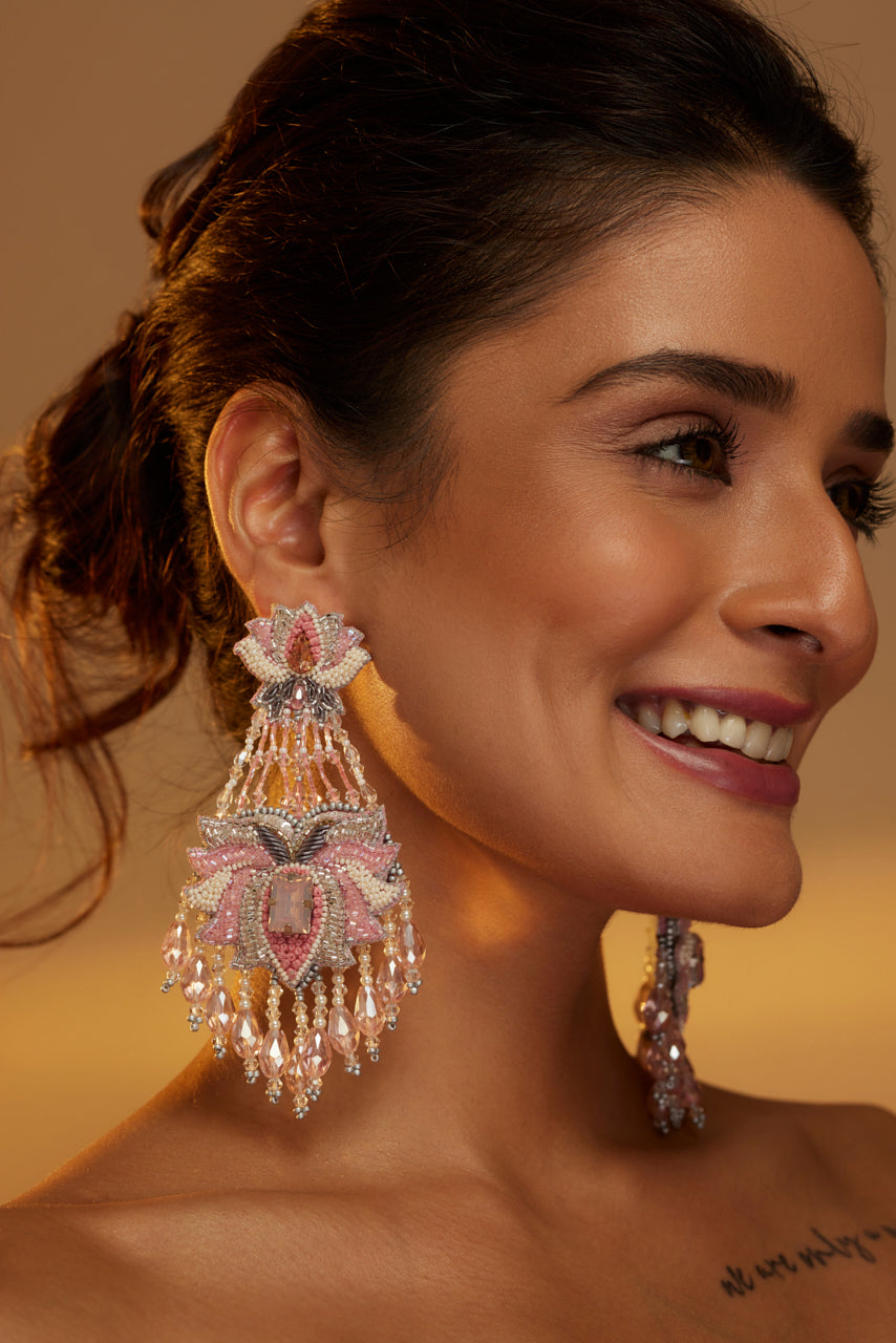 Niloufar- soft pink danglers are the perfect pick for daytime parties, designed with high-quality crystals and the unique shape of a fresh lotus. Intricate handcrafted embroidery featuring lustrous crystals and pearls.