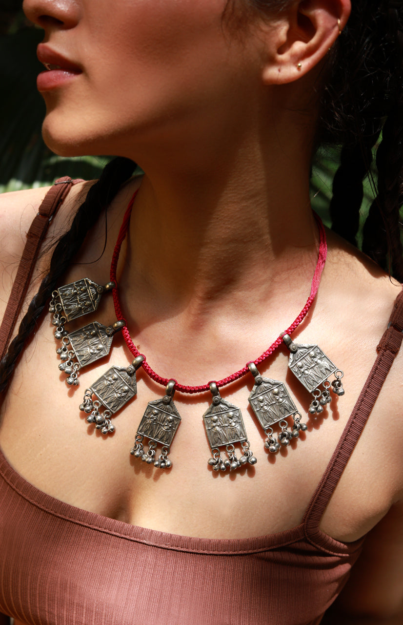 Nomada necklace pink  features antique-style silver-tone temple pendants strung on a deep red handwoven cord — evoking echoes of tribal tradition and desi power dressing. Each pendant tells a story of folk craftsmanship with rustic charm, intricate detailing, and signature ghungroo drops for that soft, soul-stirring jingle.