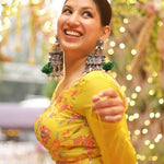 Noori green handcrafted earrings are inspired from the bohemian elements of old metal charms and colour palate of dark and bright colours which adds more grace with mirror work and tassel details, stud style earrings embellished with metallic charms of different shapes and sizes, with adding signature element of knotmecute is cowrie shells add the balance to its look .The indian elephant motif is crafted in centre of the earrings with fine detailing.