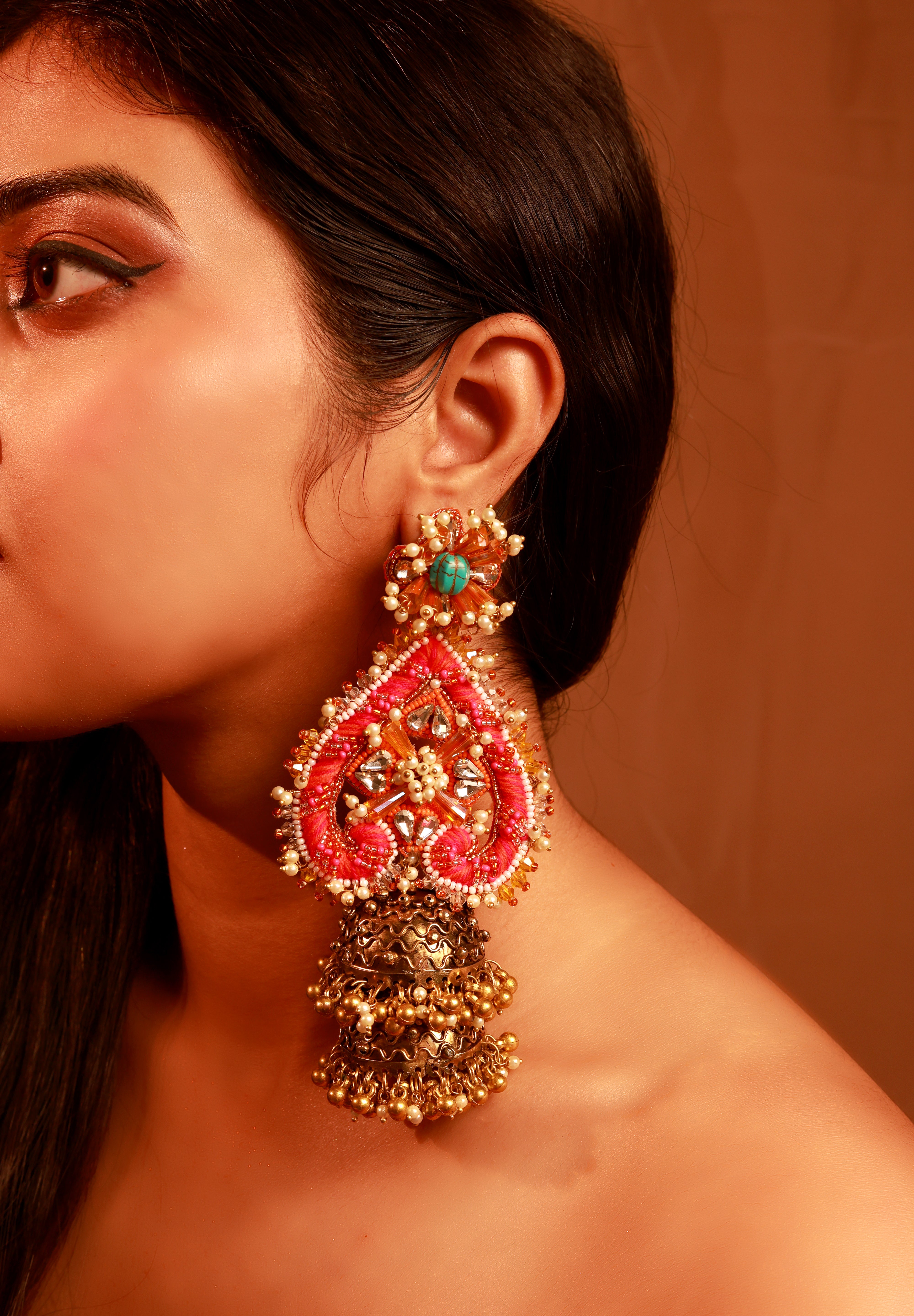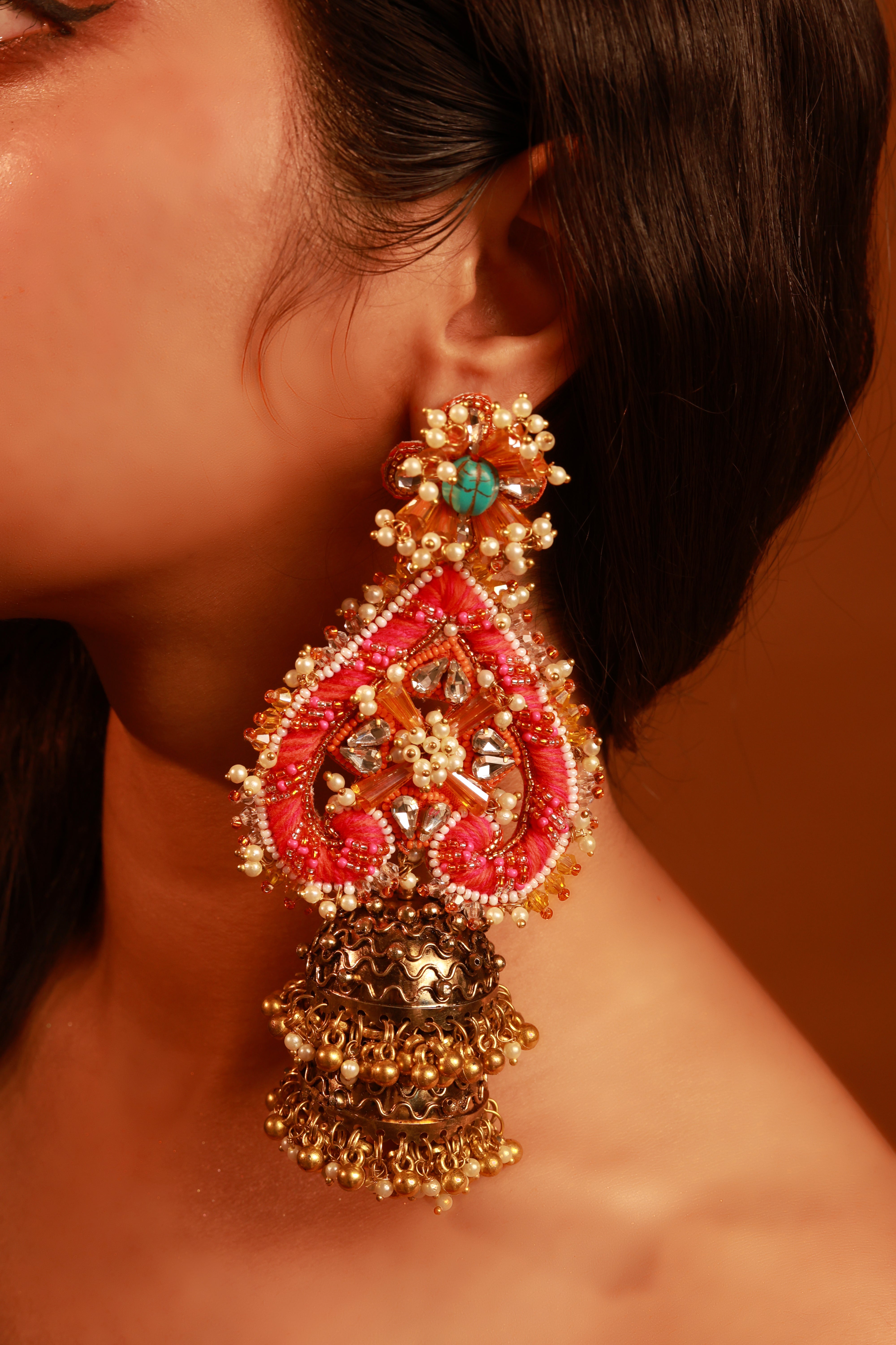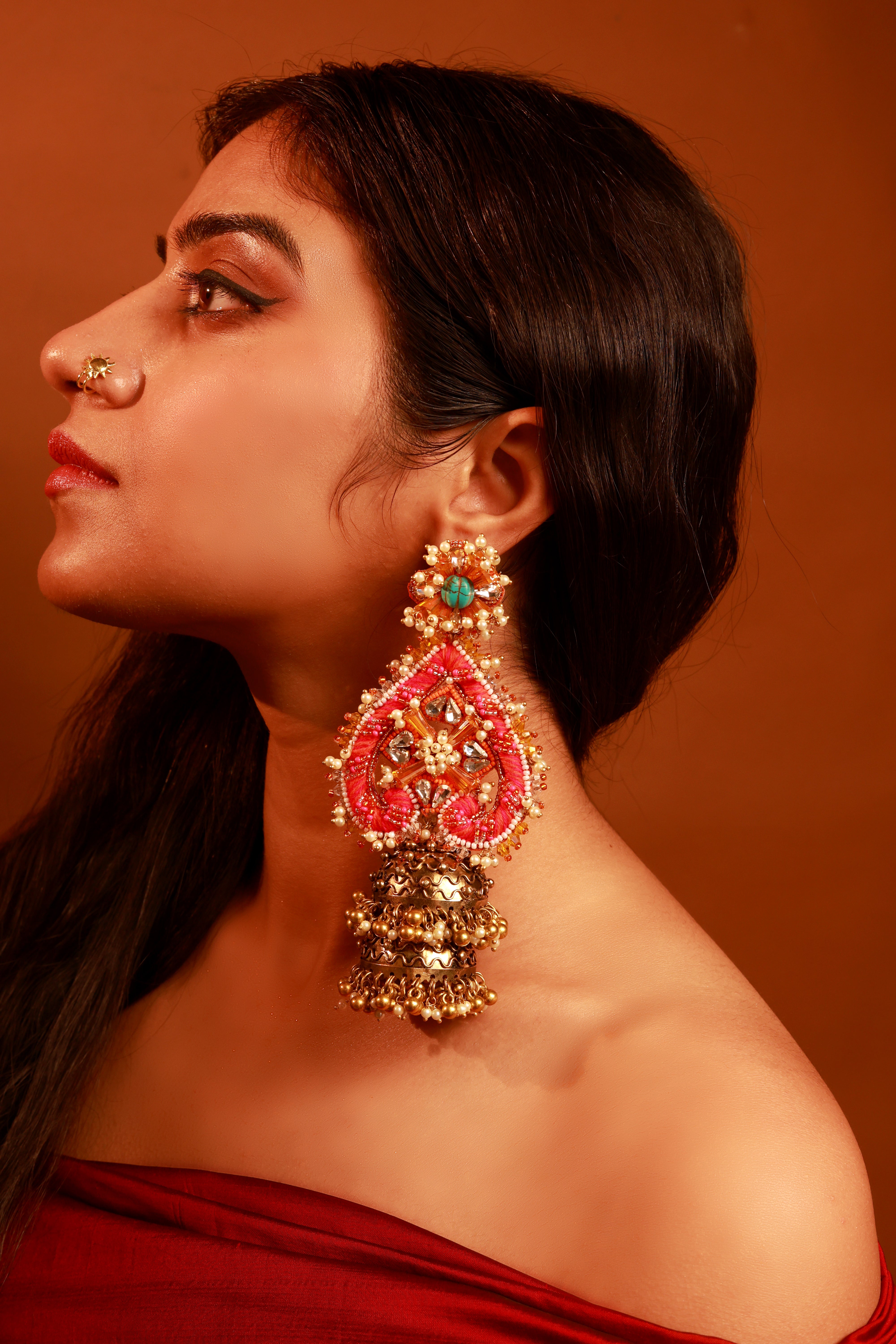 Norriyat is handcrafted bright orange and pink heart embellished with beads, pearls and stones which can be styled for mehndi and haldi looks.