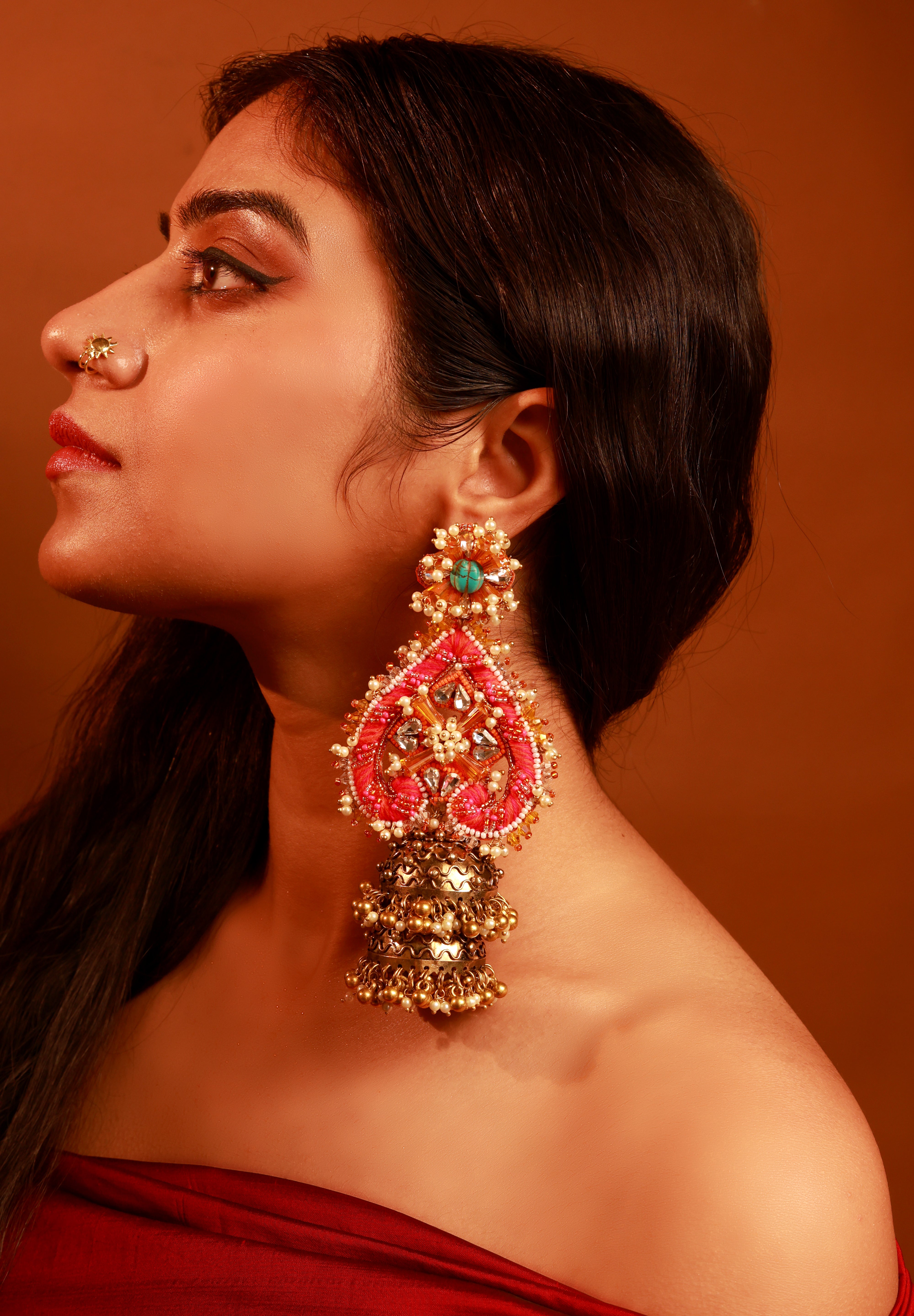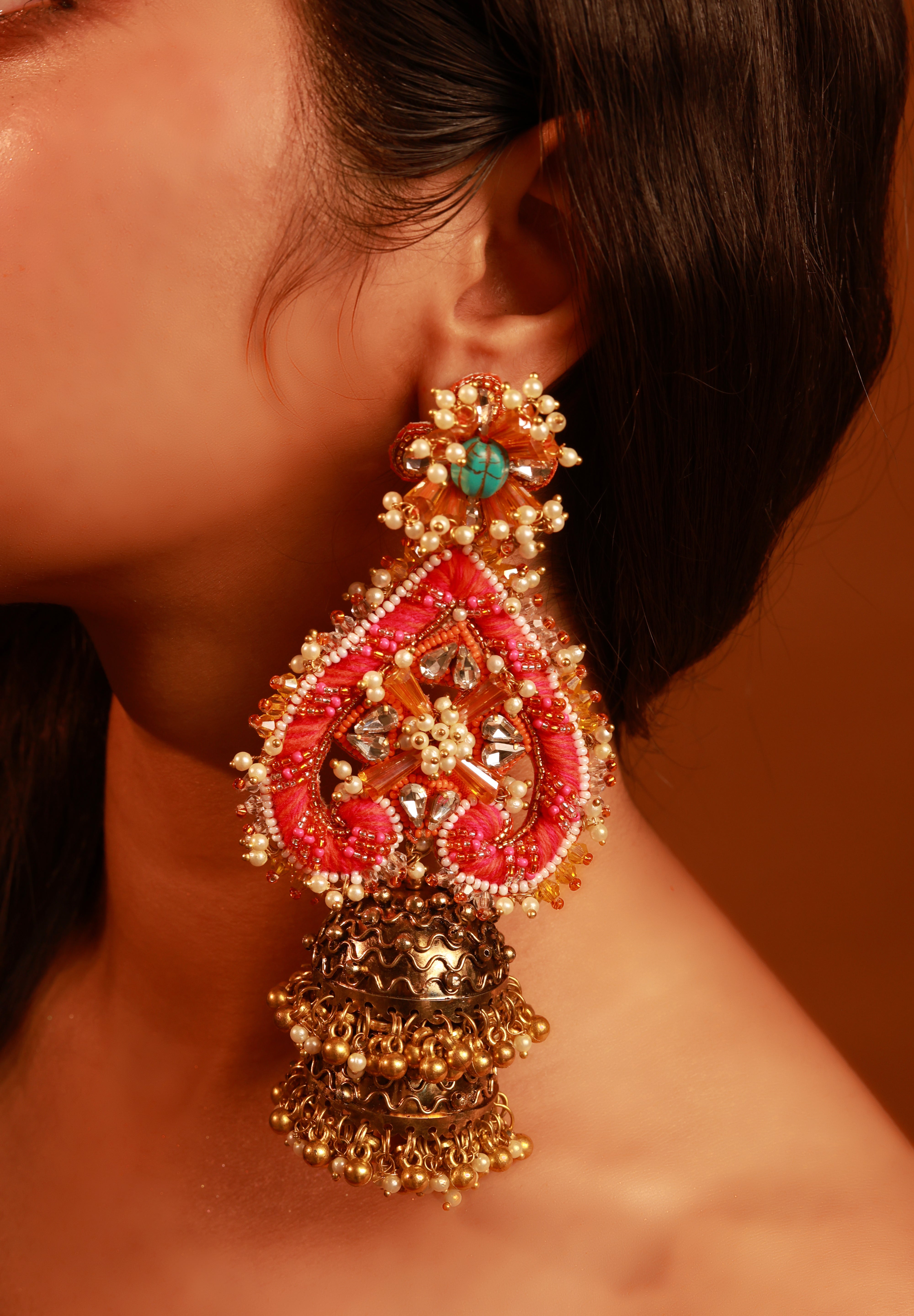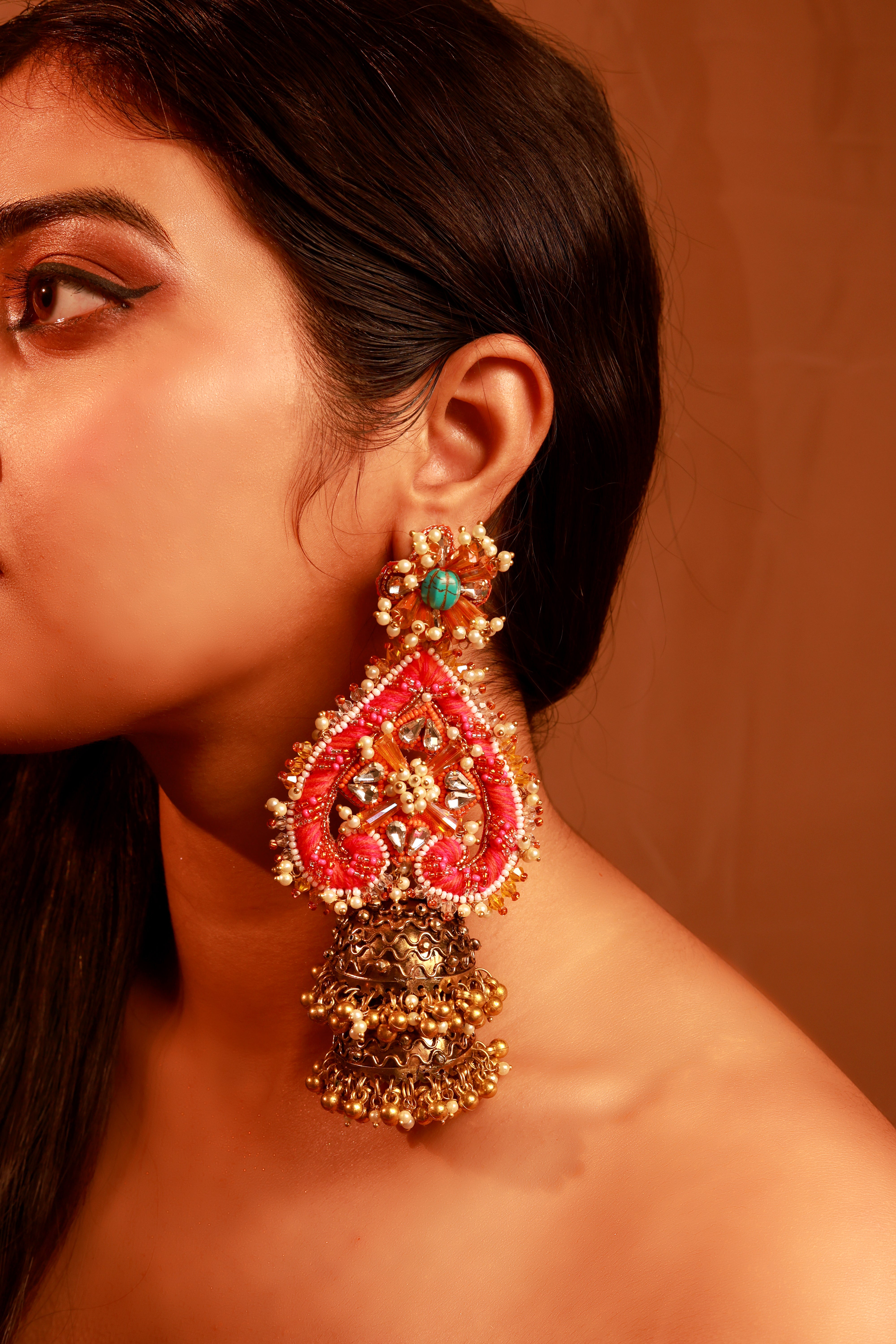 Norriyat is handcrafted bright orange and pink heart embellished with beads, pearls and stones which can be styled for mehndi and haldi looks.