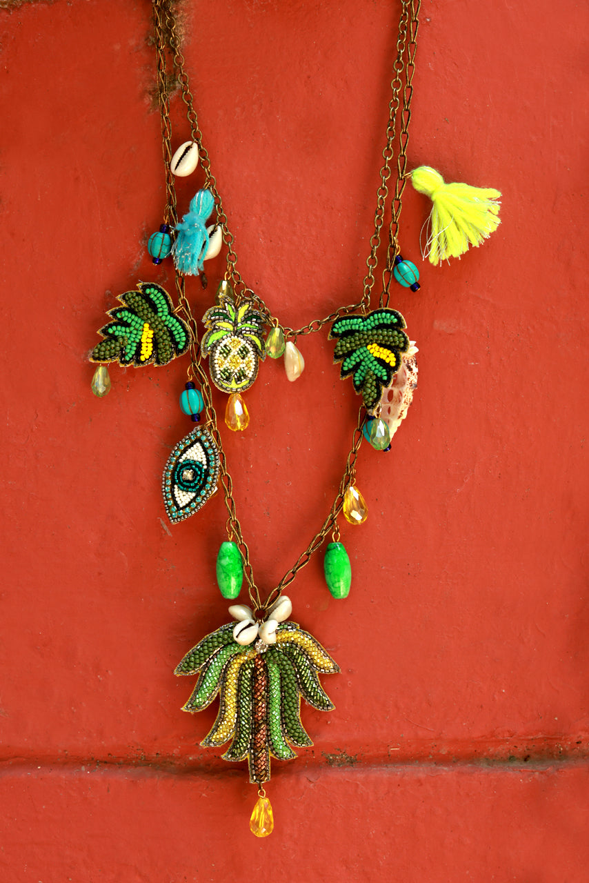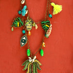 Palm Noir Neckchain SET OF 2 ,This vibrant, handcrafted necklace bursts with tropical charm and eclectic flair. Featuring a mix of beaded motifs like pineapples, palm leaves, and an eye symbol, it’s adorned with colorful elements such as shells, tassels, beads, and teardrop crystals. The centerpiece is a bold palm leaf embellished with shimmering green and gold beads, accented with cowrie shells and a dangling yellow charm. Suspended from dual antique gold chains, this piece is a playful yet artistic statement perfect for resort wear, beach days, or bohemian styling.