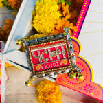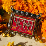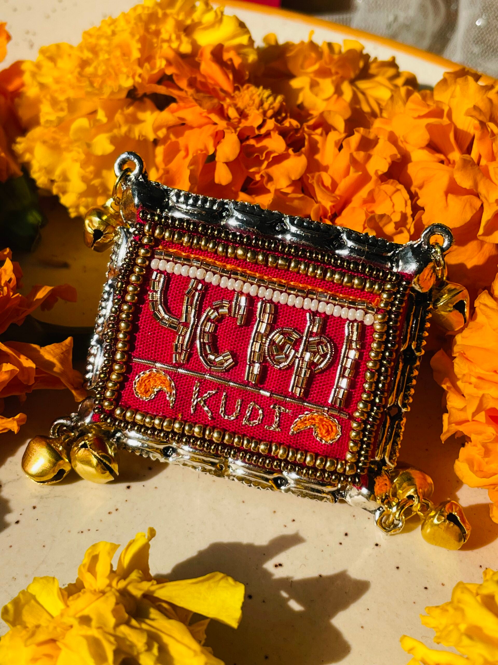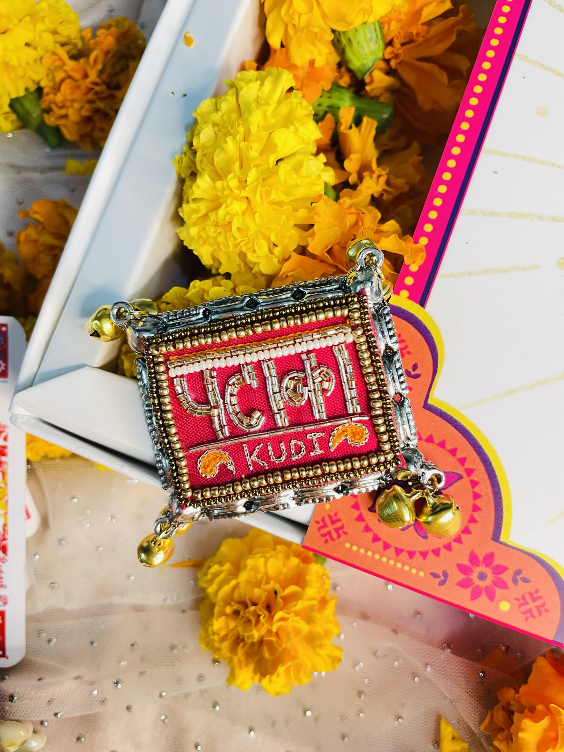 PATAKA KUDI Ring is handcrafted ring with a metal base in rectangular shape and which has hand embroidery work done on top with pearls and threads which says “PATAKA” in hindi which is used to describe a fire cracker