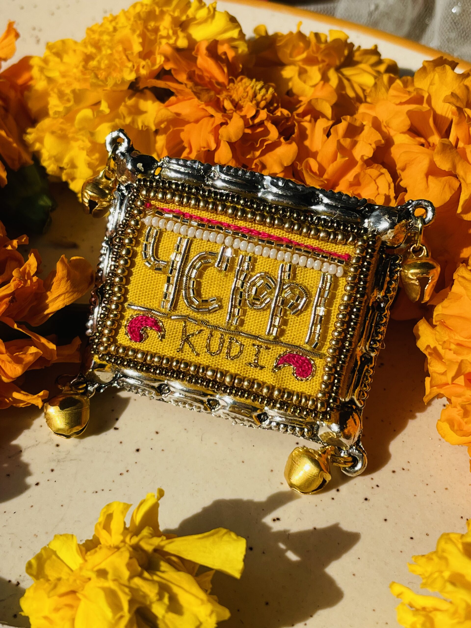 PATAKA KUDI Ring is handcrafted ring with a metal base in rectangular shape and which has hand embroidery work done on top with pearls and threads which says “PATAKA” in hindi which is used to describe a fire cracker girl, /women in punjabi .