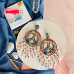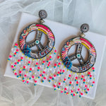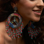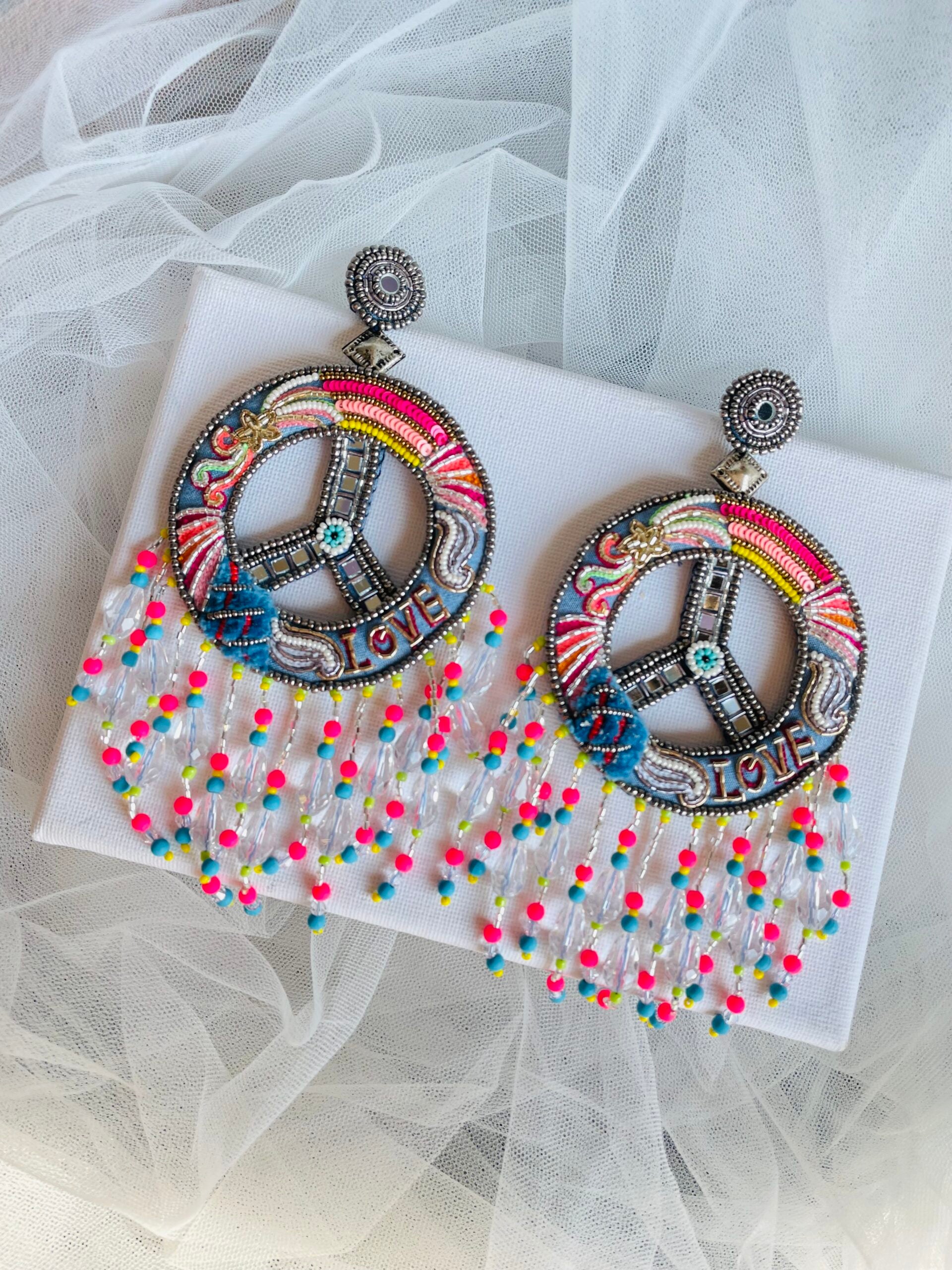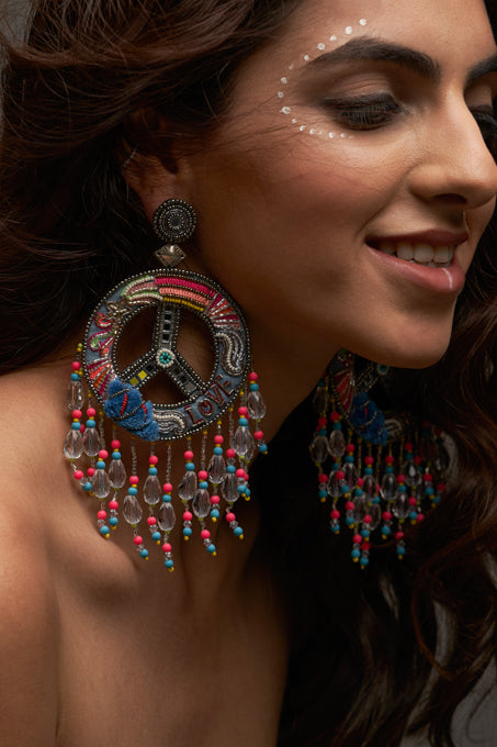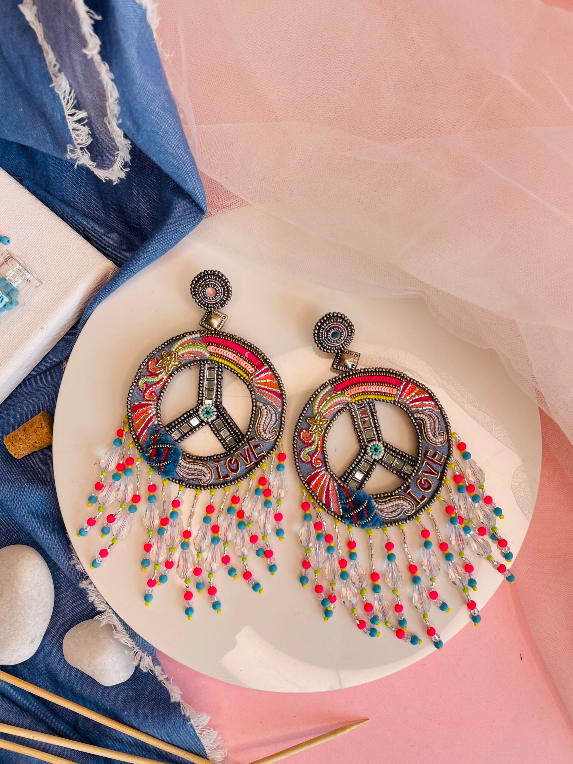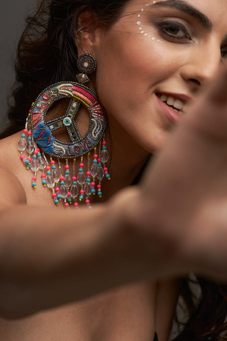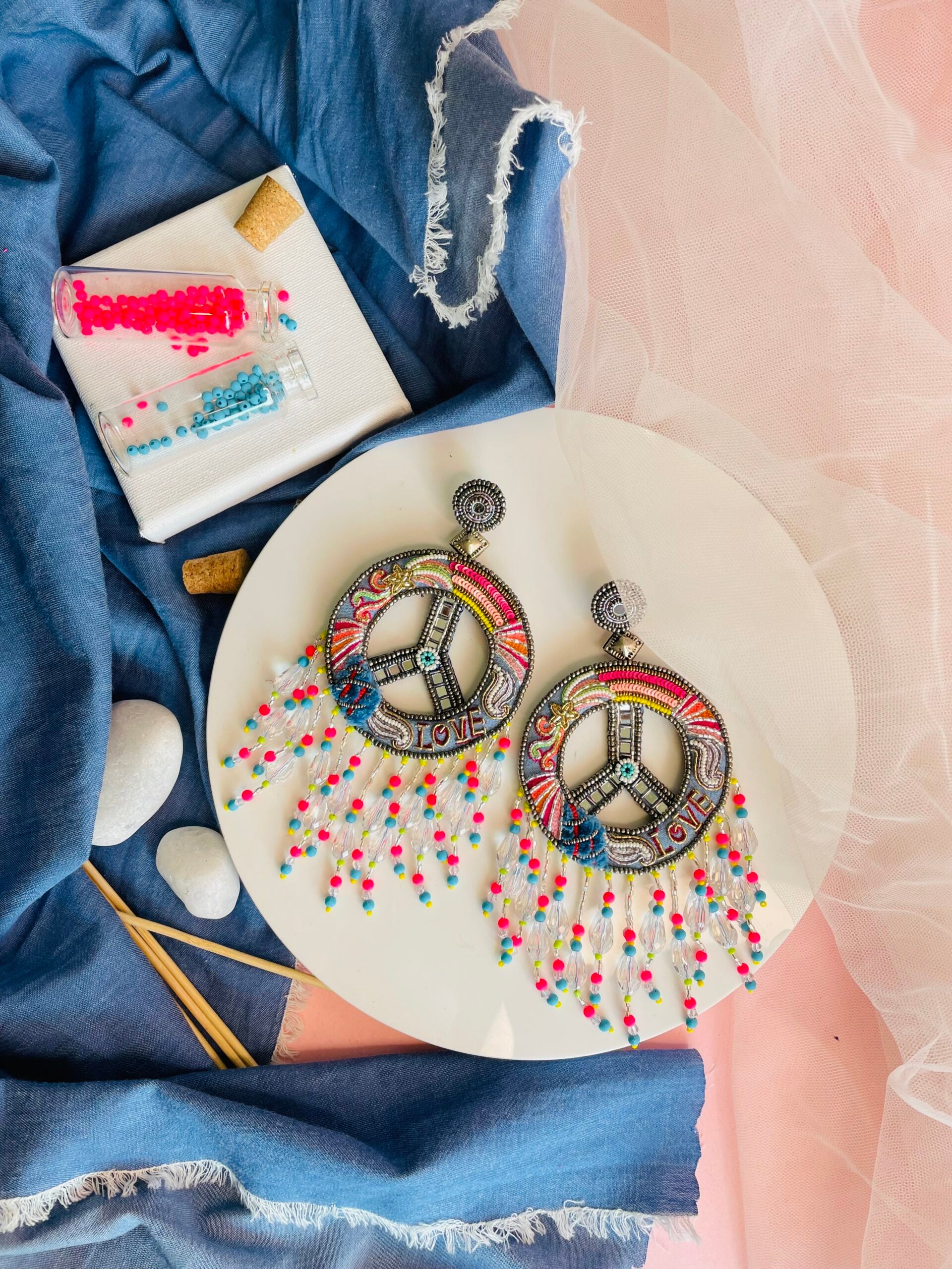 Handcrafted peace earrings are made on denim base with all colourful elements on top to add the quirky look to it , its a peace sign circular shaped stud style earrings which are light in weight and different , mirror and metal embellishments are attached on it , at the bottom colourful bead work and crystals are hanged which adds to its beauty !