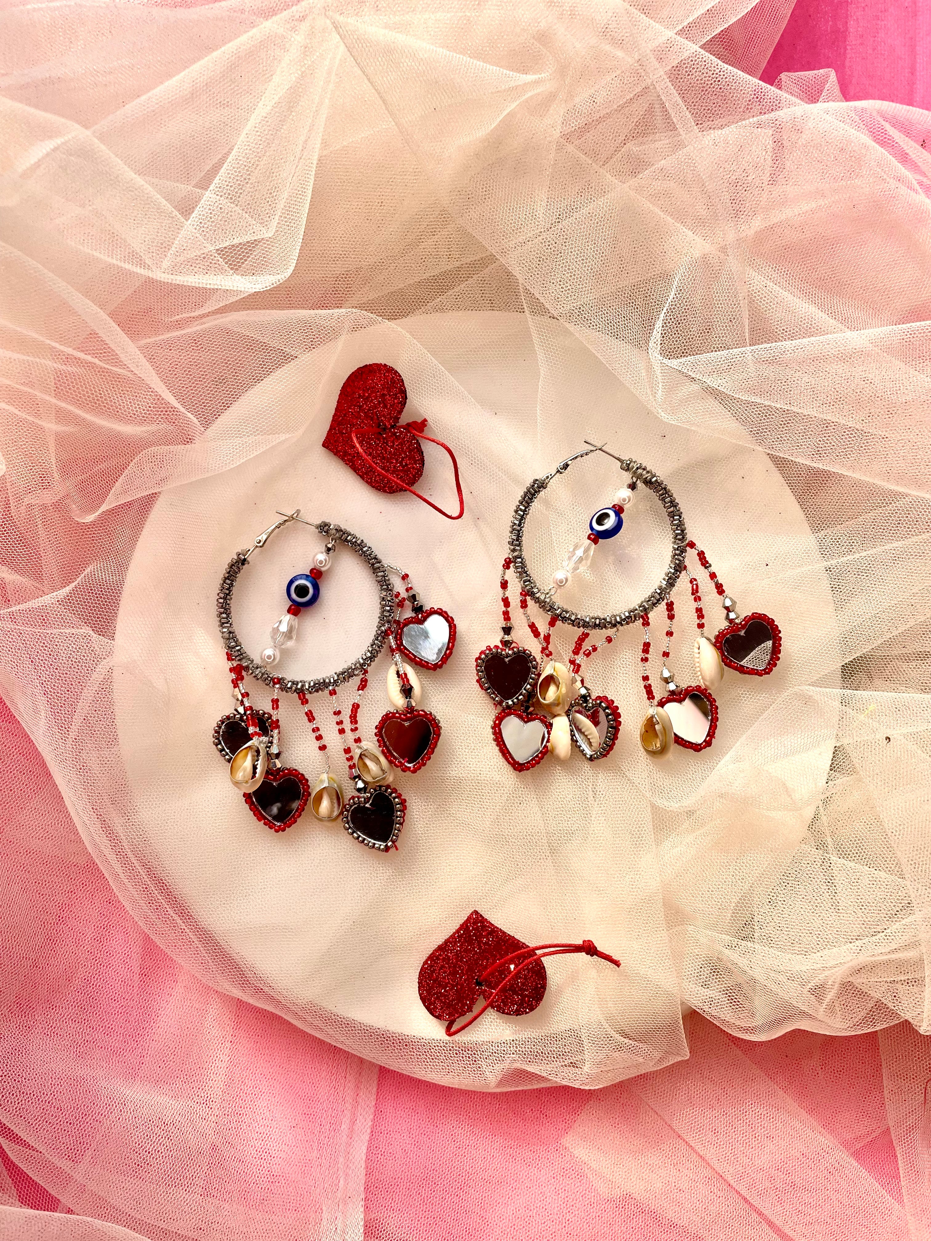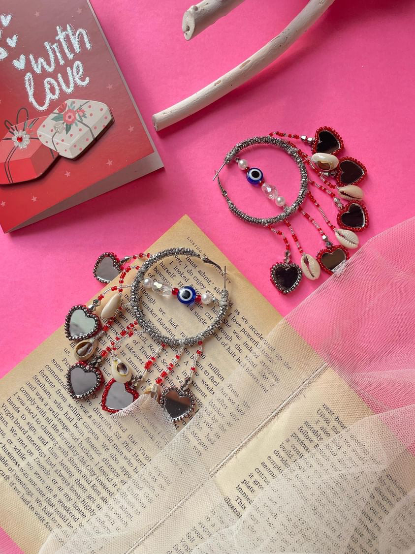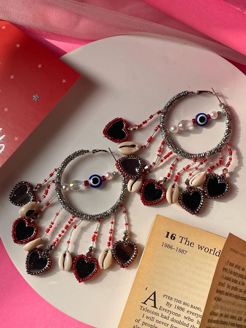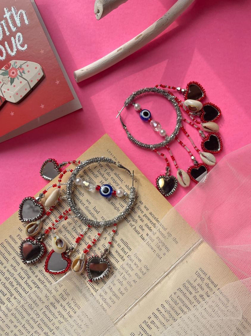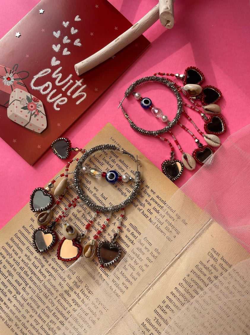Pyaar hoops are handcrafted with Metallic Glassbeads coiled with metallic wires , drop shaped reflecting mirror with some sea shells complementing the hoop . Little heart drop mirrors are perfect to add statement look to your valentine day look or jewellery to choose for galantine’s day !