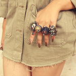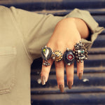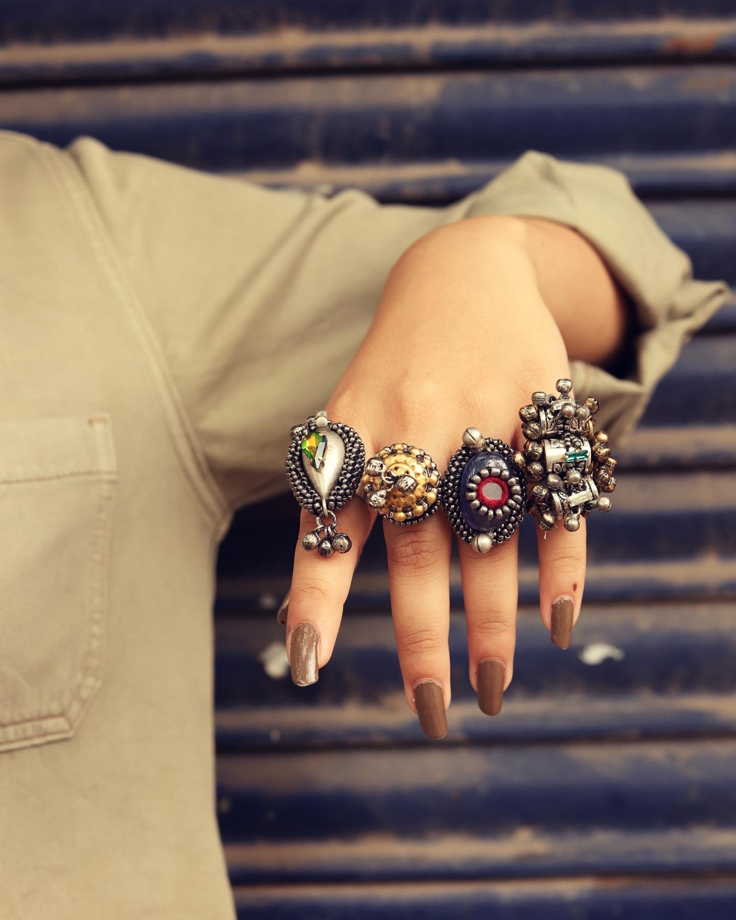 Raha is handcrafted stack of 4 rings 3 dimentional embellished with metallic charms , beads ,mirrors , pearls crystals and give an Banjara tribal look when stacked together . All rings are adjustable