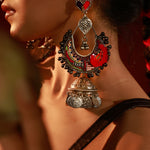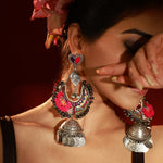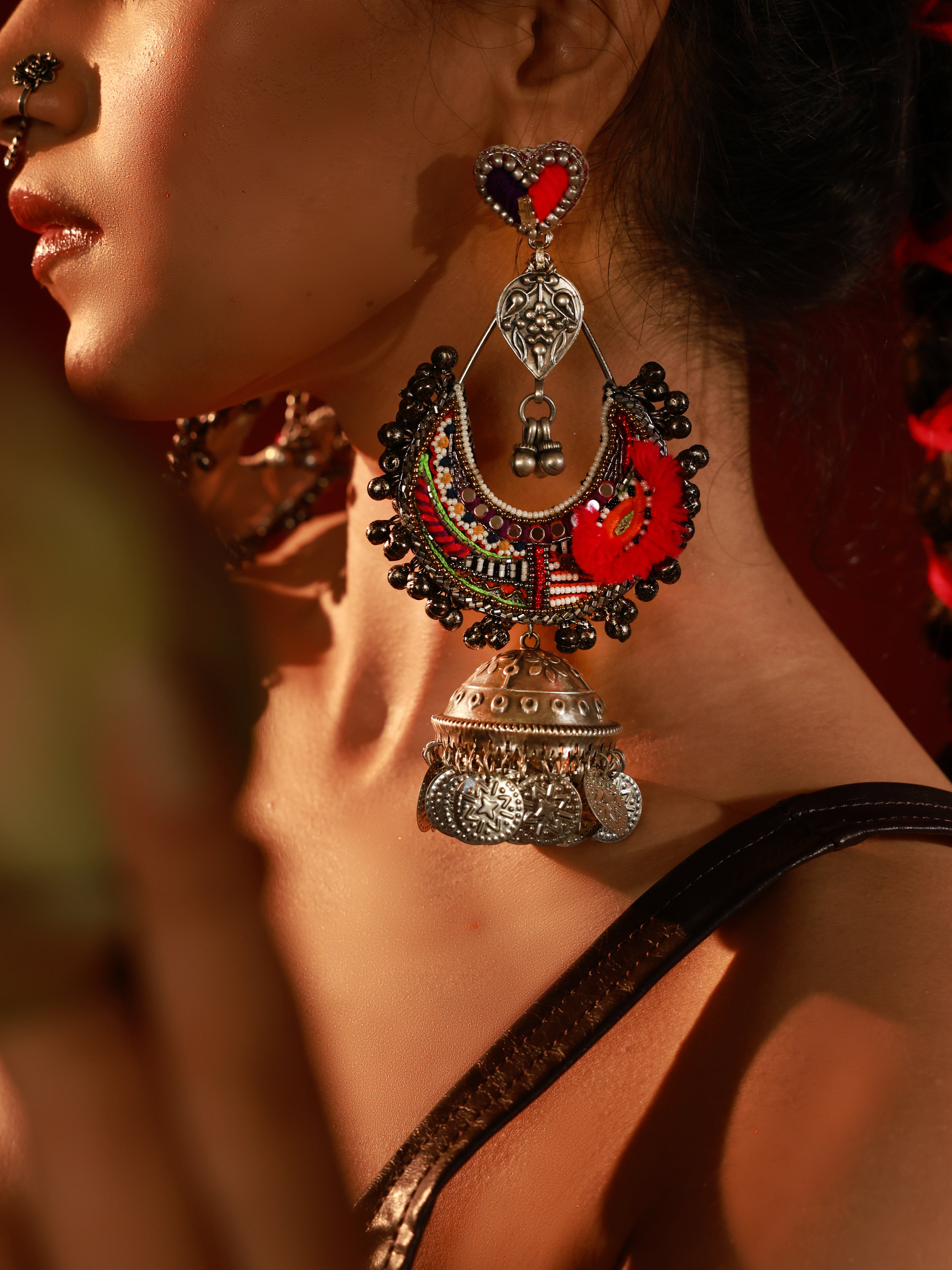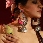 Introducing the Rang Noor Chandbali Oversized Jhumka, a breathtaking embodiment of artistry and elegance by Knotmecute. This exquisite piece is hand-embroidered with unique embroidery techniques along with metal ghungroos surrounded with brass jhumka at the centres to complement the jewellery piece , showcasing a mesmerizing blend of bohemian and banjara influences. Each intricate detail is crafted to enchant, while the bold oversized design makes a striking statement. The artistic tassel ambi motif infuses a playful vibrancy, with delightful pink accents that evoke a sense of charm and celebration. Perfectly suited for elevating your festive attire, this jhumka is a true masterpiece that will captivate and inspire admiration. Indulge in the allure of this unique accessory and transform your look with its enchanting presence.