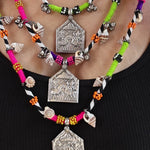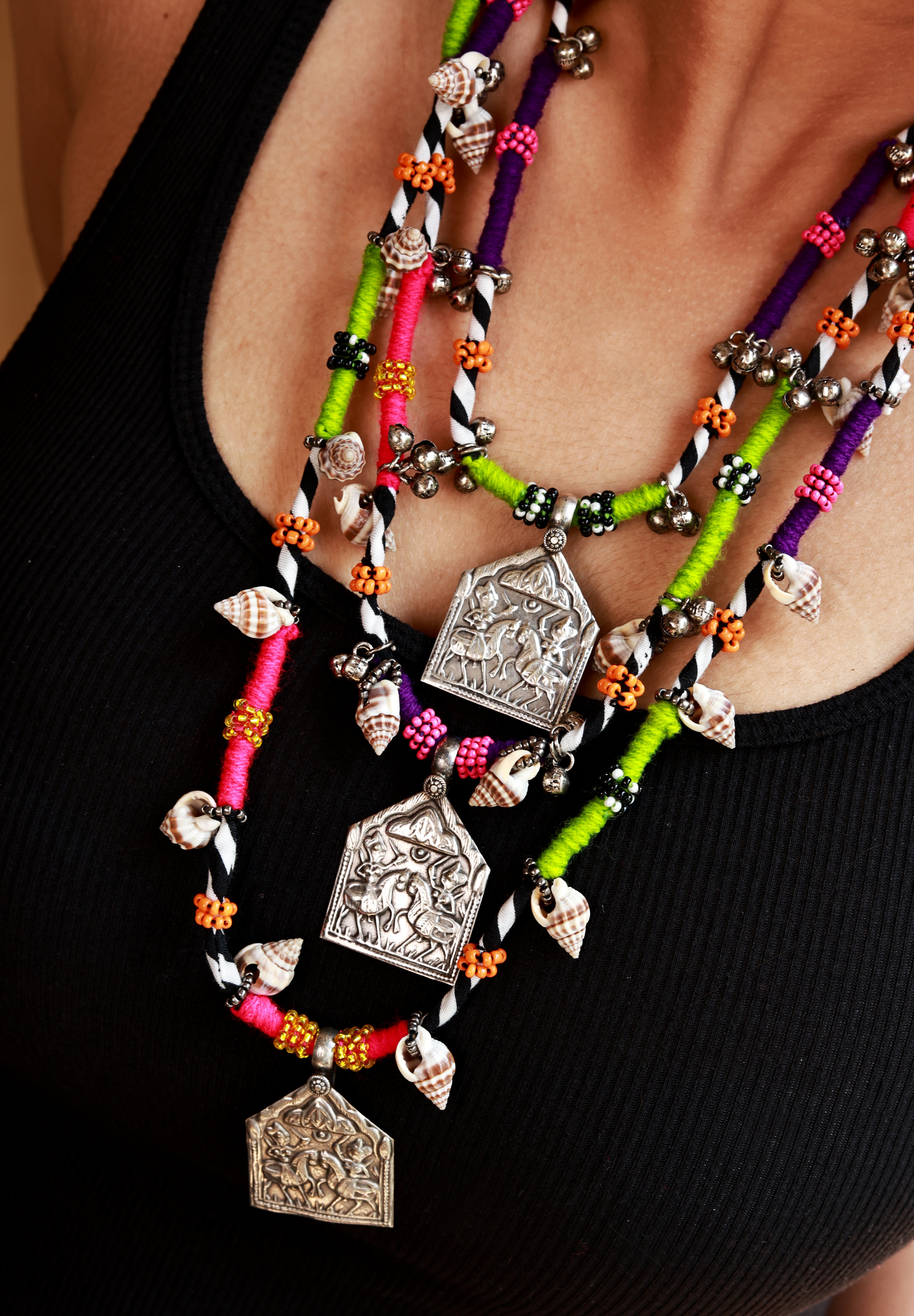This vibrant necklace features a stunning silver-plated charm design, beautifully blending bohemian charm with the intricate artistry of Indian craftsmanship. The carved pendants, paired with colorful strings, create a statement piece that showcases a fusion of tradition and modern style. Perfect for adding a unique touch to any outfit, this necklace reflects the rich cultural heritage of India while embracing the free-spirited essence of bohemian fashion.