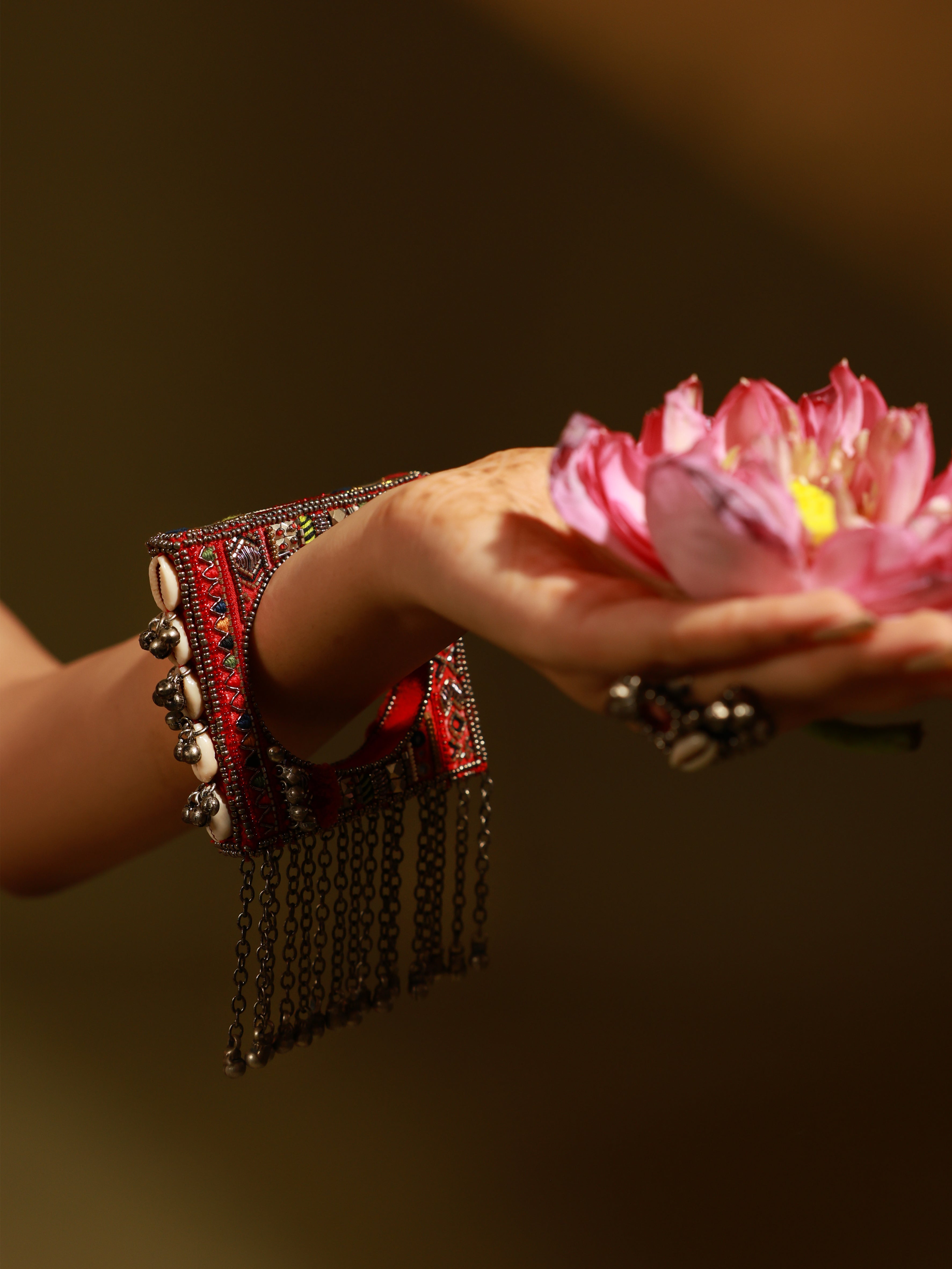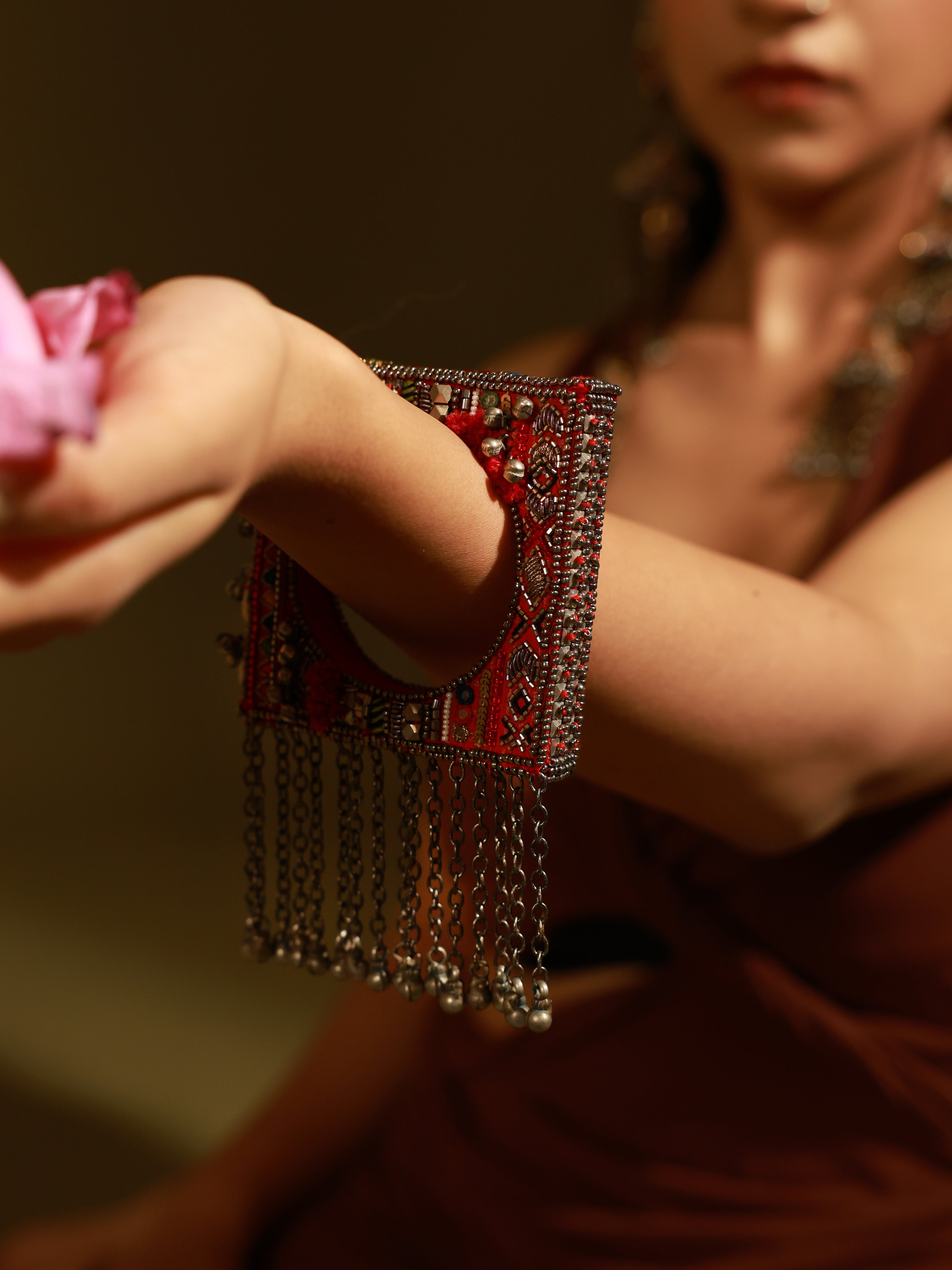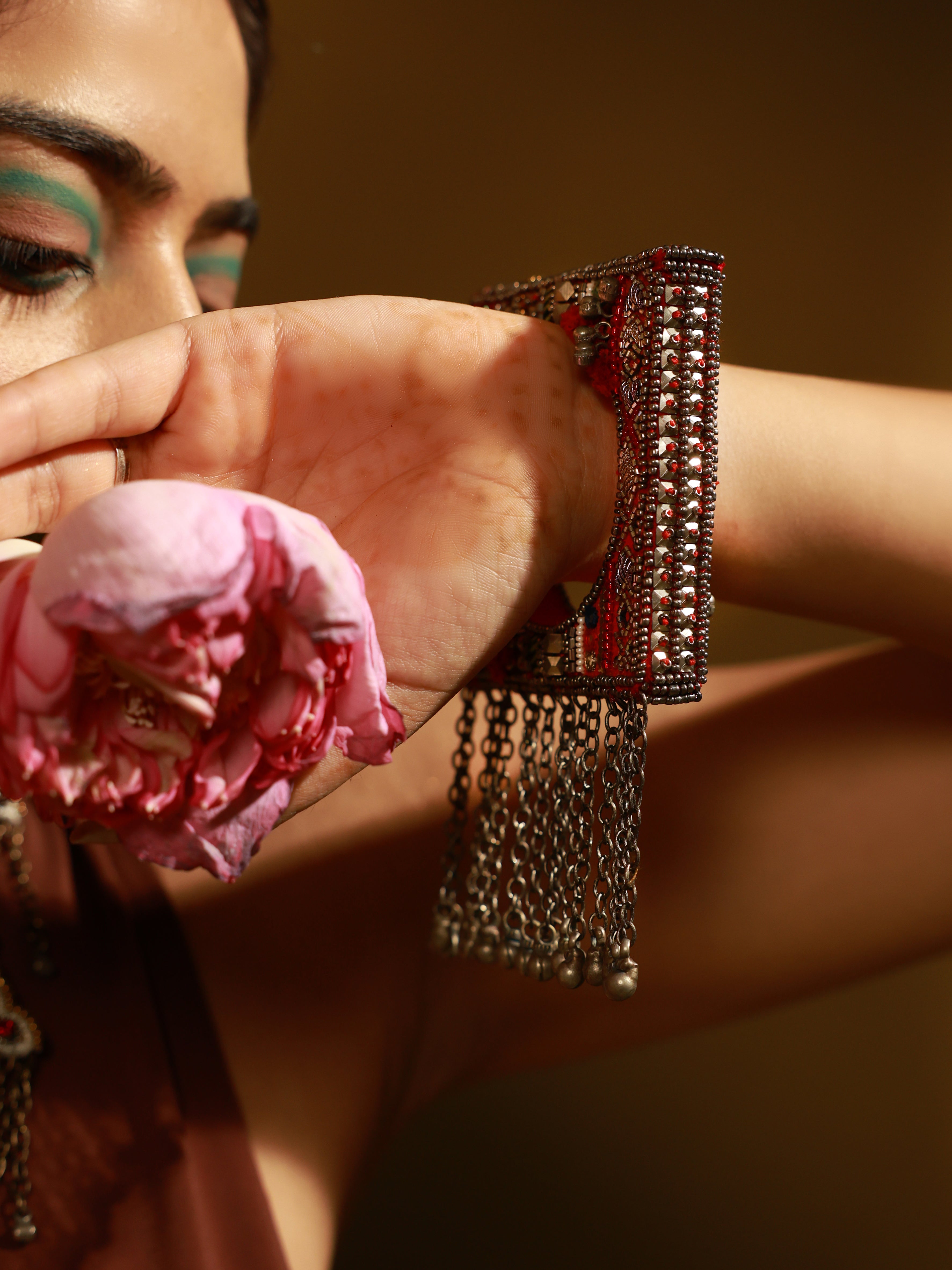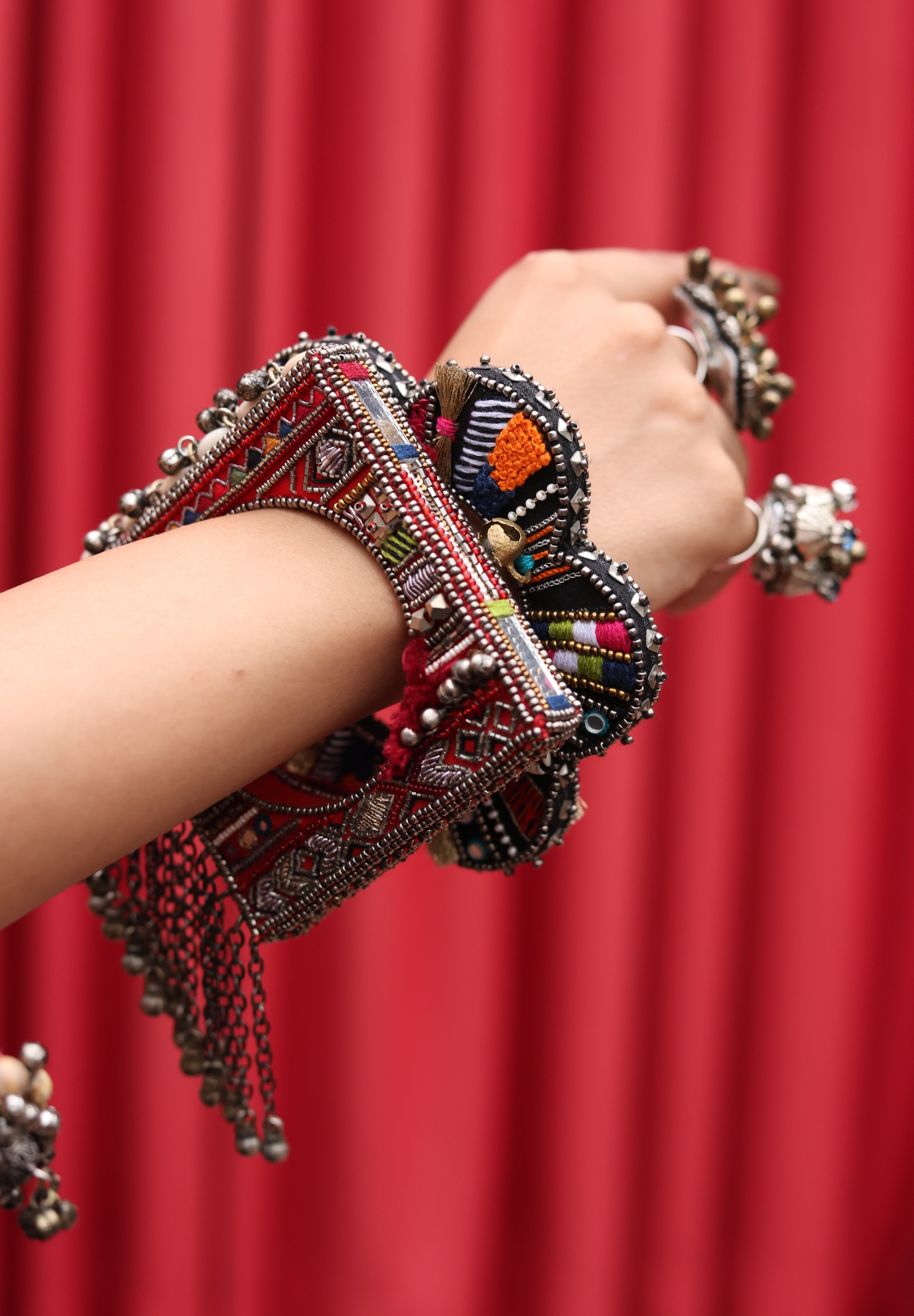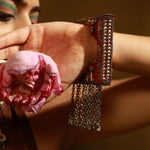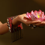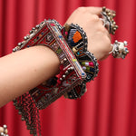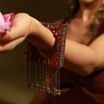 Raqiba red square bohemian bangle is Asymmetrical Handcrafted Bangle which is all ones embellished with mirrors and gold sequences glass beads to finish the look. Brass with vintage finish chains are hanged with tiny ghungroos are attached at the bottom.