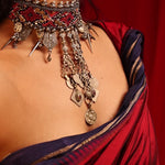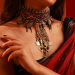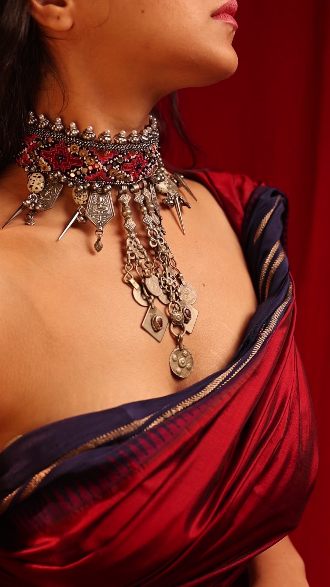 Ridah Necklace Embellished with vintage afghani charms of brass with vintage finish , each of them is one of a kind. Artisinal pieces are handcrafted with detail , choker comes with drawstring at the back easily wearable for every neck type, 3 d embroidery with mettalic charms makes it unique and perfect to add bohemian fusion jewellery to your look!
