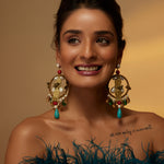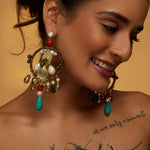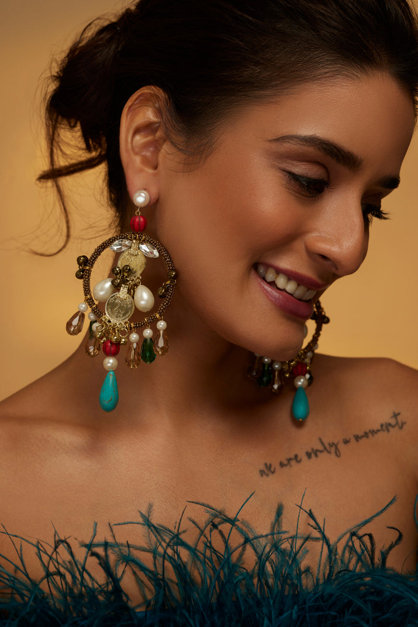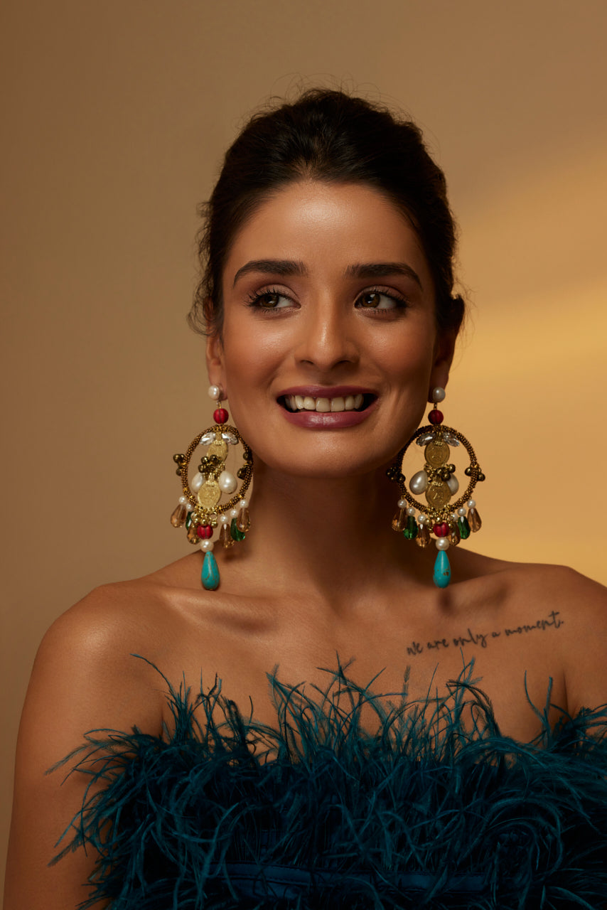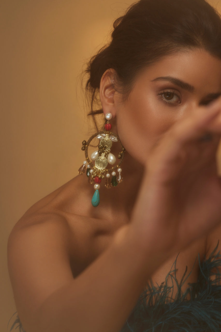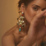 Antique-finished Rooby Chandbalis are handcrafted with pearl and natural stones featured with metal embellishments and dazzling crystals at the bottoms. Adding a perfect amount of Bohemian feel with the combination of pearls and crystals.