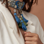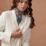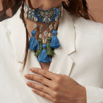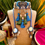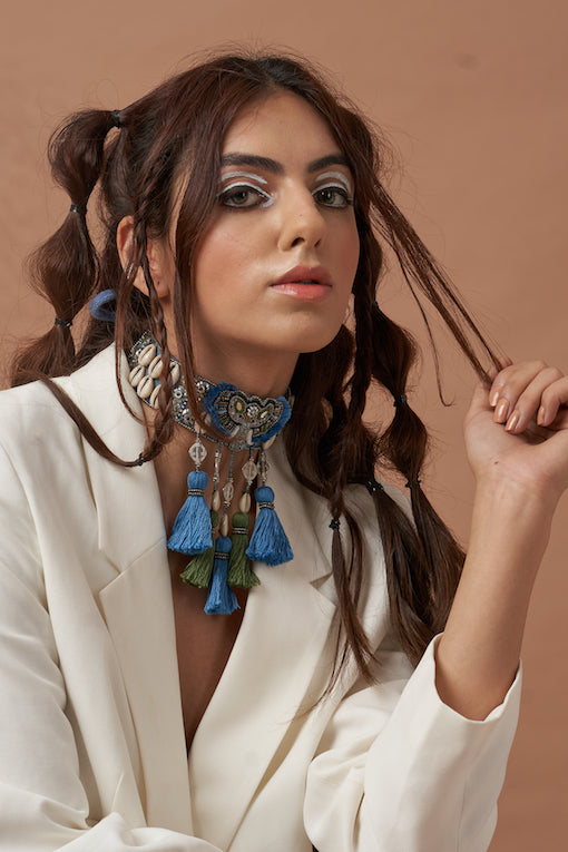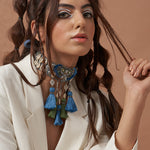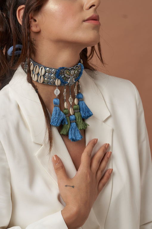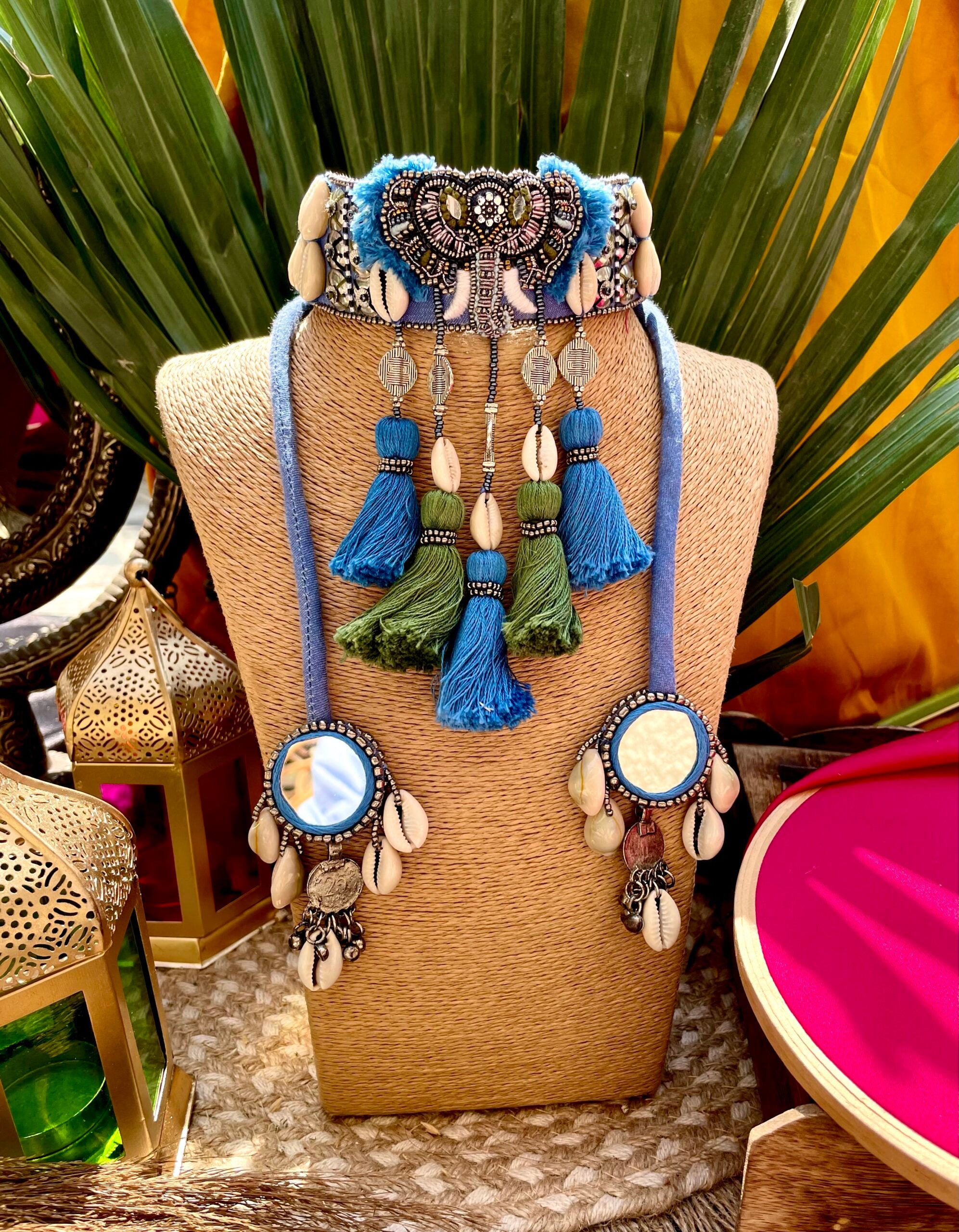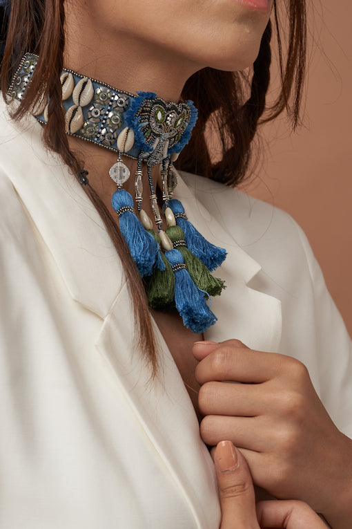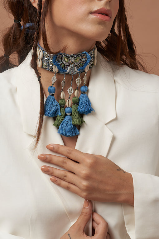 Ruban choker is inspired from gypsy/bohemian motif the elephant which is used in this choker in centre withlot of fine thread, bead , mirror work detailing with tassels charms hanged in centre attaching to elephant motif, on sides to complement the look shells and sequences with beadwork is done with a denim base which can amp up your look by adding it to the daily looks!