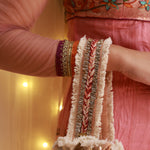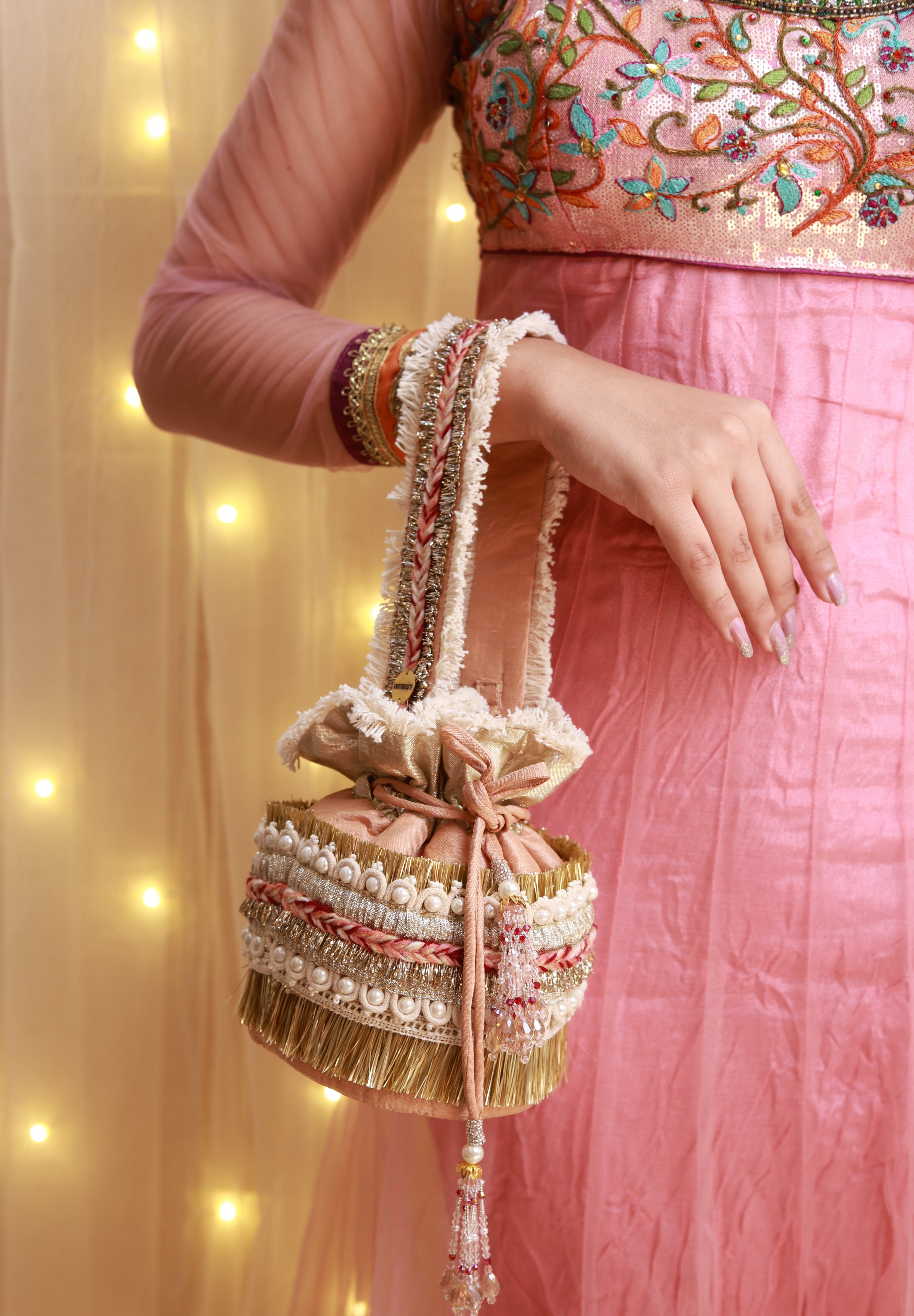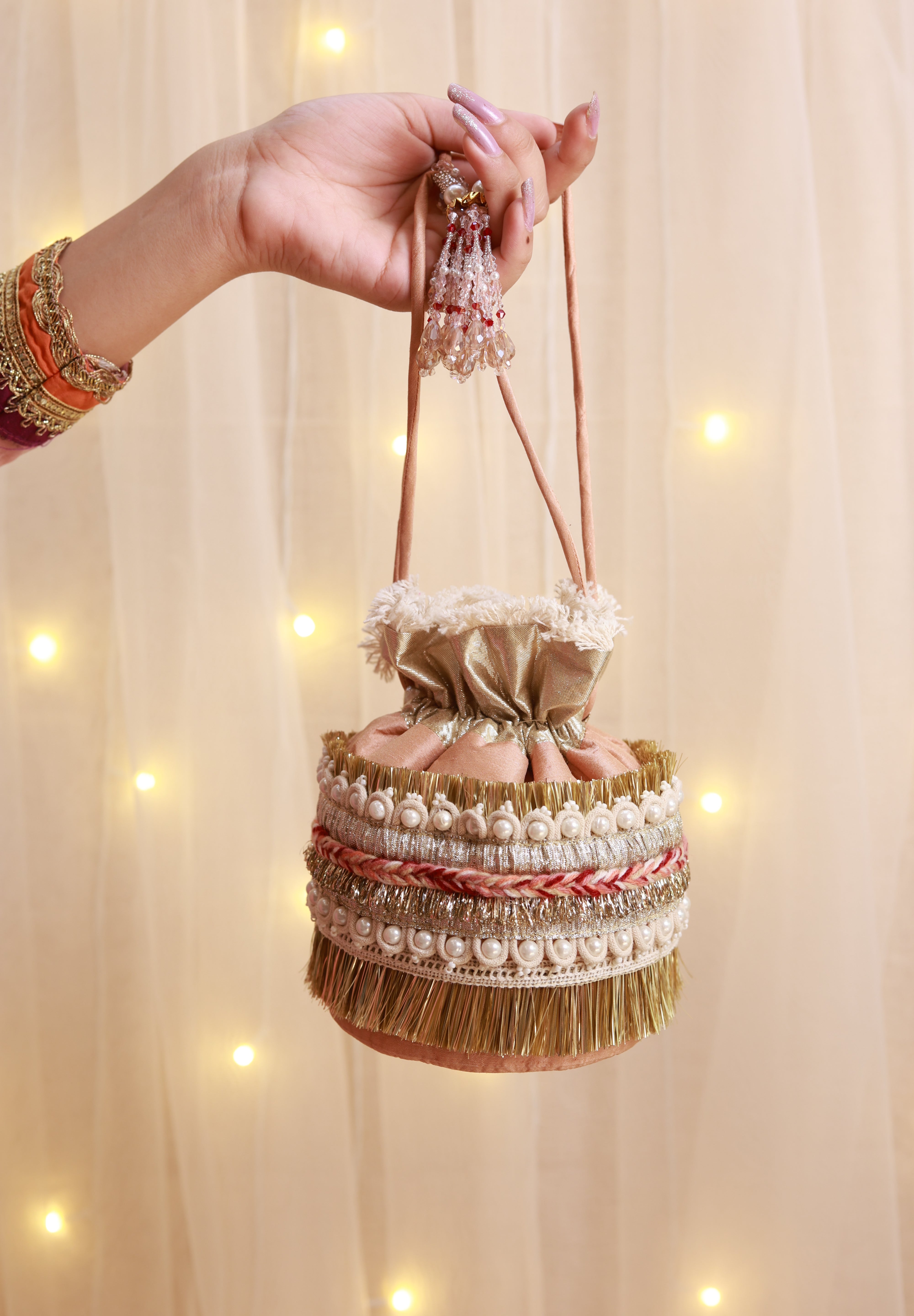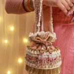 From the renowned House of Knotmecute, the potli bag is designed with a touch of glamour, highlighted by crystals adorning the bottom of the drawstrings. This makes it not only a practical choice but also a stunning addition to any festive outfit. Whether for special occasions or everyday use, the Sandesh Potli Bag is a perfect blend of tradition and contemporary style.