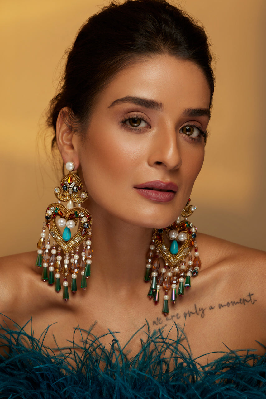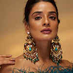 Motifs are inspired from the Mughal area and ample amounts of gold with metallic wire and crystals.