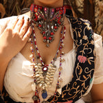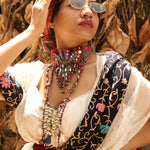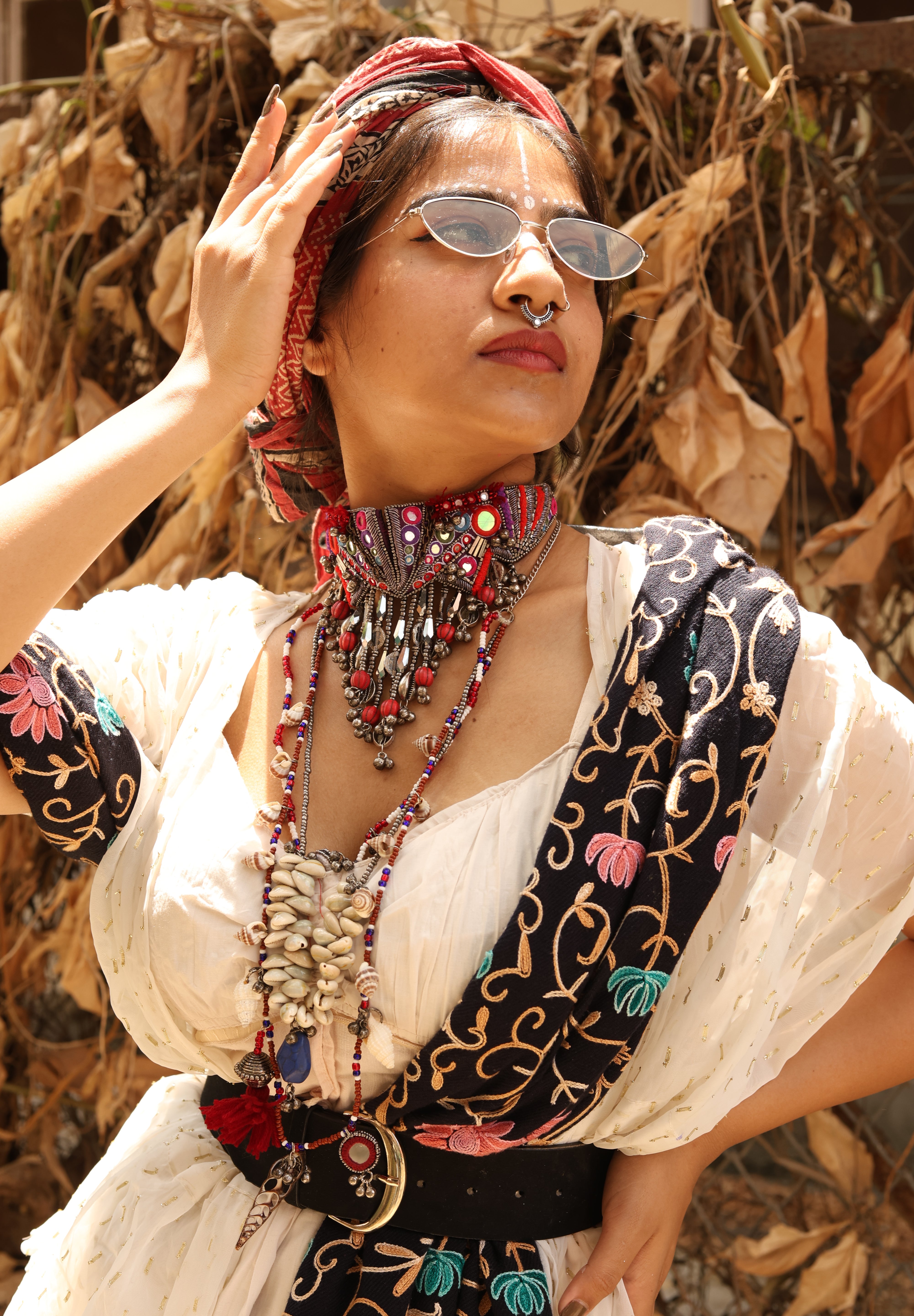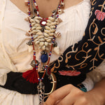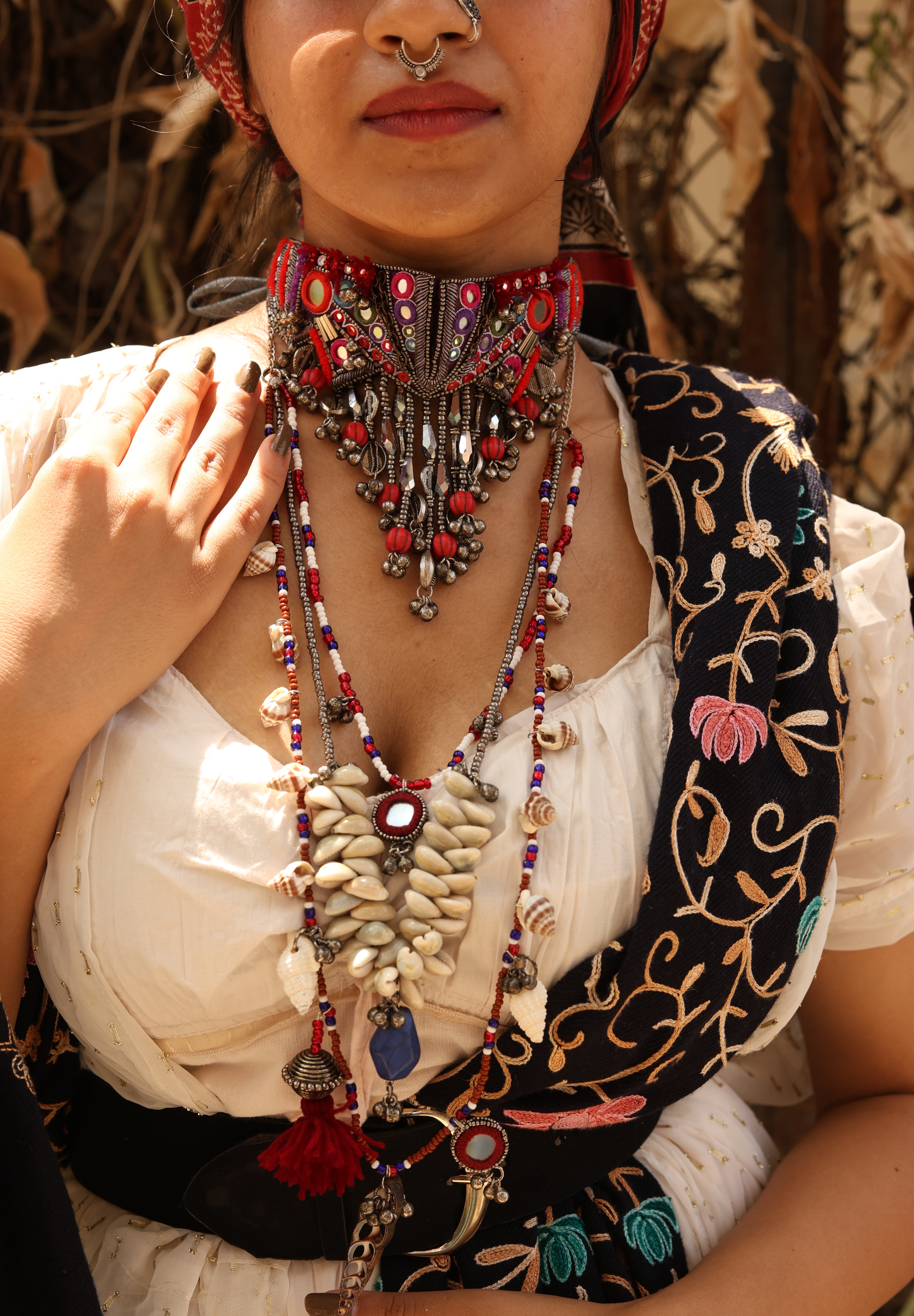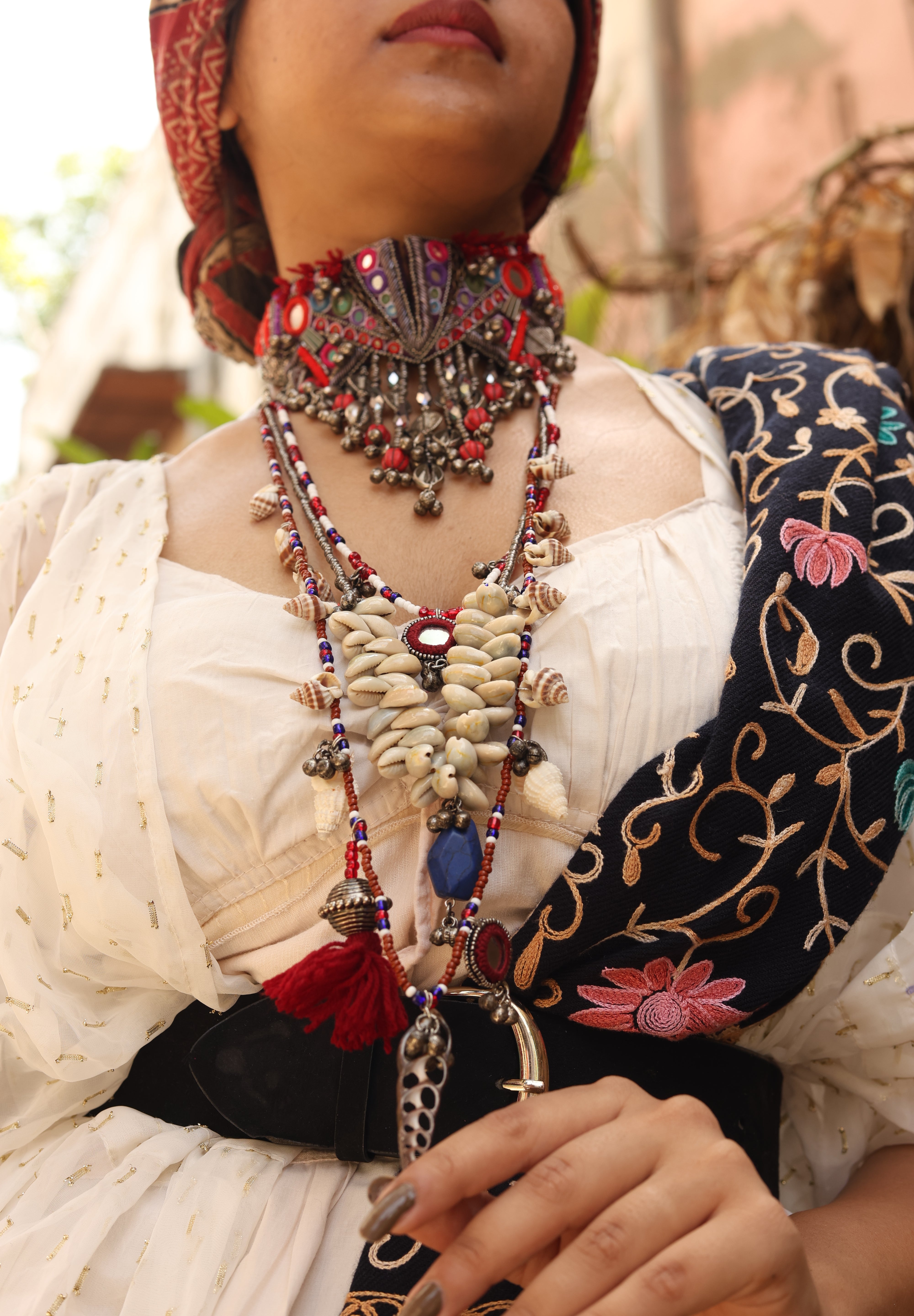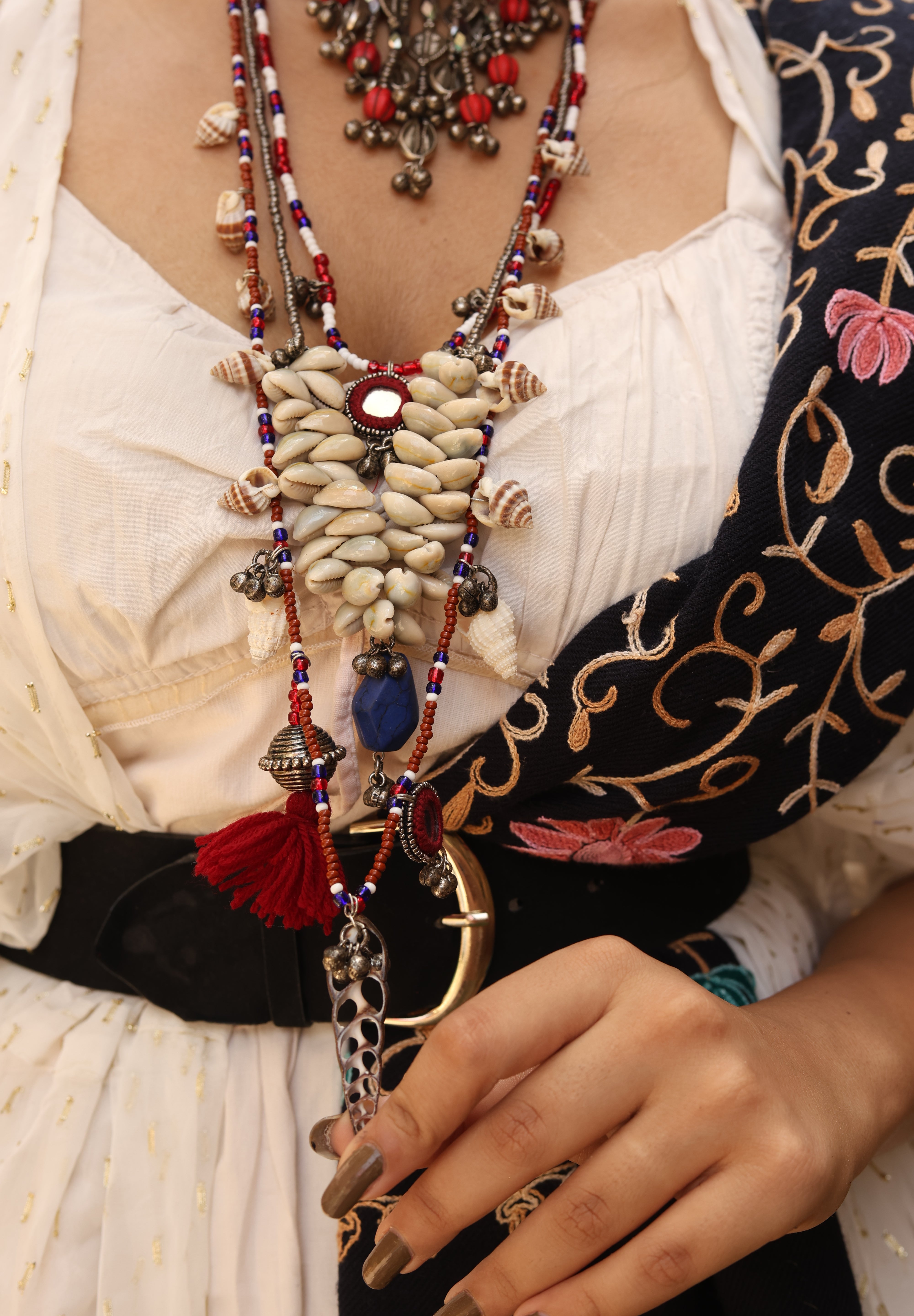 The Sea Shore Necklace is a beautifully handcrafted piece featuring an array of cowrie shells, vibrant beads in assorted colors, and various types of sea shells. Mirrors add a touch of sparkle and reflection, while tassels and ghungroos (small traditional Indian bells) enhance its charm and movement. This necklace captures the essence of the sea with its intricate detailing and diverse textures, making it a unique and eye-catching accessory.