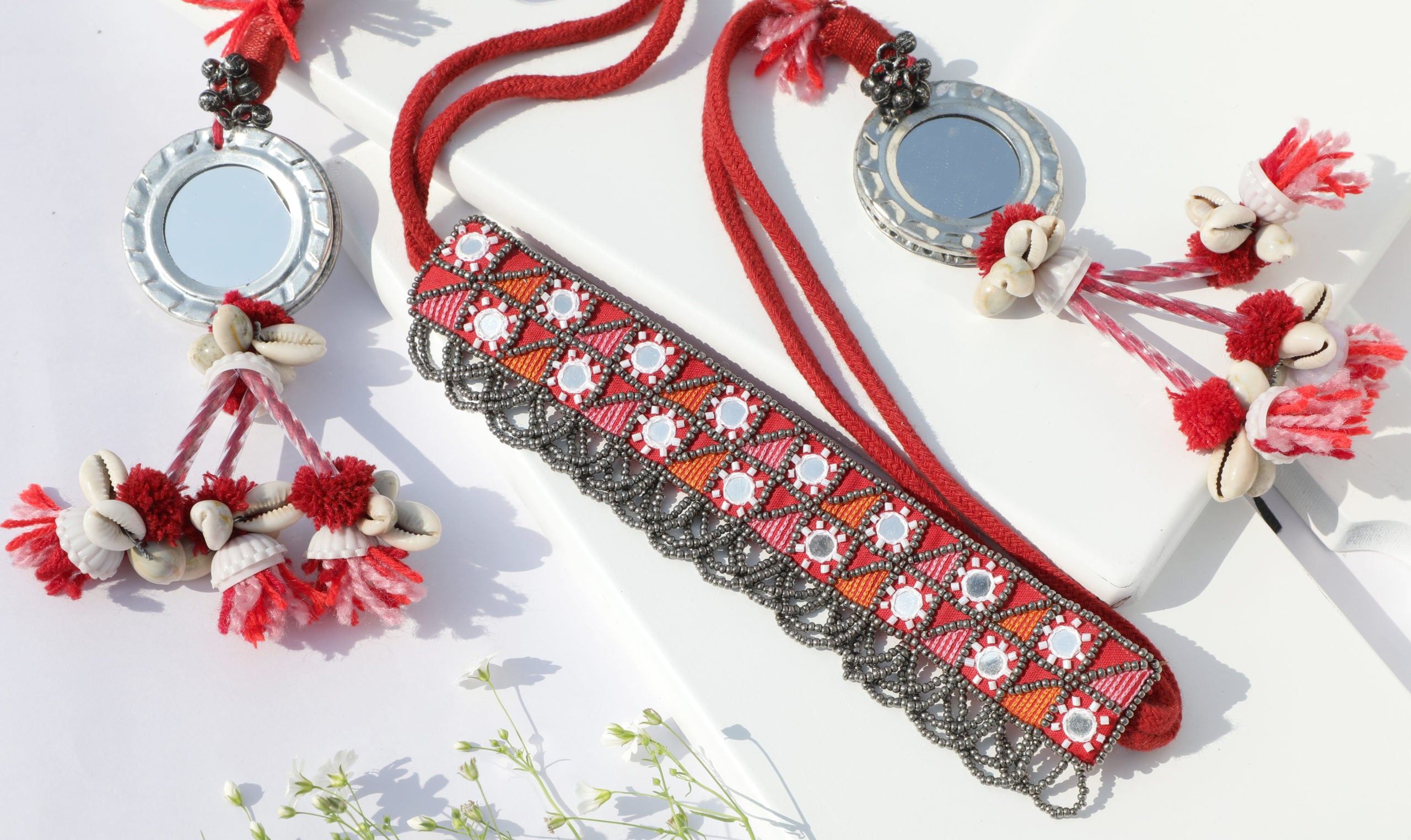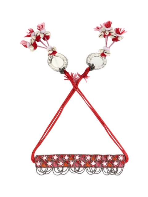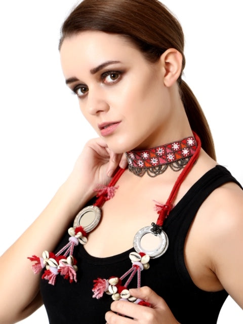sheesh banjara choker is a Handcrafted geometric pattern mirror embellished choker, inspired from the tribes , it is complete statement piece geometric pattern on choker Its a tie knot style choker , which can be tied at the back according to your neck suitable for all neck types whether its heavy neck or slim.As it has two round hangings at the bottom which is also handcrafted with mirrors shells ,pipes ,tassels .