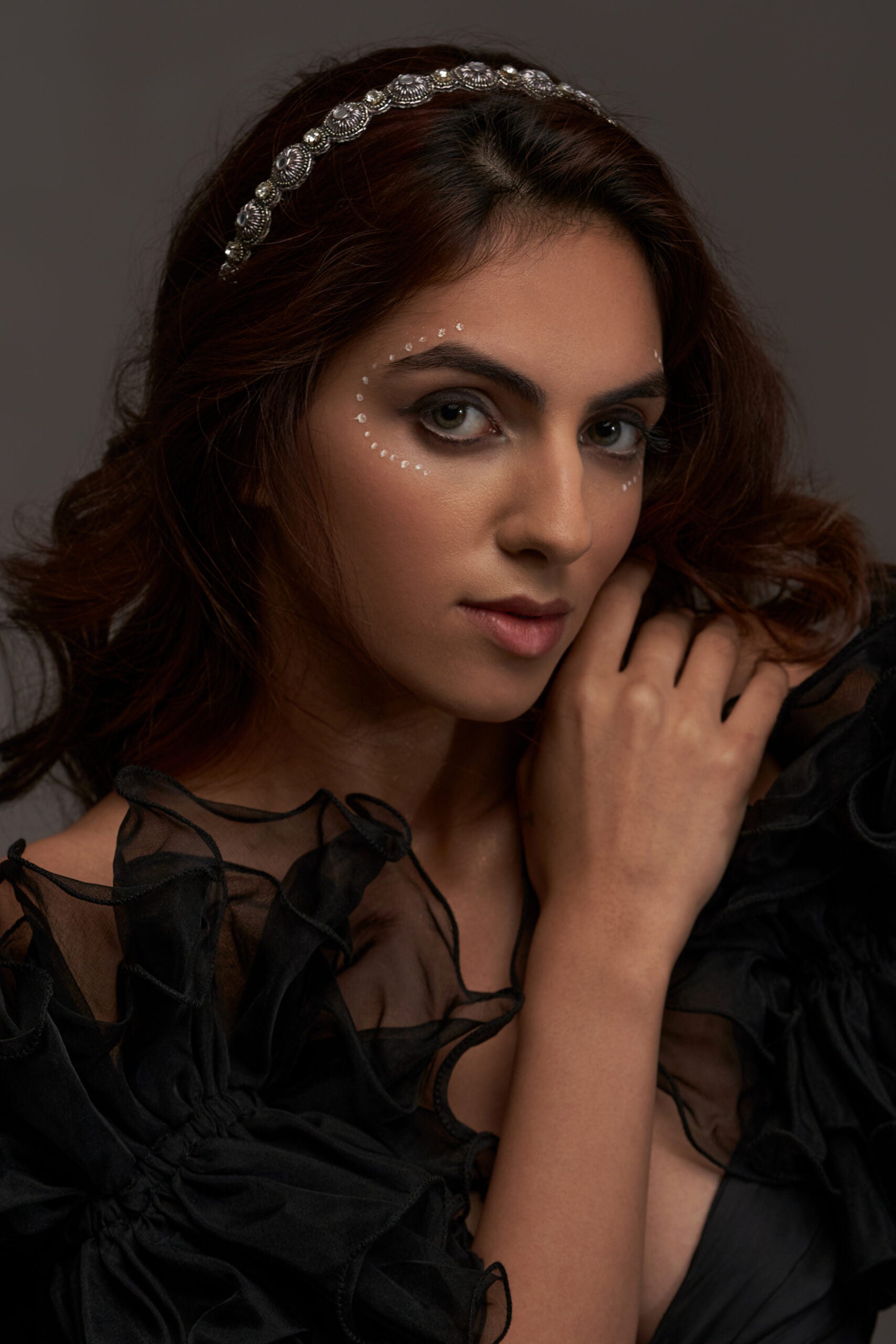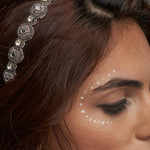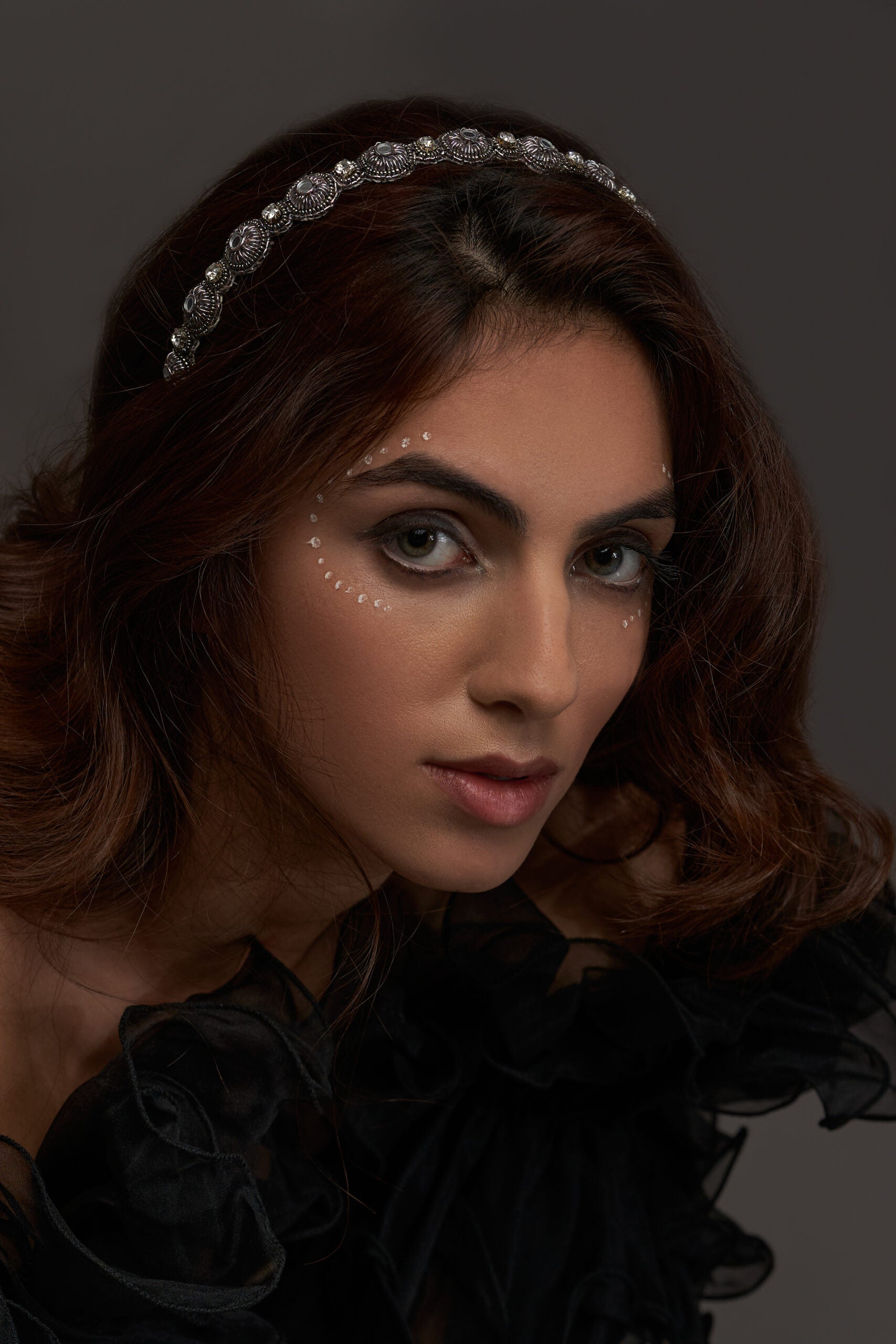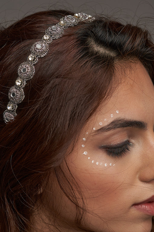 Silver mirror headband is handcrafted mirror embellished headband , which is mettalic base, everyplace in the collection gives the bohemian essence with use of mirrors and silver Mettalic wires .