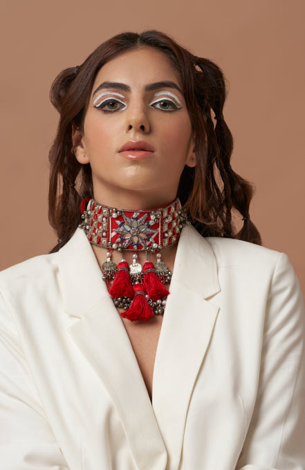 Sitara red choker is handcrafted choker which is Inspired by the bohemian elements , This range of jewellery is an amalgamation of colours and tribal essence, perfect to up your game for any occasion. This piece is hand embroidered using with all mirror and metal embellishments to complete the look .