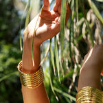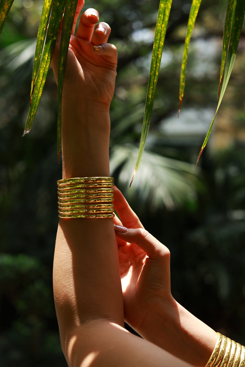 Sunset Sail Handcuff Drenched in sunshine and sculpted to make a statement, this bangle brings the warmth of the tropics to your wrist. Crafted in solid brass with rich gold plating, its bold stacked form radiates power and poise — perfect for resort evenings, festive soirees, or everyday glam with a touch of coastal soul.