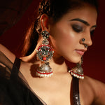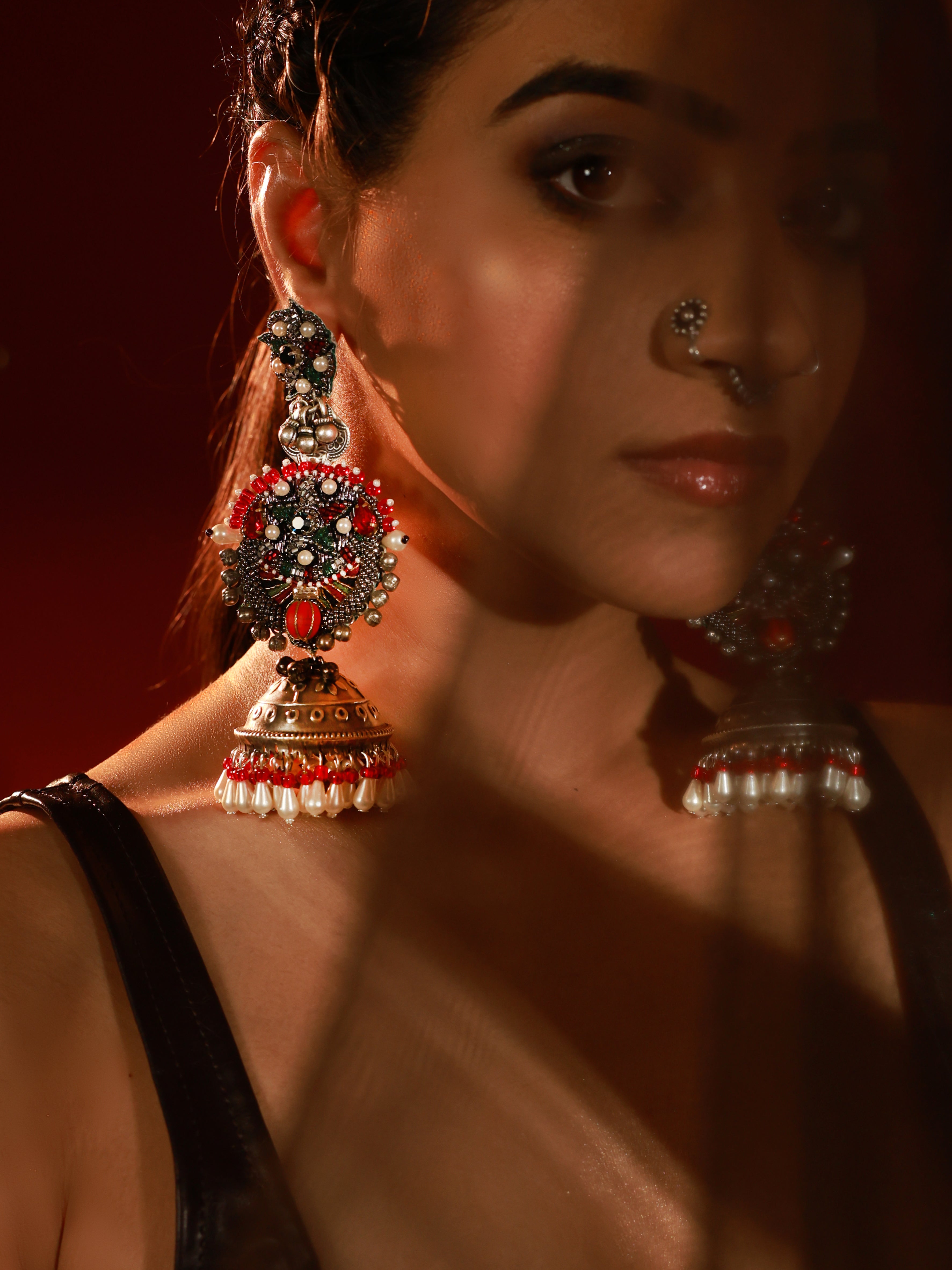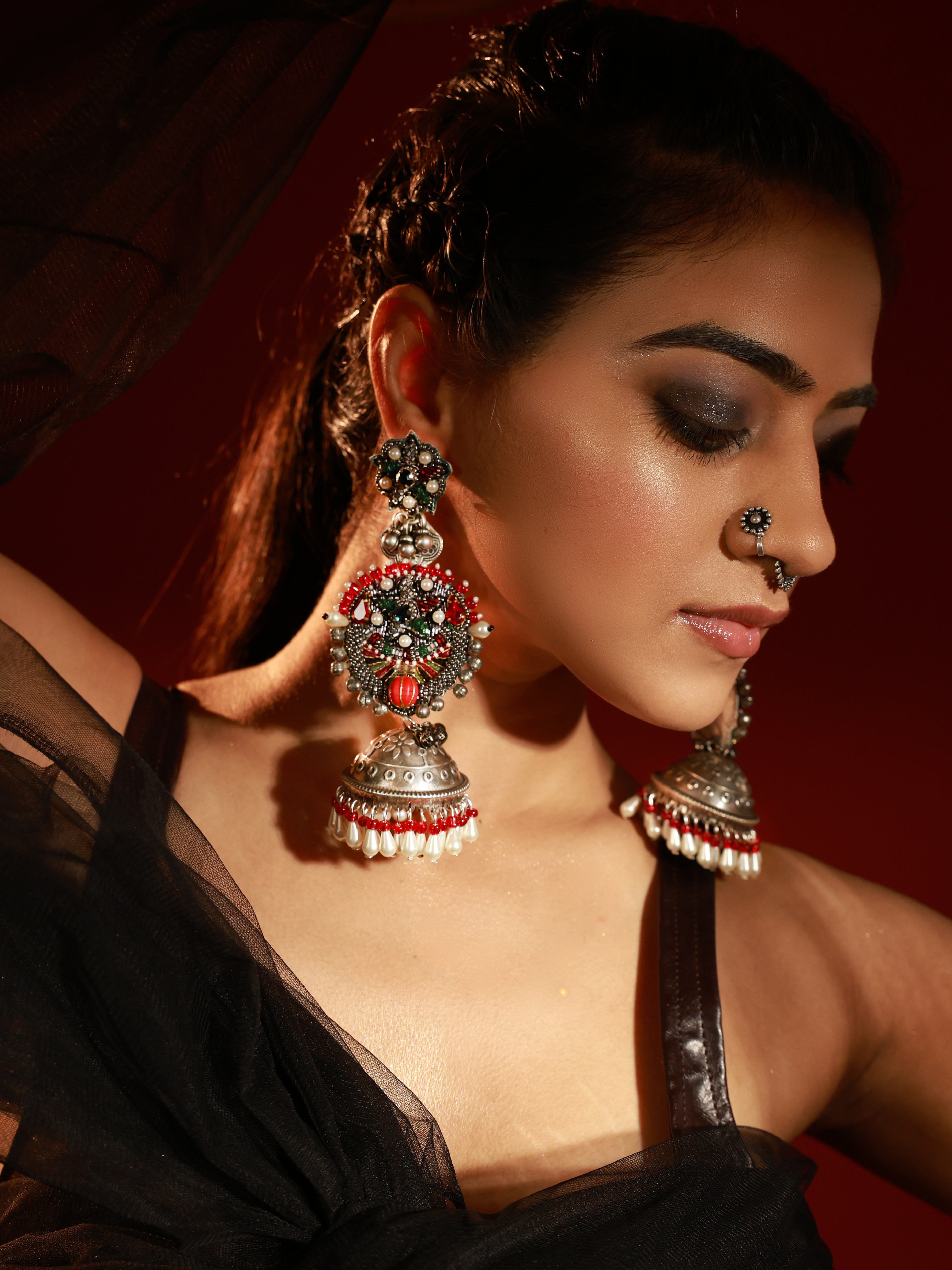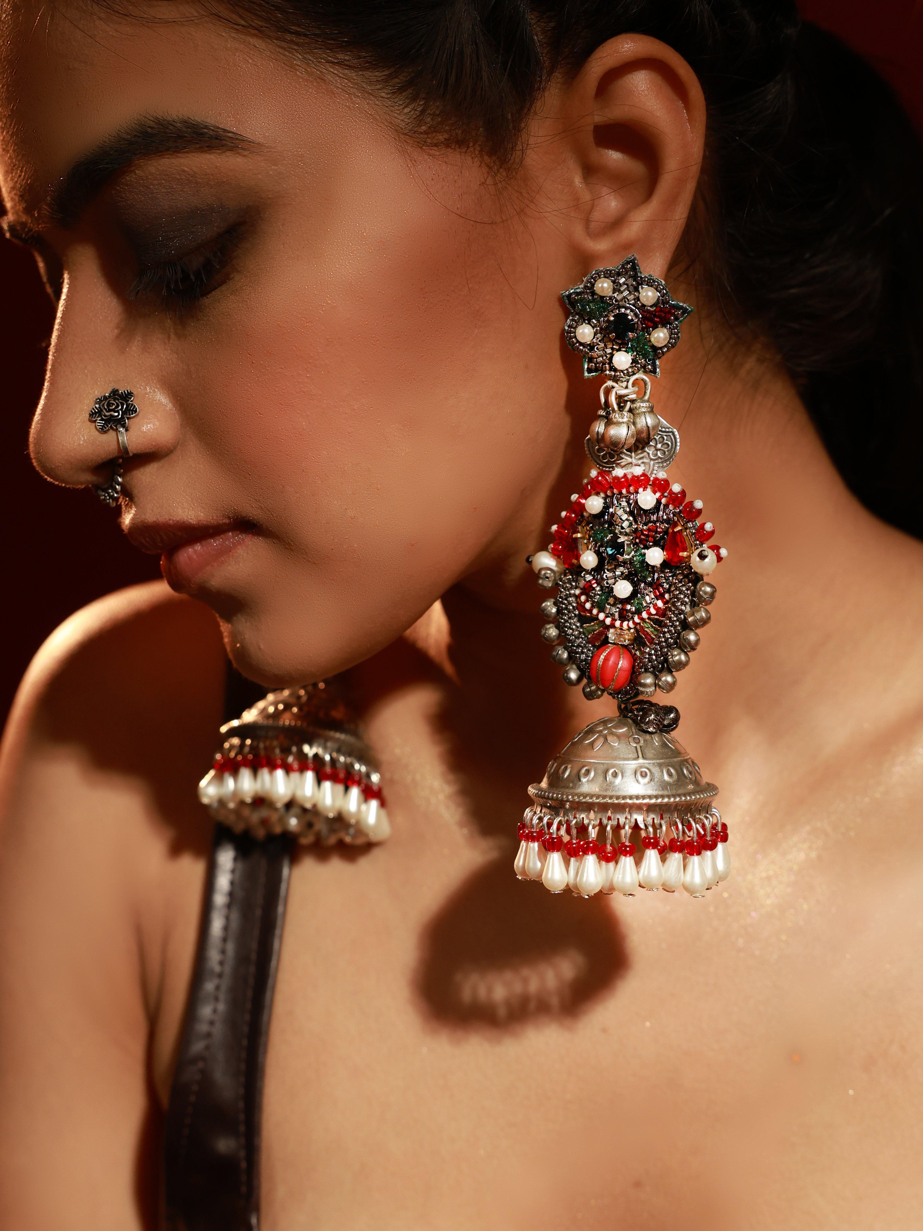 Introducing the Tara Silver Embellished Jhumka, a stunning piece of handcrafted jewelry that truly stands out. Each jhumka features intricate metallic charms, vibrant beads, and delicate stones, all beautifully adorned with pearls. What makes these earrings truly unique is the exquisite hand embroidery complemented by eye-catching 3D embellishments. Perfect for special occasions or to elevate your festive look, the Tara Jhumka combines traditional craftsmanship with modern elegance, making it a must-have addition to any jewelry collection.
