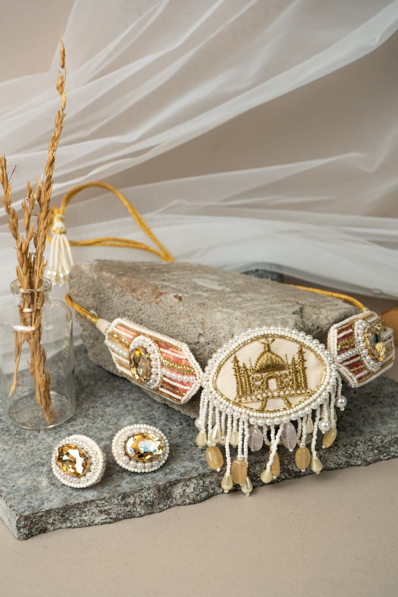 The Taj (Necklace set with studs) Our collection Mehfil Represents the Mughal Era the taj mahal is known as a movement of love and grieving emperors’ ode to his beloved deceased queen. Pastel flowers and subtle base with zardozi hand embroidered taj is the beautiful peace one can add in there jewellery wardrobe lustrous.Oval-shaped, crystal studs with pearls surrounded on the sides.