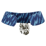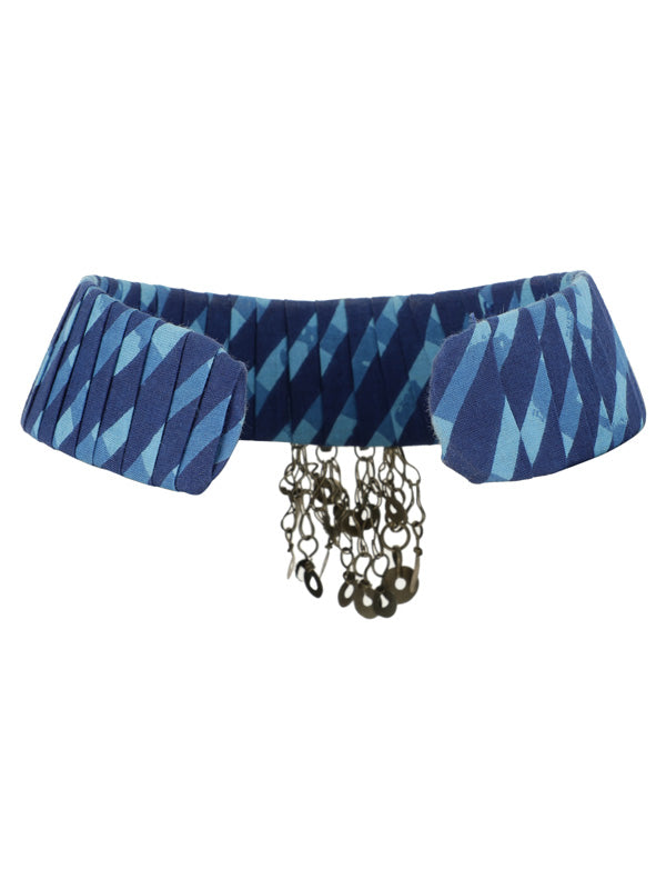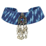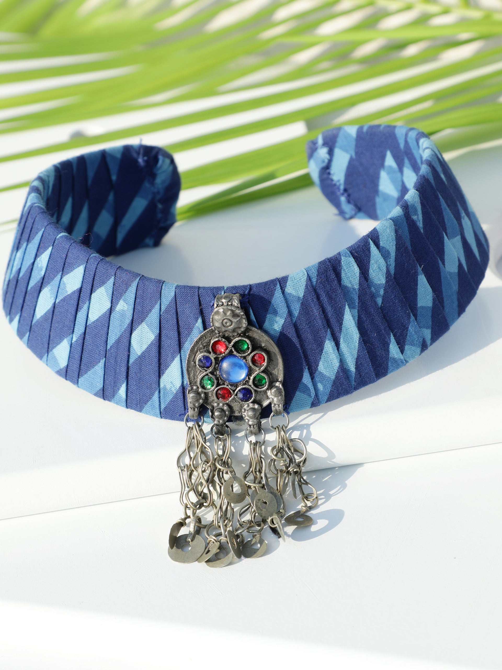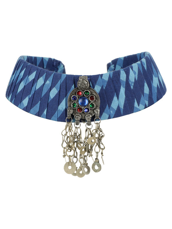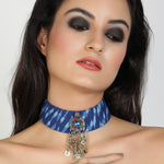 Tribe neckpiece Is an uniquely handcrafted neckpiece which is designed with metal base wrapped with leheria fabric which is mainly practiced in Rajasthan using tie and dye technique and top part is embellished with antique old tribe coin in centre.