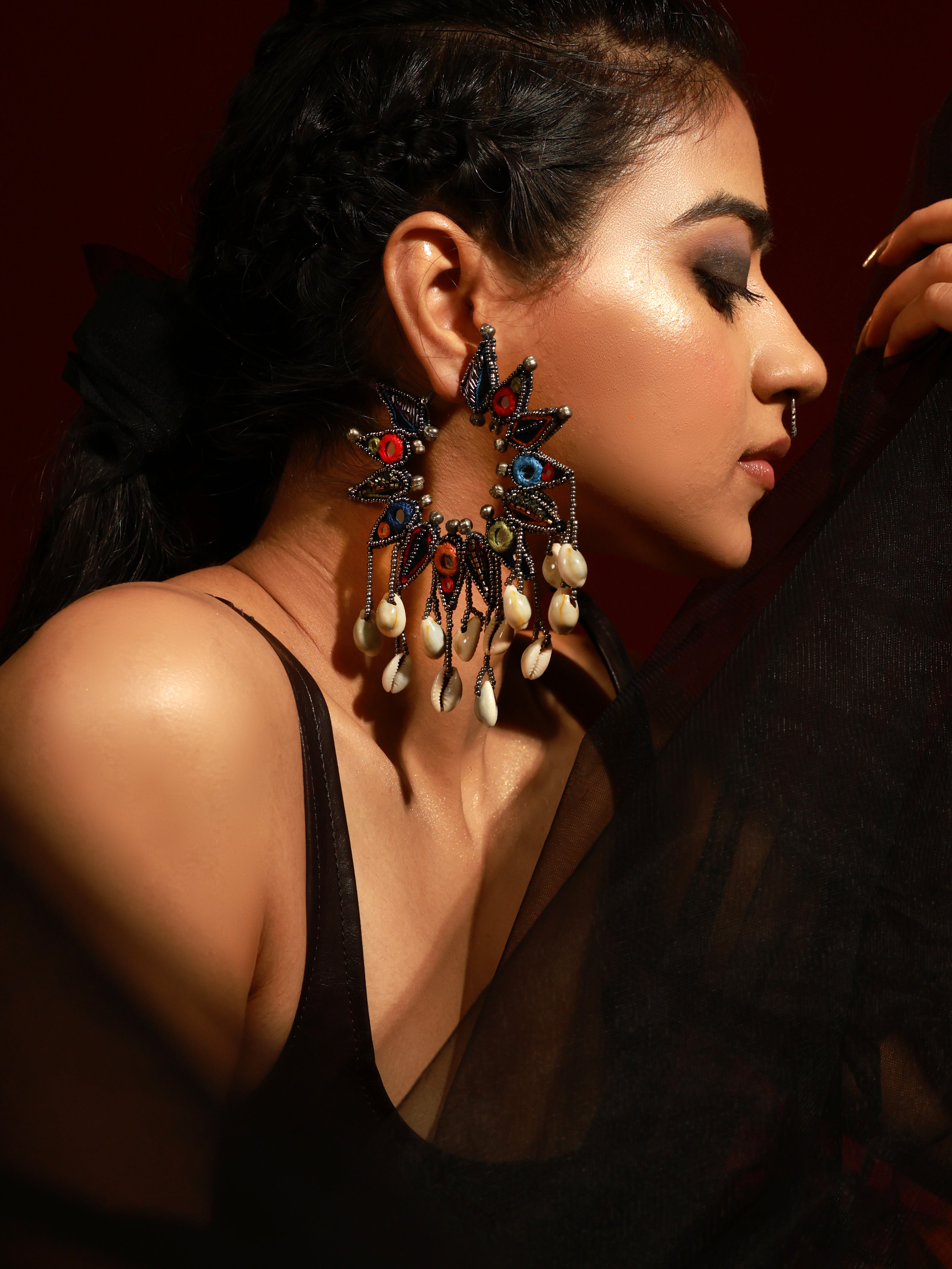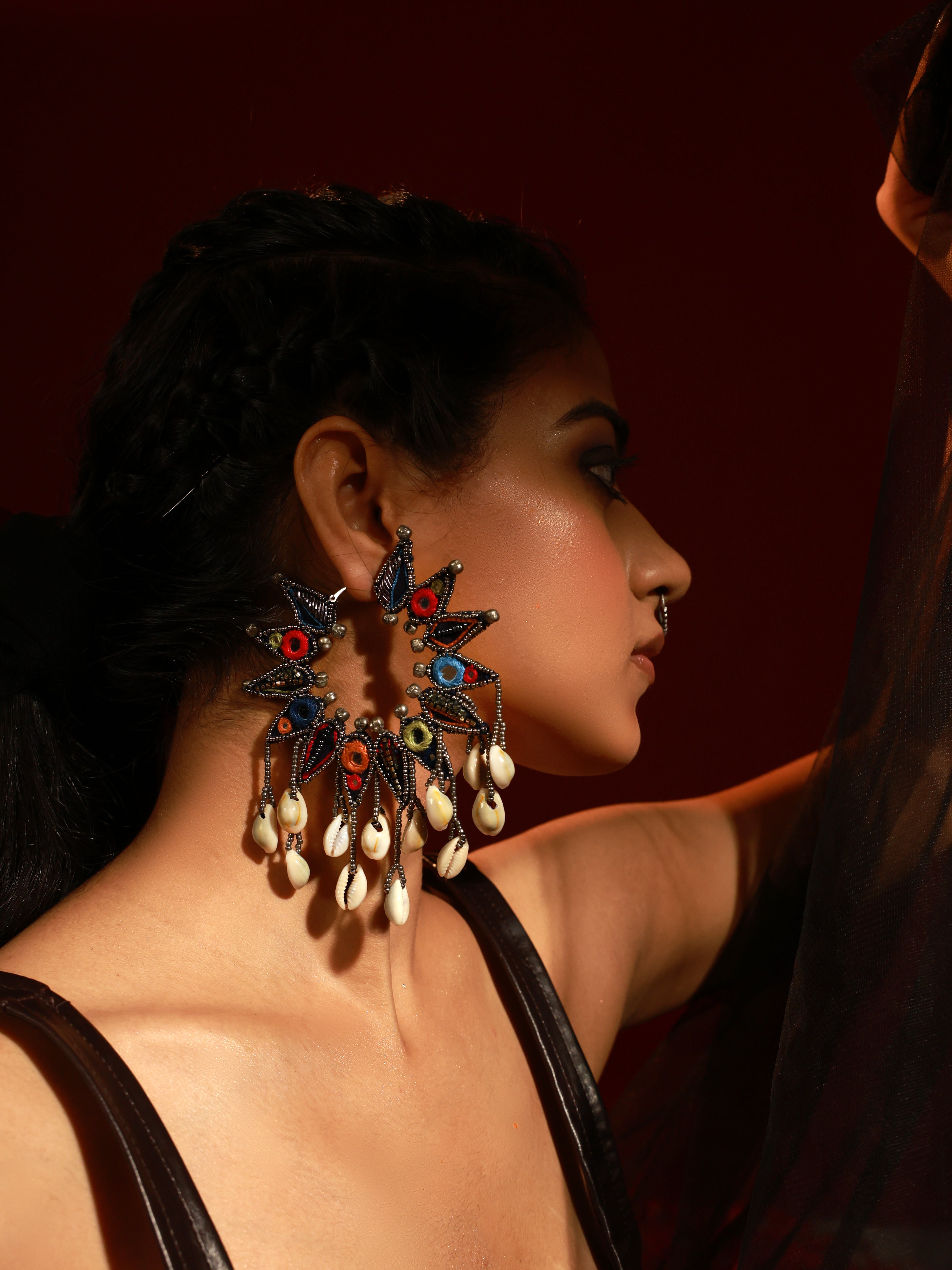 Tribe hoop in dark blue colour inspired from sword shaped embellished with mirrors with double sided work moulded with modern shape of hoop in Indian artistry handcrafted inspired from the spike , swords tribals have to guard themselves . Wearing a piece art is all you need to make statement .