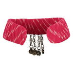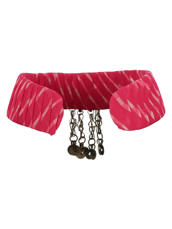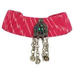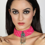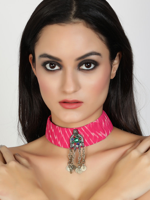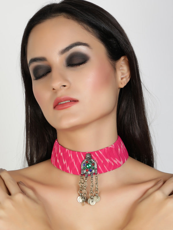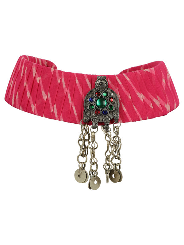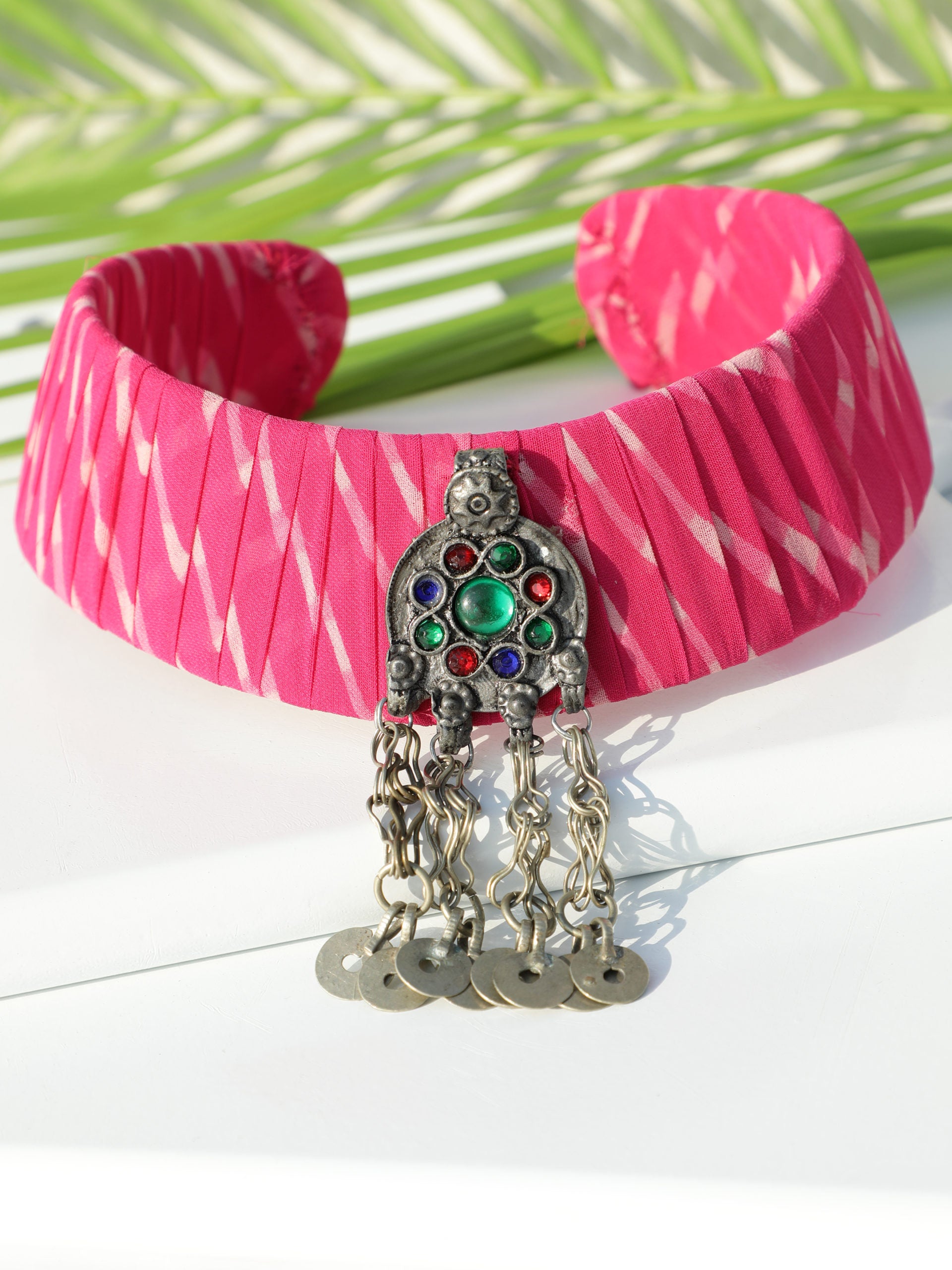Tribe neckpiece Is an uniquely handcrafted neckpiece which is designed with metal base wrapped with leheria fabric which is mainly practiced in Rajasthan using tie and dye technique and top part is embellished with antique old tribe coin in centre.