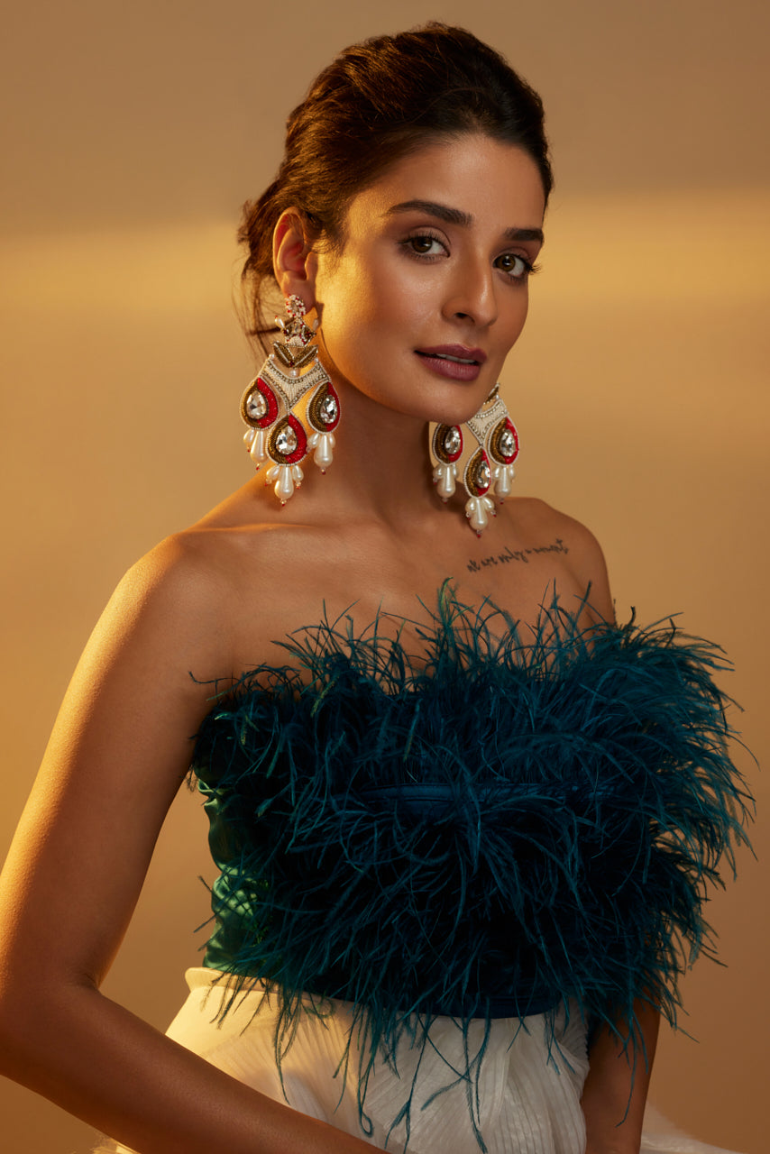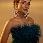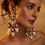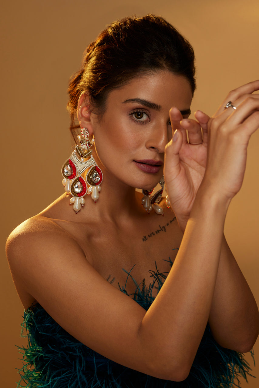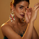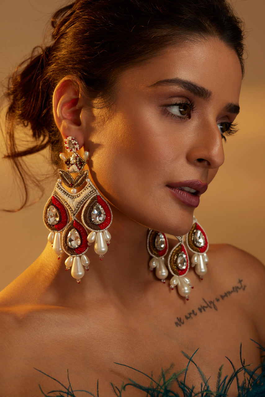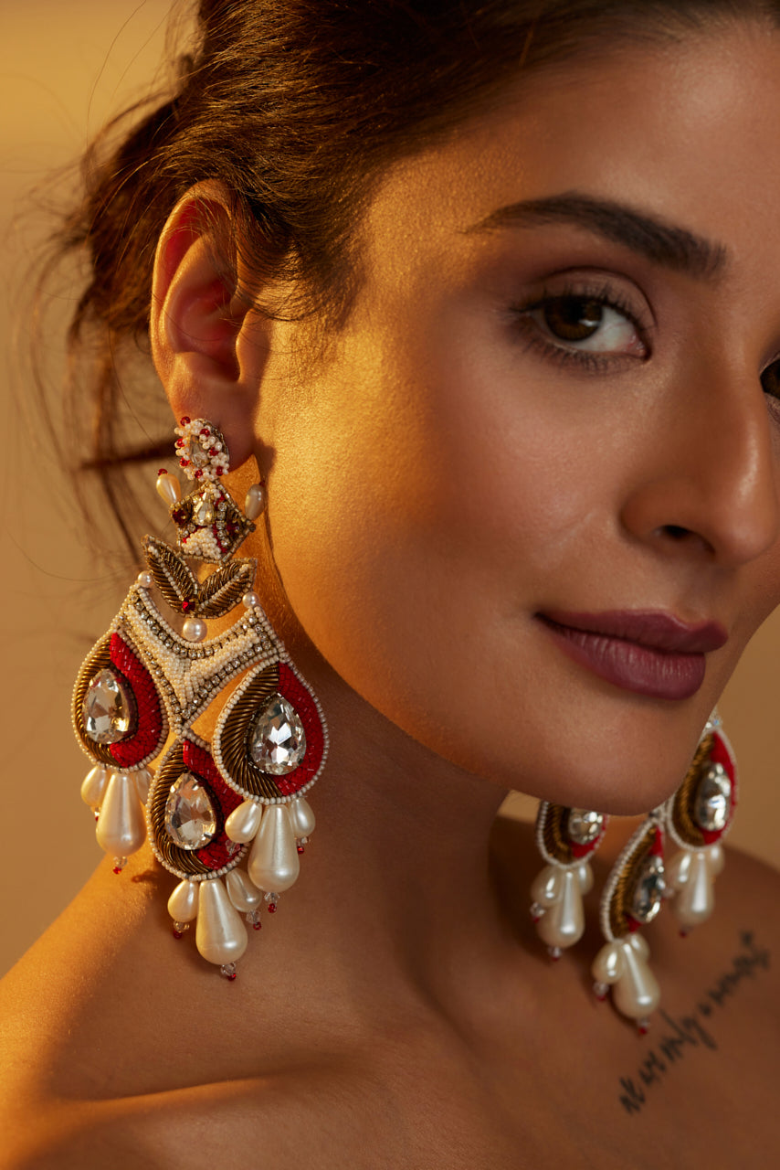 Victoria Red Chandelier Danglers featuring pear drop shaped high-quality lustrous crystals surrounded with hand embroidered metal and glass cut beadwork in red embellished with multi-shaped stones pearls and perfect for any look.