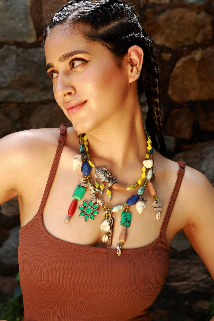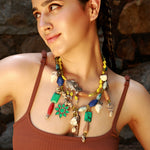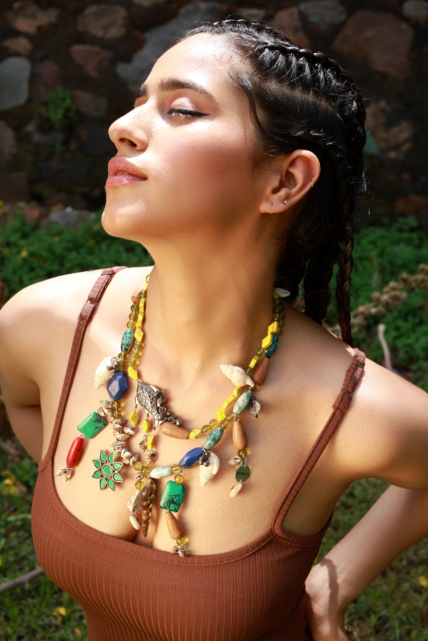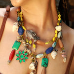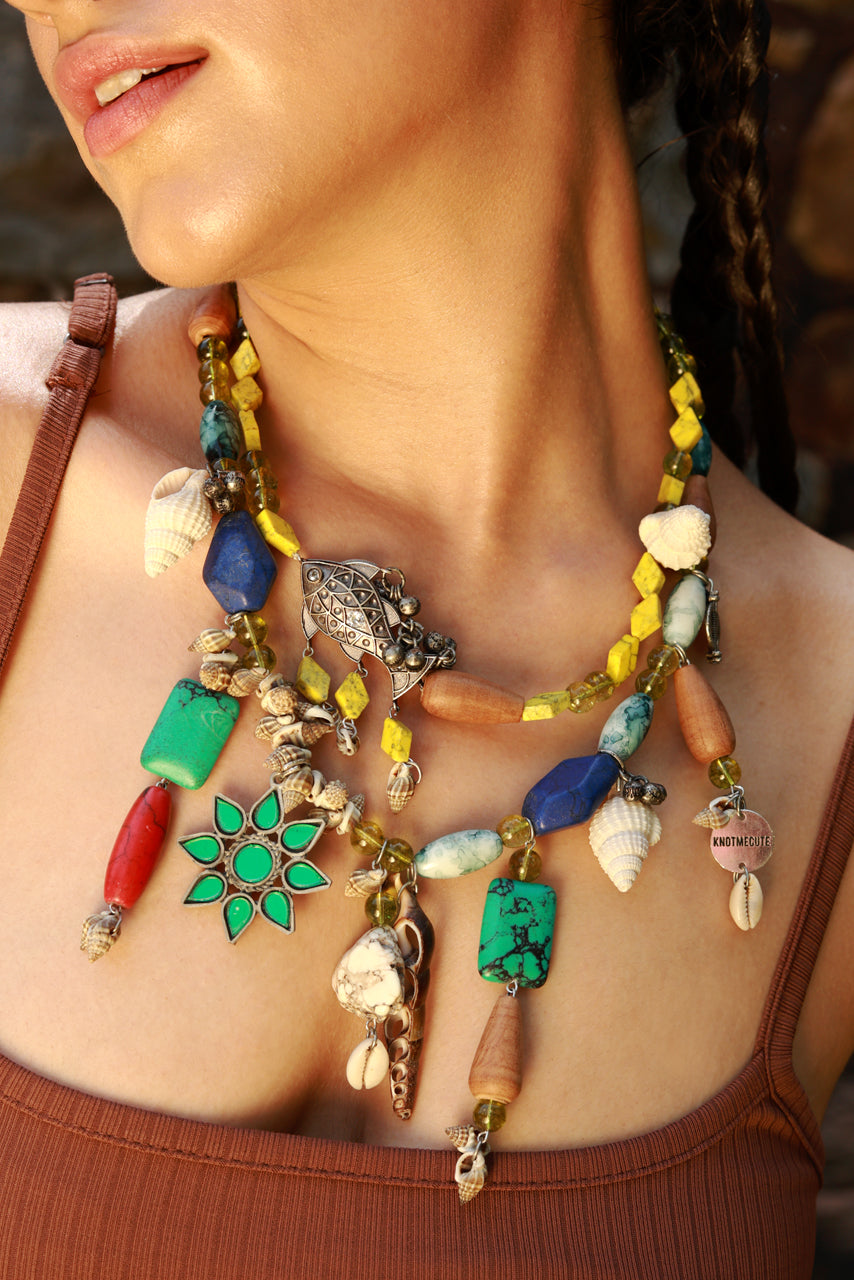 Blend of colors, nature, and coastal energy — the Wander Bloom Necklace is a handcrafted medley of chunky stones, tribal charms, cowrie shells, and boho motifs. Strung together with pops of mustard yellow, turquoise, coral, and wood, this necklace is a celebration of wild hearts and marine life.