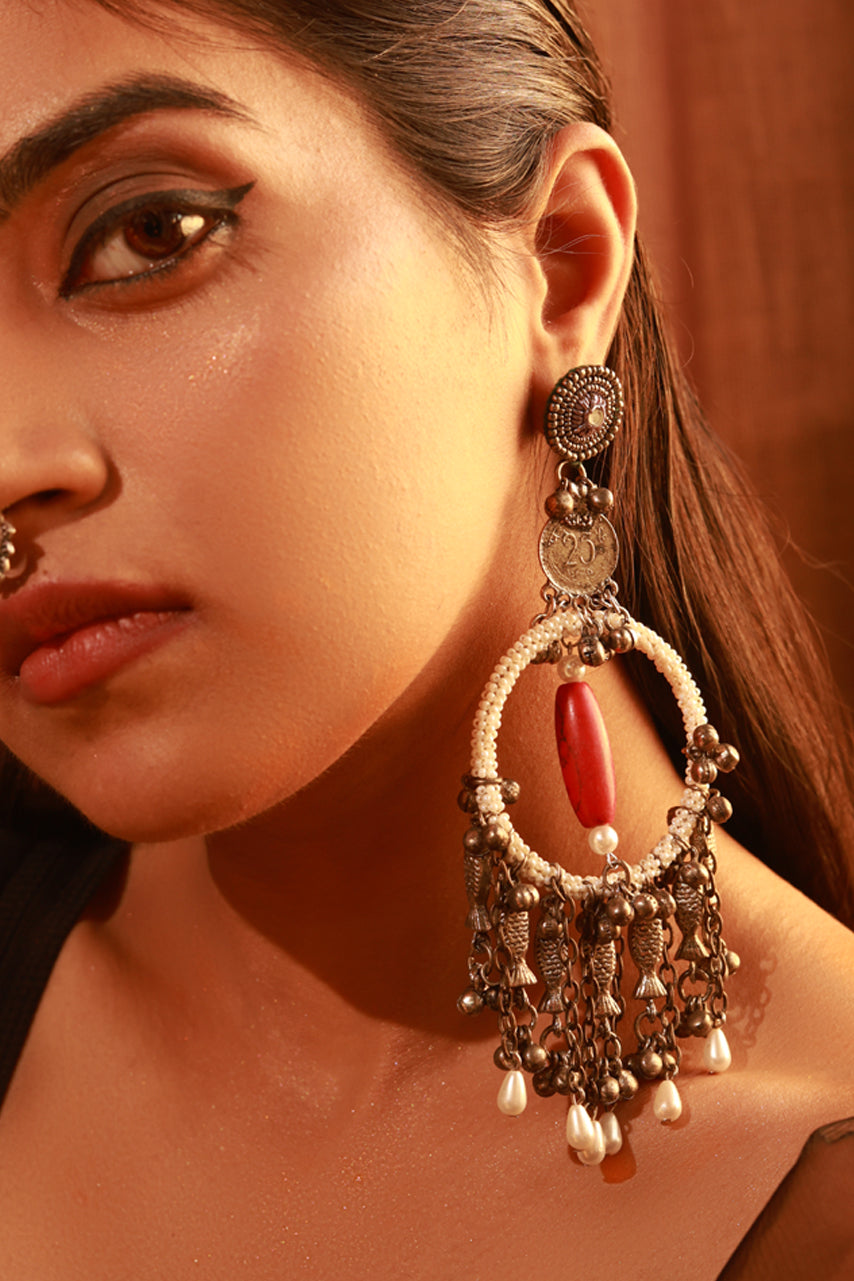 Handcrafted afghan inspired chandbalis shop for this festive season , with pearl and metal charms detailing.