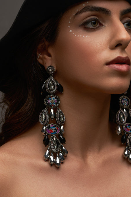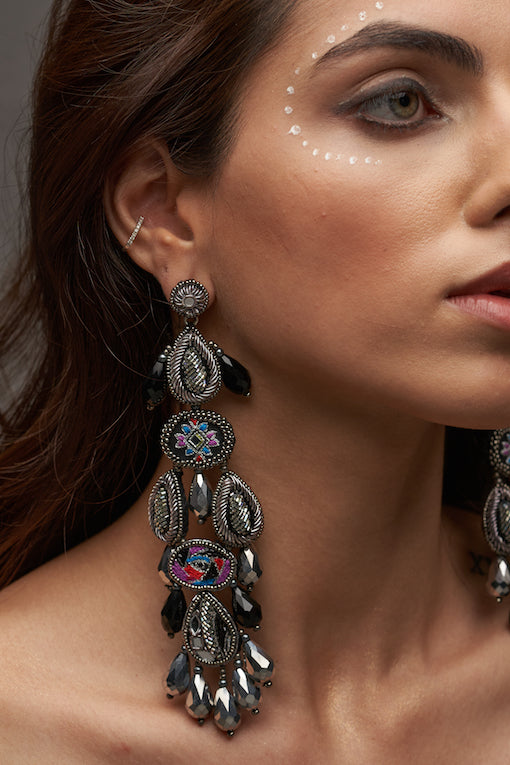 Zisha long silver handcrafted Earrings on textile base which is Inspired by the tribal elements , metal embellishments , silver lustrous metallic crystals at the bottom with complementing mettalic glassbead work which makes it different and statement earrings for any occasion