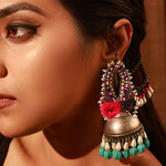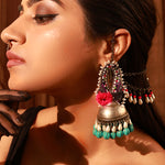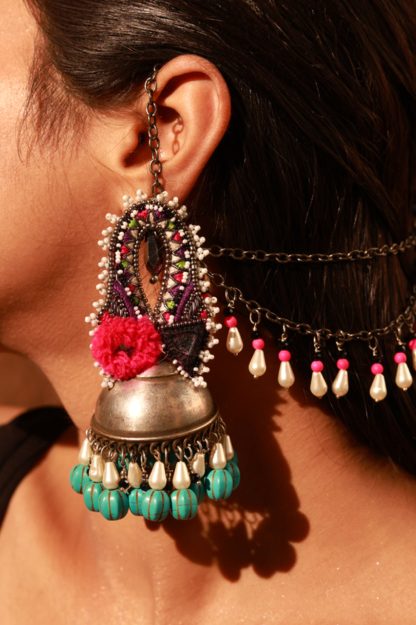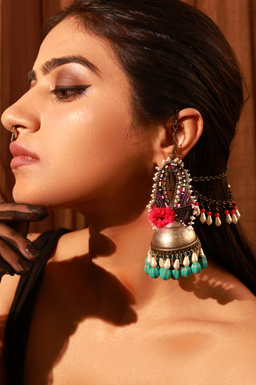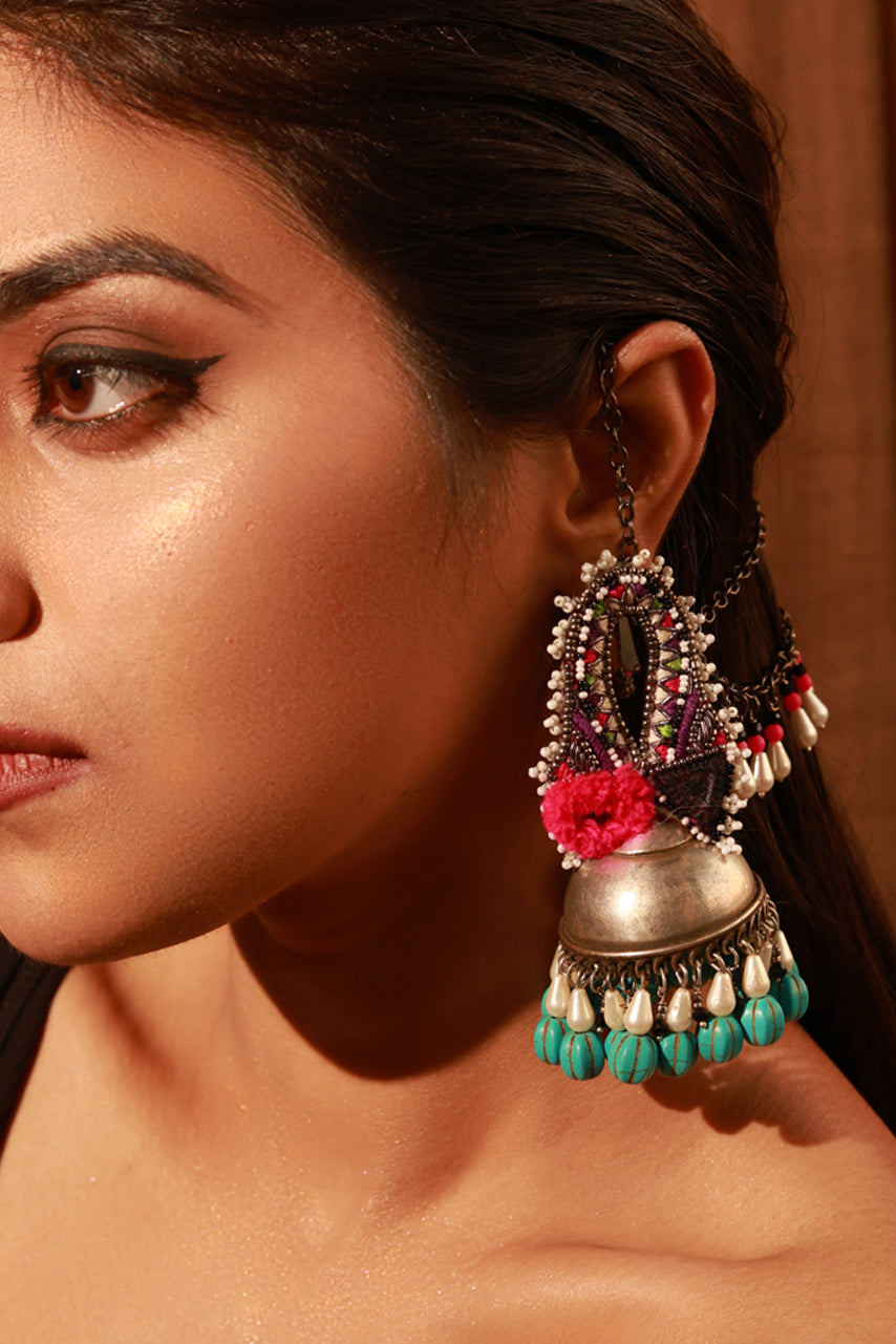 Inayra jhumka is handcrafted colourful Jhumka specially hand embroidered with minute details and mirrorwork , with beaded work all around and to complement antique finished brass jhumka is attached with vintage finish natural stones in feroza colour .