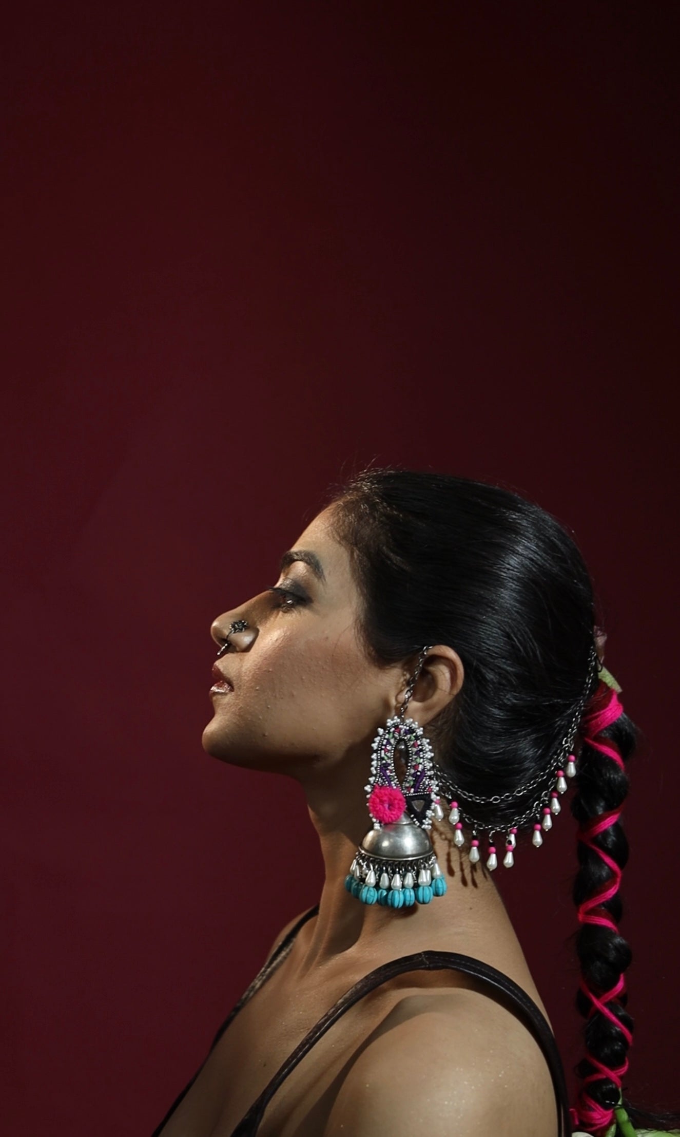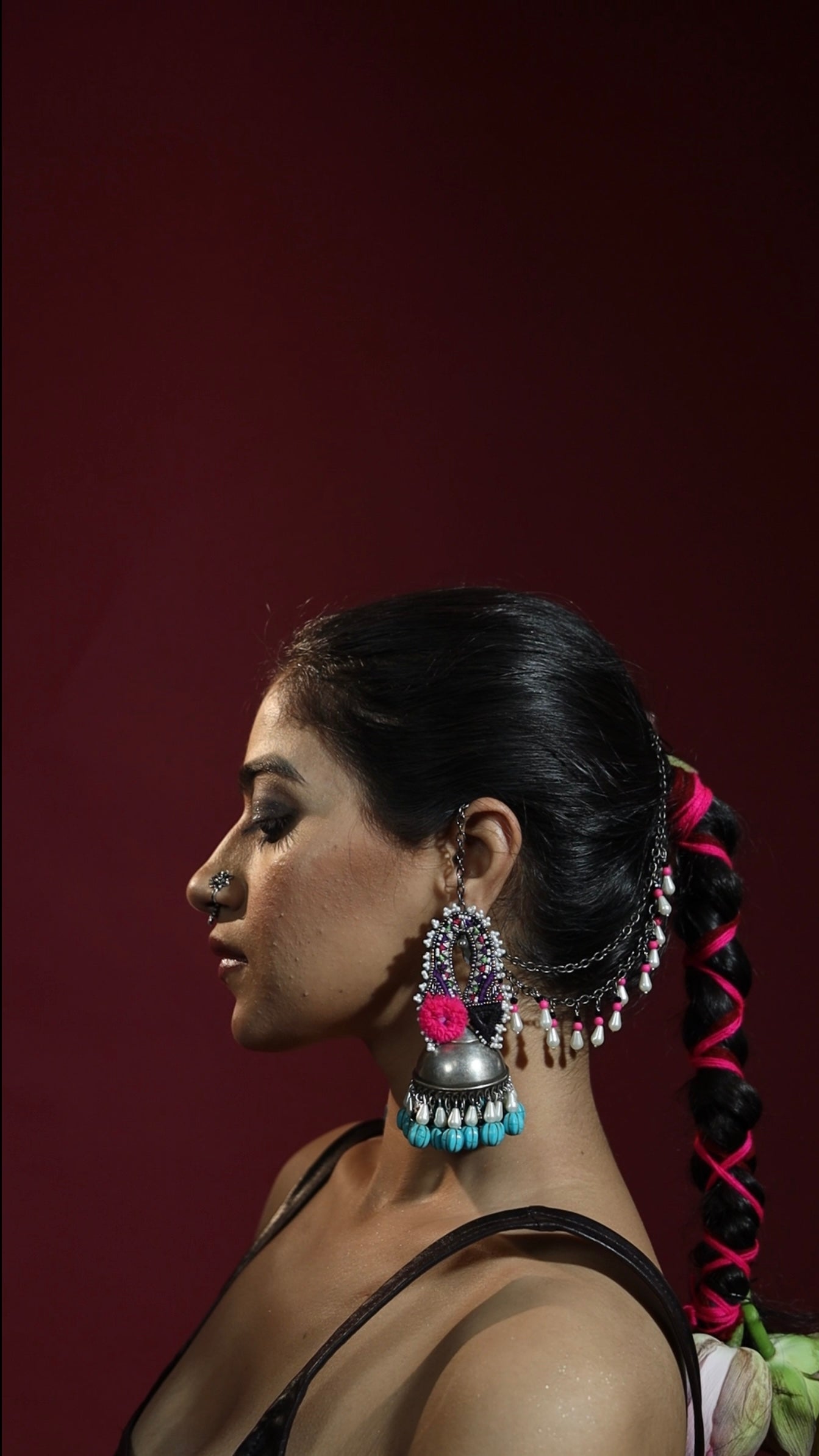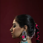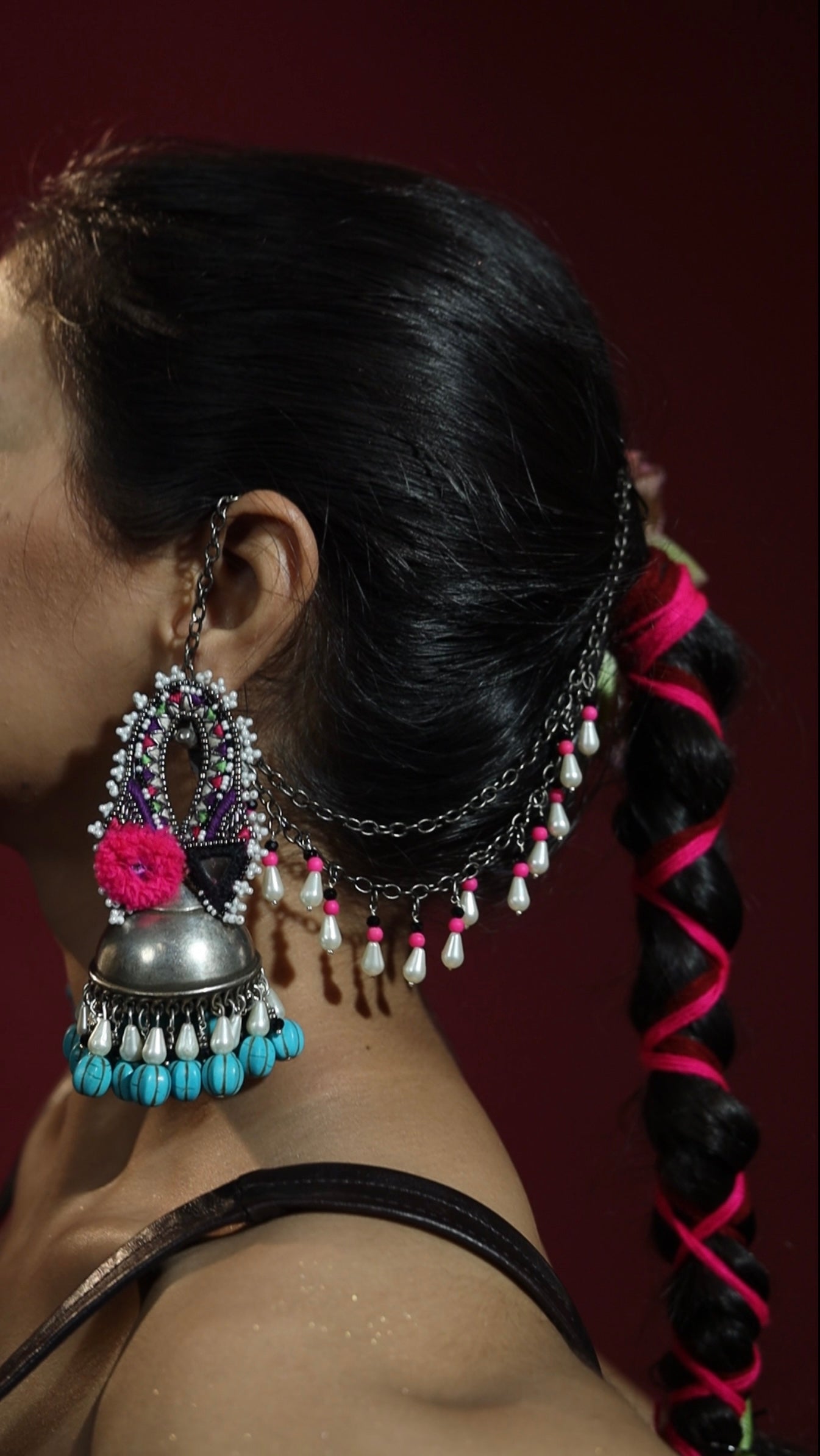 Inayra jhumka is handcrafted colourful Jhumka specially hand embroidered with minute details and mirrorwork , with beaded work all around and to complement antique finished brass jhumka is attached with vintage finish natural stones in feroza colour .